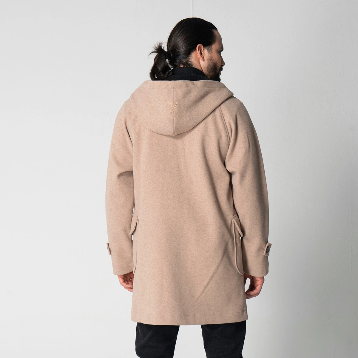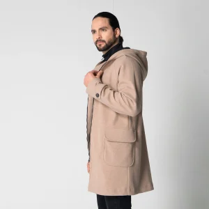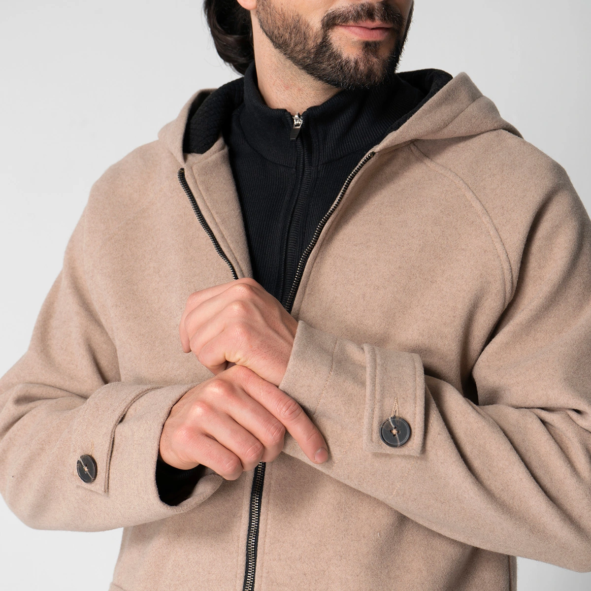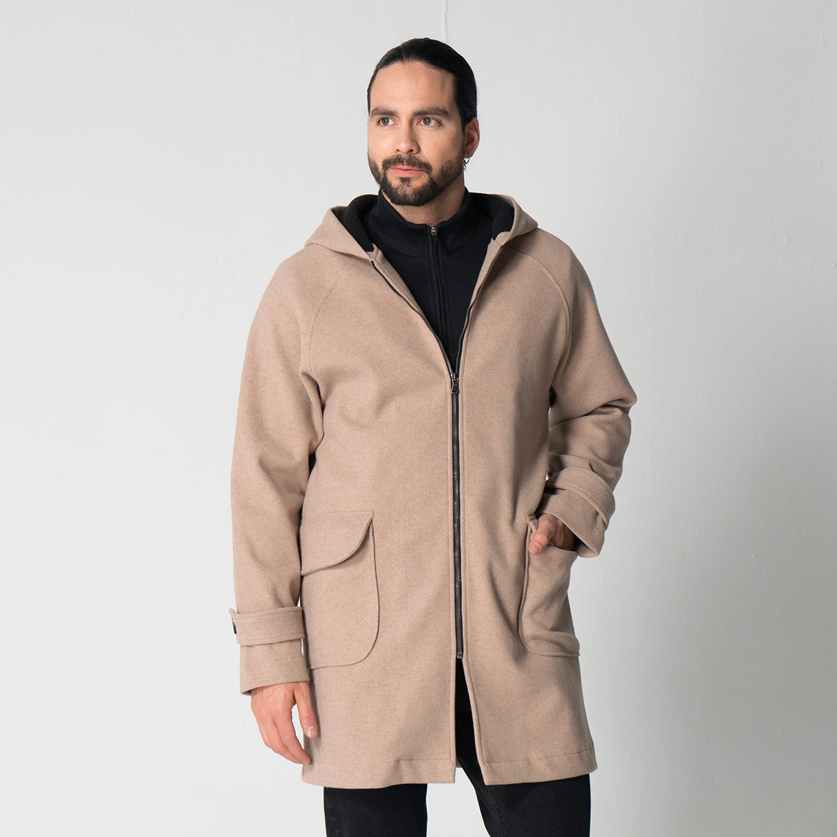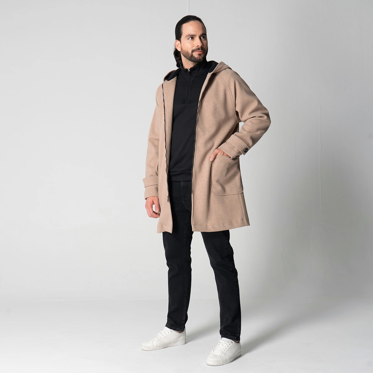 Abrigo Malcolm en paño silueta regular que ofrece un ajuste cómodo y versátil. Cuenta con un elegante cuello redondo acompañado de una capota que añade estilo y protección adicional. Sus mangas largas están rematadas con puños adornados con portañuelas y botones decorativos, aportando un toque de detalle a su diseño. En la parte frontal, dispone de bolsillos tipo parche curvos, ideales para llevar pequeños objetos o simplemente para mayor comodidad. El sistema de cierre del abrigo es de cremallera, lo que facilita su uso y proporciona un acabado moderno y funcional.
