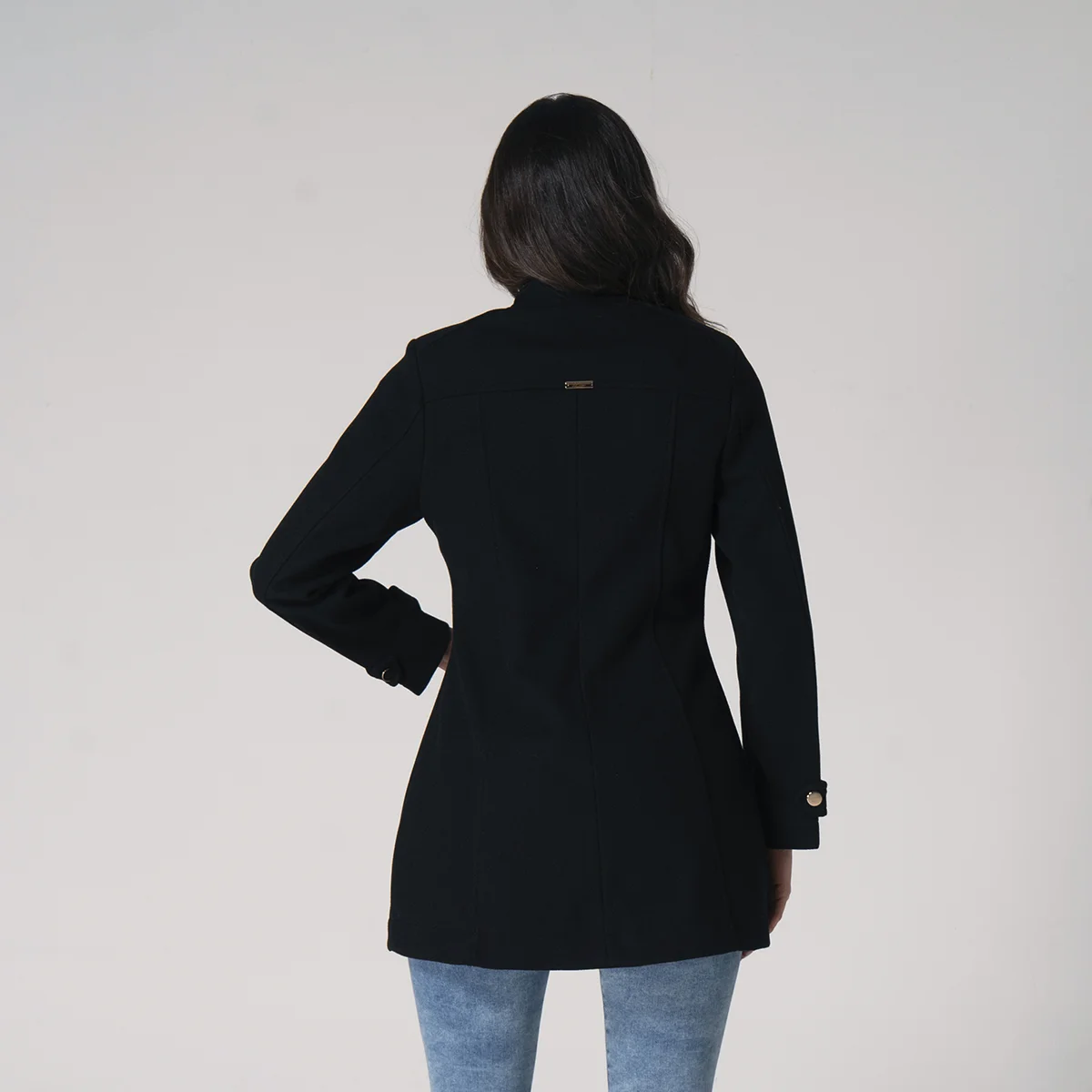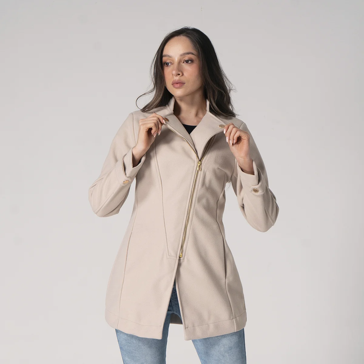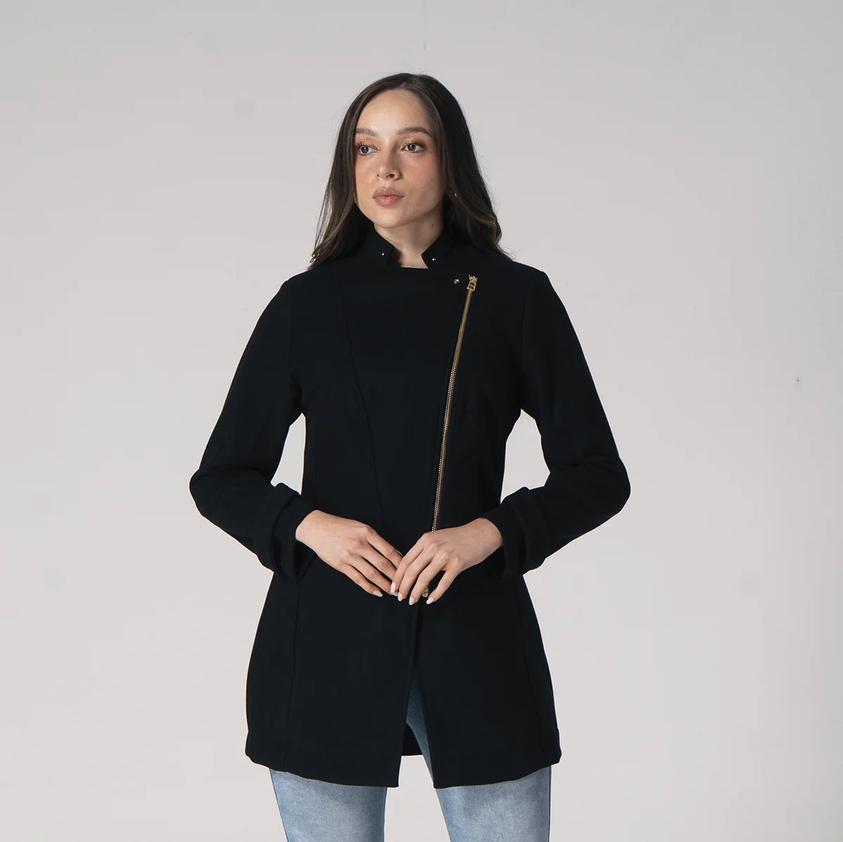 Abrigo Walker en paño silueta Slim que realza la figura, ideal para un estilo elegante y moderno. Su cuello tipo Néru y la solapa cruzada aportan un toque sofisticado y distintivo. Las mangas largas están decoradas con detalles de charretera añadiendo un elemento de estilo clásico y refinado. En la parte frontal, cuenta con bolsillos internos en corte, perfectos para mayor funcionalidad y comodidad. El sistema de cierre es de cremallera, ofreciendo facilidad y seguridad al usarlo. En la parte posterior, presenta una almilla y cortes de entalle que realzan la forma y proporcionan un ajuste cómodo y estilizado. Este abrigo para mujer es una pieza versátil y elegante para complementar tu guardarropa en temporadas frías.
