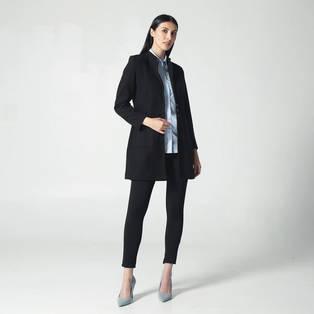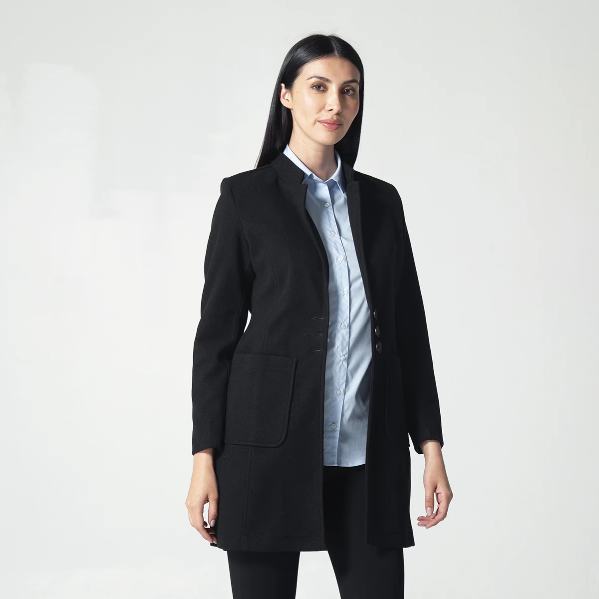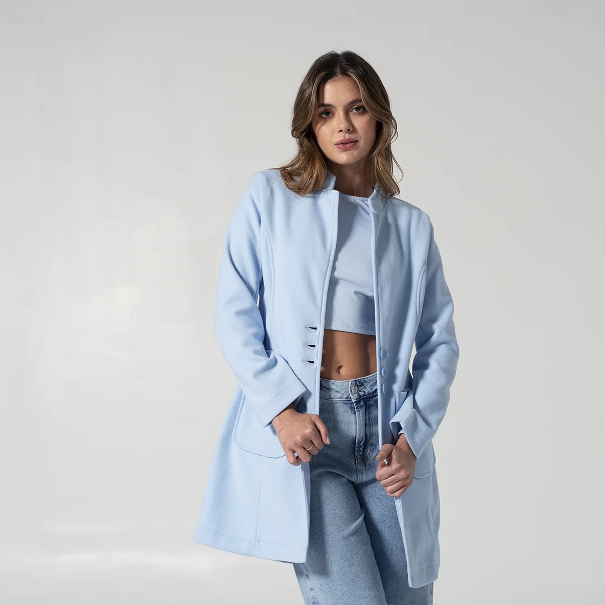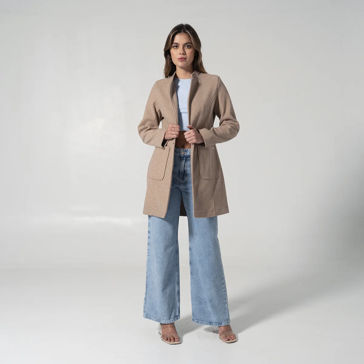 Abrigo Gansta confeccionado en paño, ofreciendo una apariencia moderna y resistente su silueta Slim realza la figura proporcionando un ajuste estilizado, El cuello tipo neru y la solapa aportan un toque clásico y sofisticado, mientras que las mangas largas aseguran comodidad y protección contra el frío. En la parte frontal, cuenta con bolsillos tipo parche curvos que añaden funcionalidad y un estilo casual, El sistema de cierre de botonadura brinda facilidad de uso y un acabado elegante. Además, en la parte posterior presenta cortes de entalle que realzan la silueta y aportan un diseño contemporáneo y dinámico. Este abrigo para mujer combina estilo urbano con detalles que garantizan comodidad y tendencia.