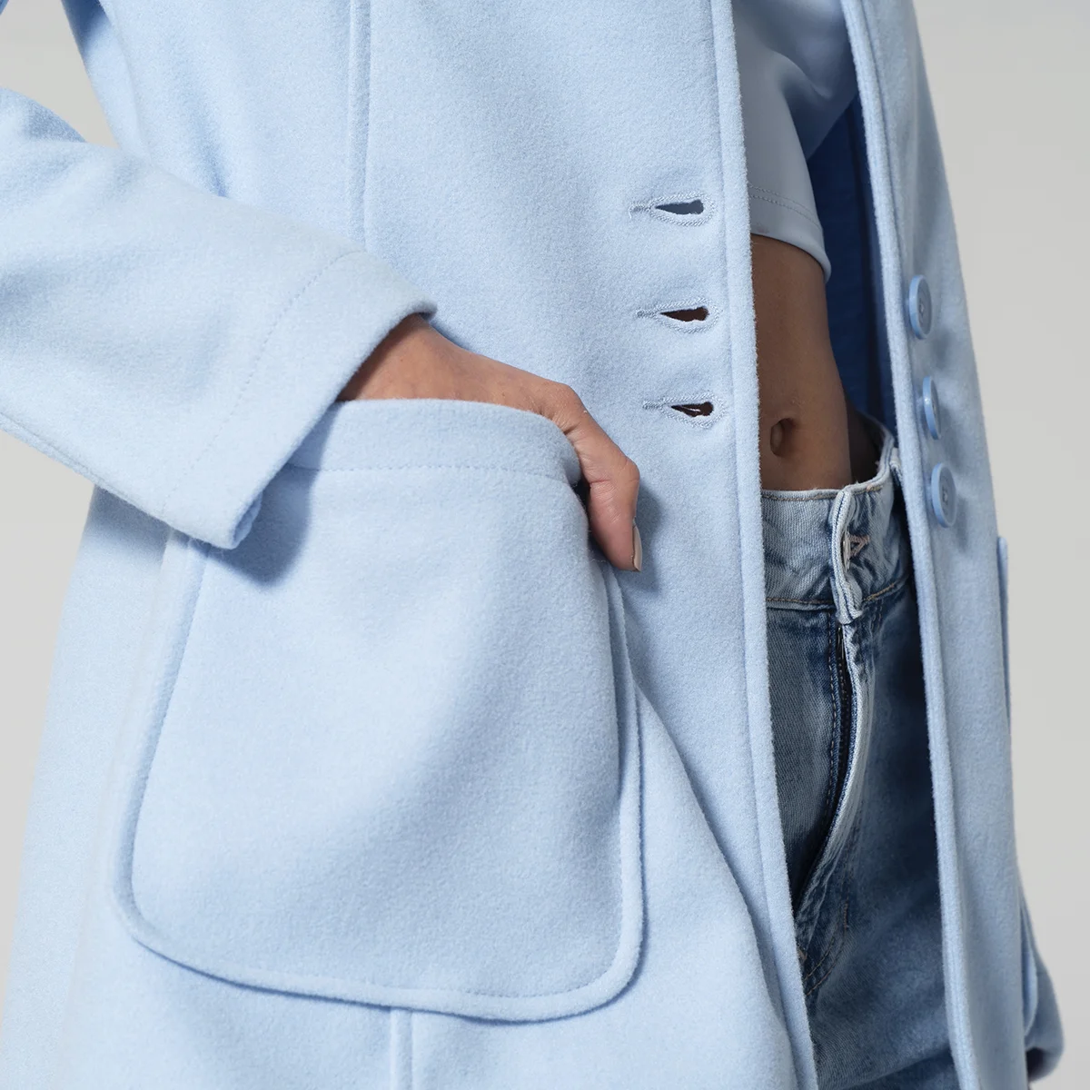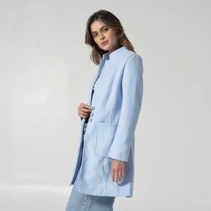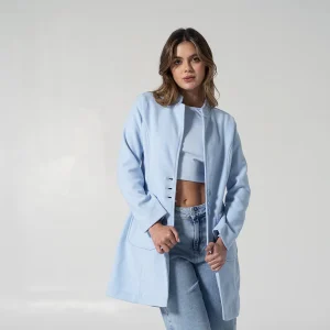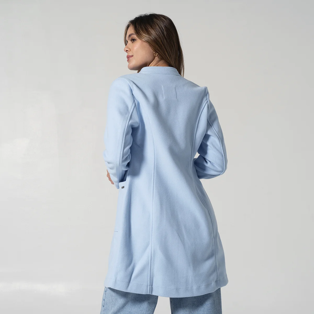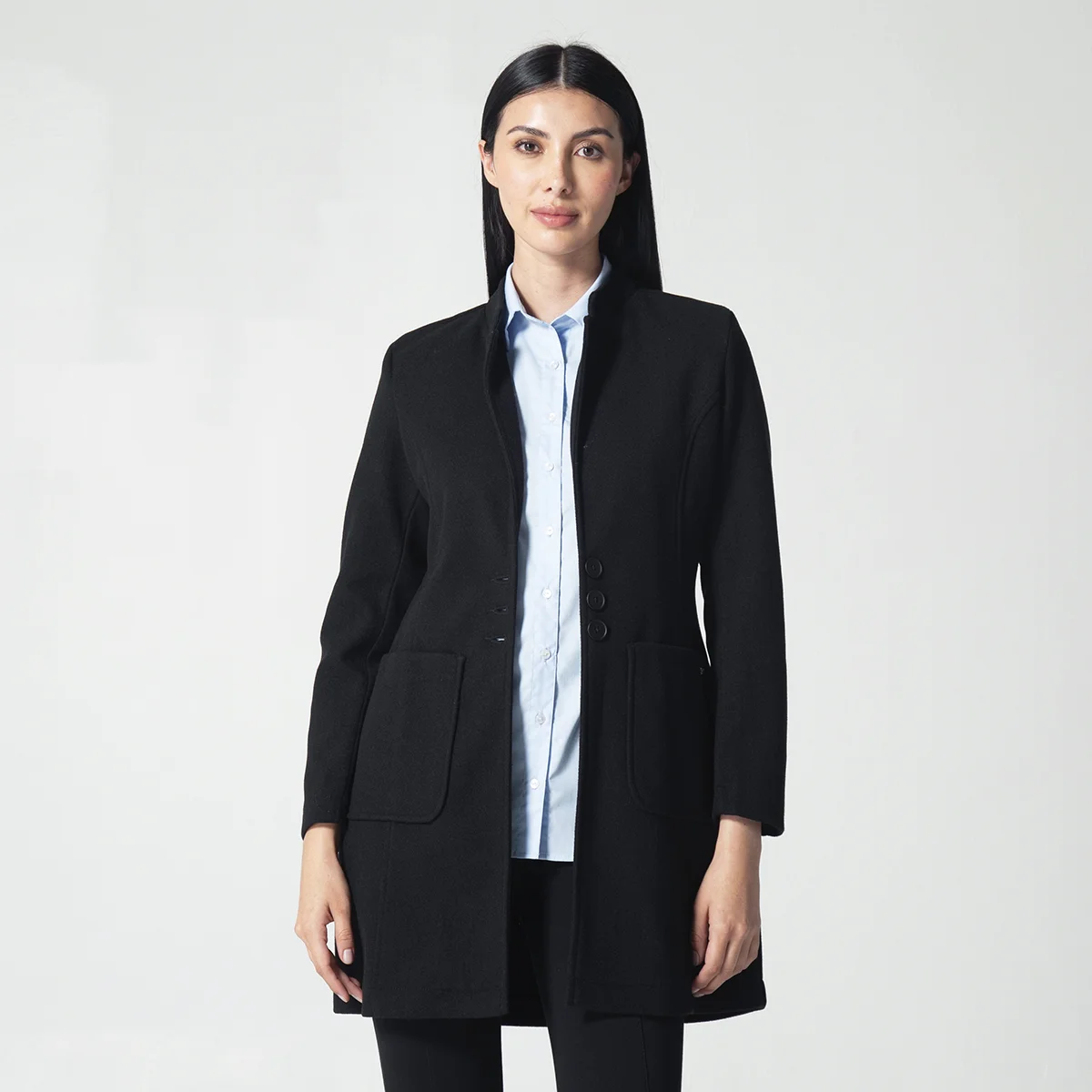 Abrigo Gansta confeccionado en paño, ofreciendo una apariencia moderna y resistente su silueta Slim realza la figura proporcionando un ajuste estilizado, El cuello tipo neru y la solapa aportan un toque clásico y sofisticado, mientras que las mangas largas aseguran comodidad y protección contra el frío. En la parte frontal, cuenta con bolsillos tipo parche curvos que añaden funcionalidad y un estilo casual, El sistema de cierre de botonadura brinda facilidad de uso y un acabado elegante. Además, en la parte posterior presenta cortes de entalle que realzan la silueta y aportan un diseño contemporáneo y dinámico. Este abrigo para mujer combina estilo urbano con detalles que garantizan comodidad y tendencia.