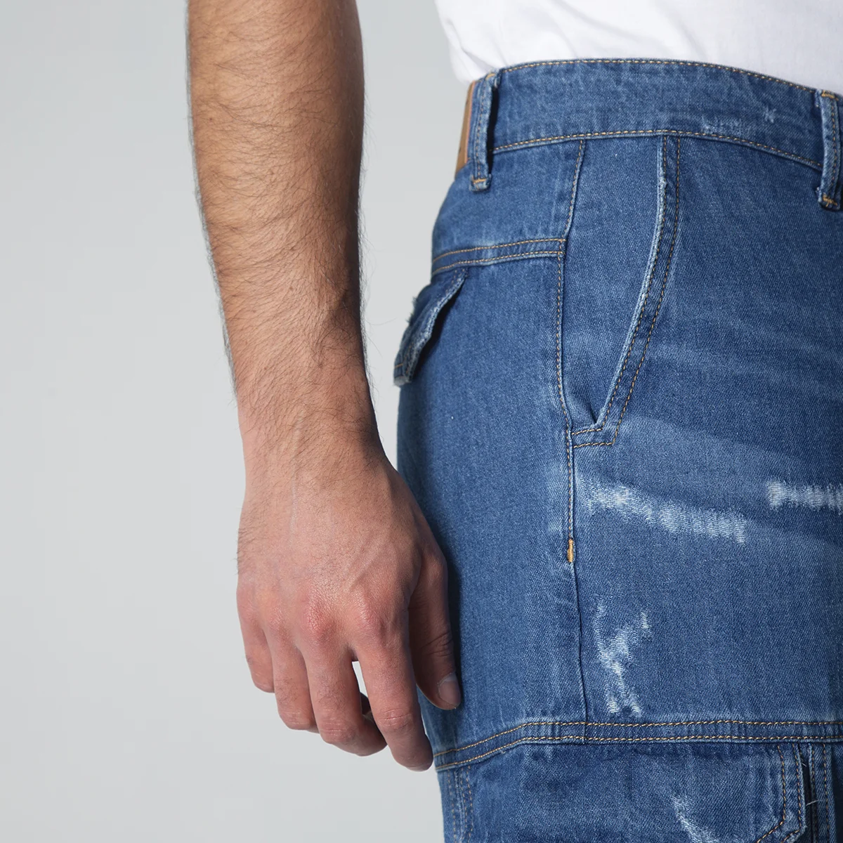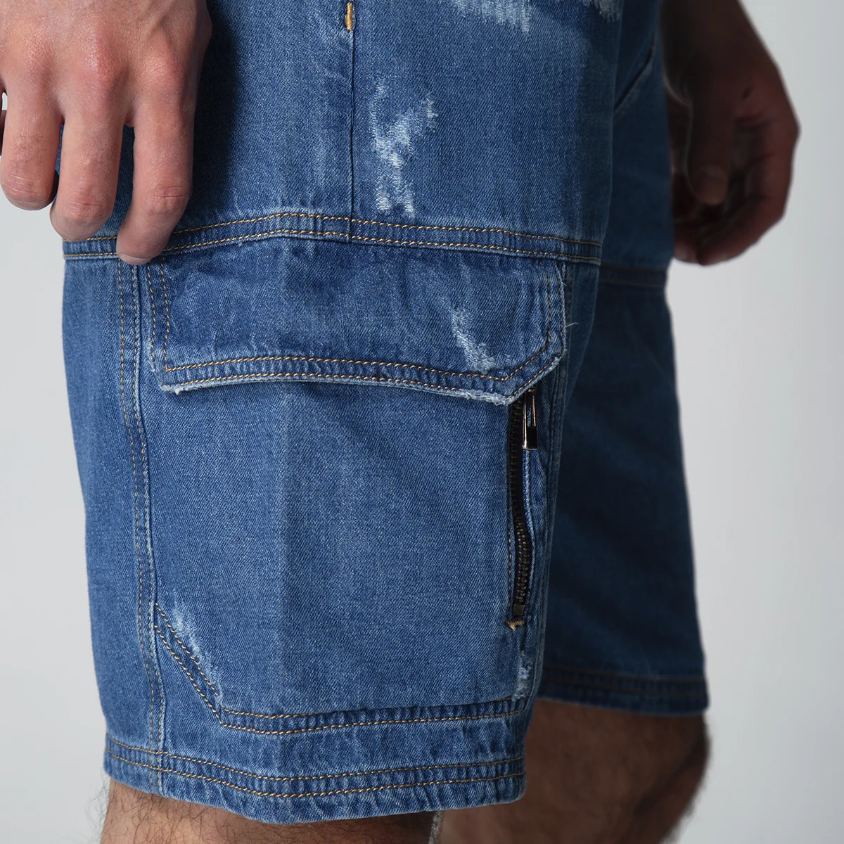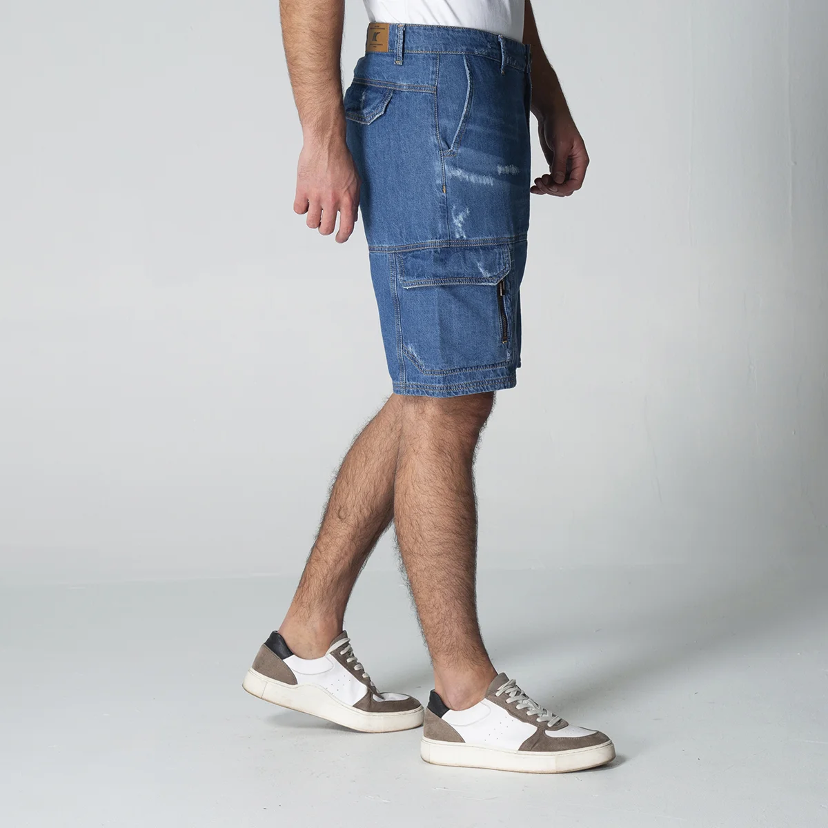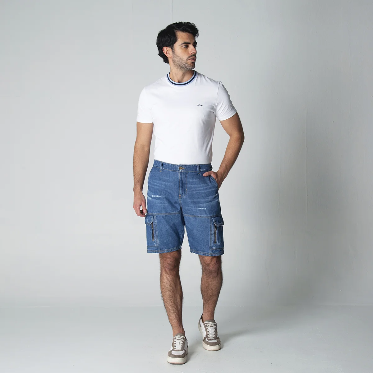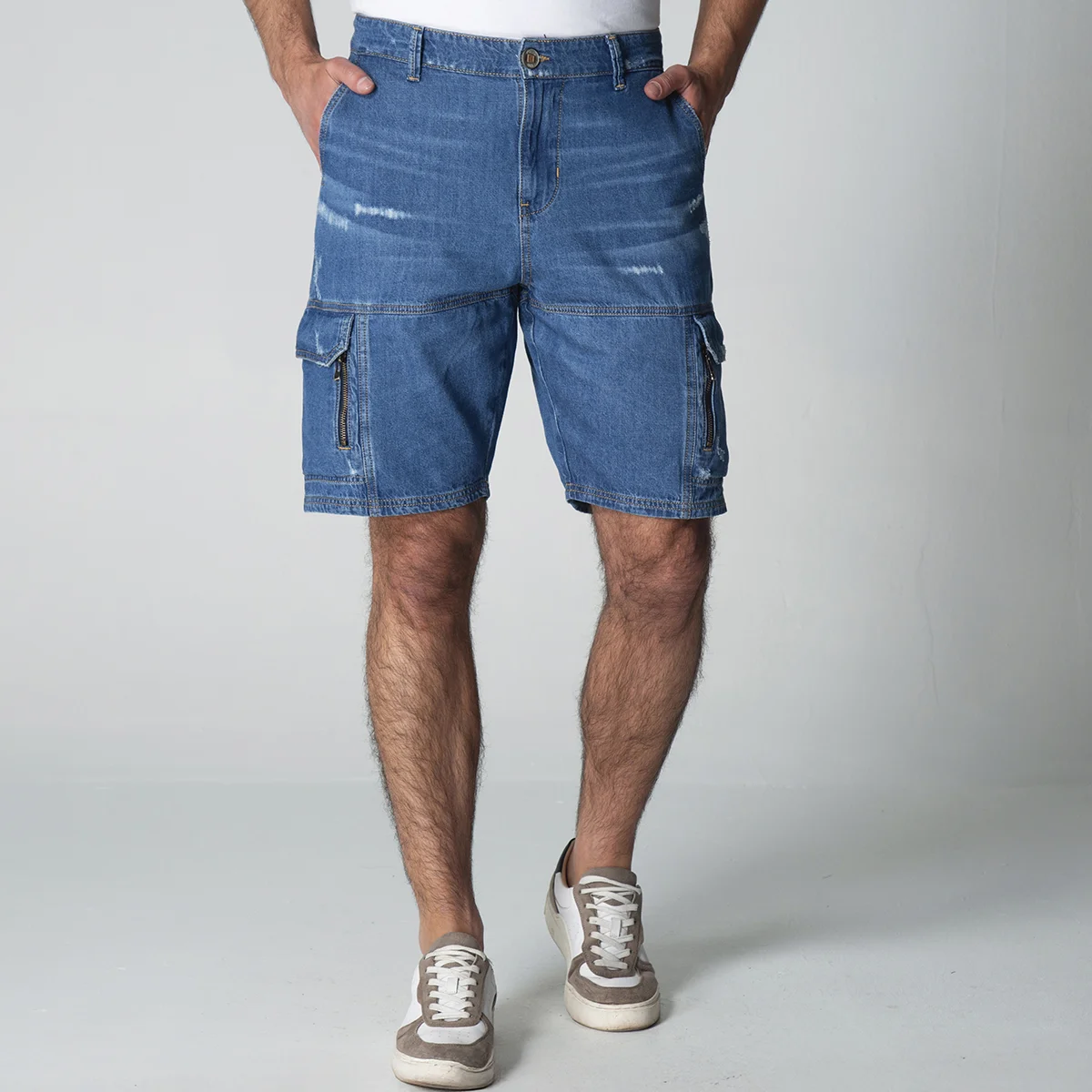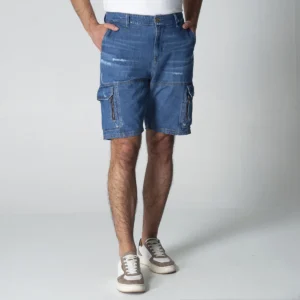 Bermuda Party diseñada en denim para el hombre moderno que valora la funcionalidad y el estilo casual, Confeccionada con una pretina de cierre de un solo botón, esta prenda destaca por su capacidad de almacenamiento: incorpora amplios bolsillos cargo laterales con tapas para guardar tus esenciales de forma segura. Además, añade un toque atrevido con detalles de cremalleras decorativas.