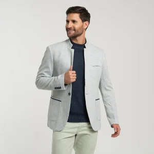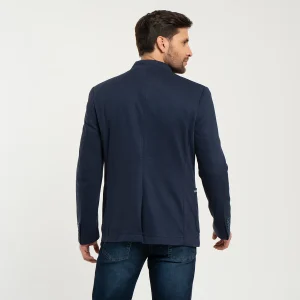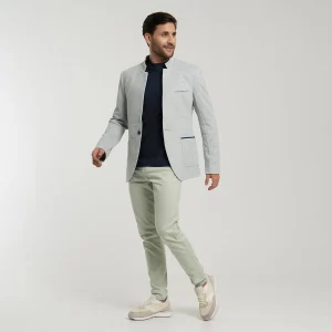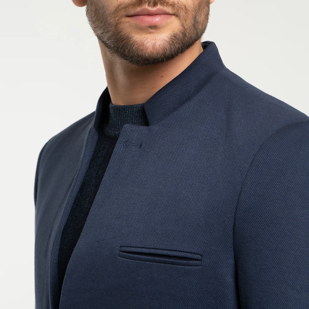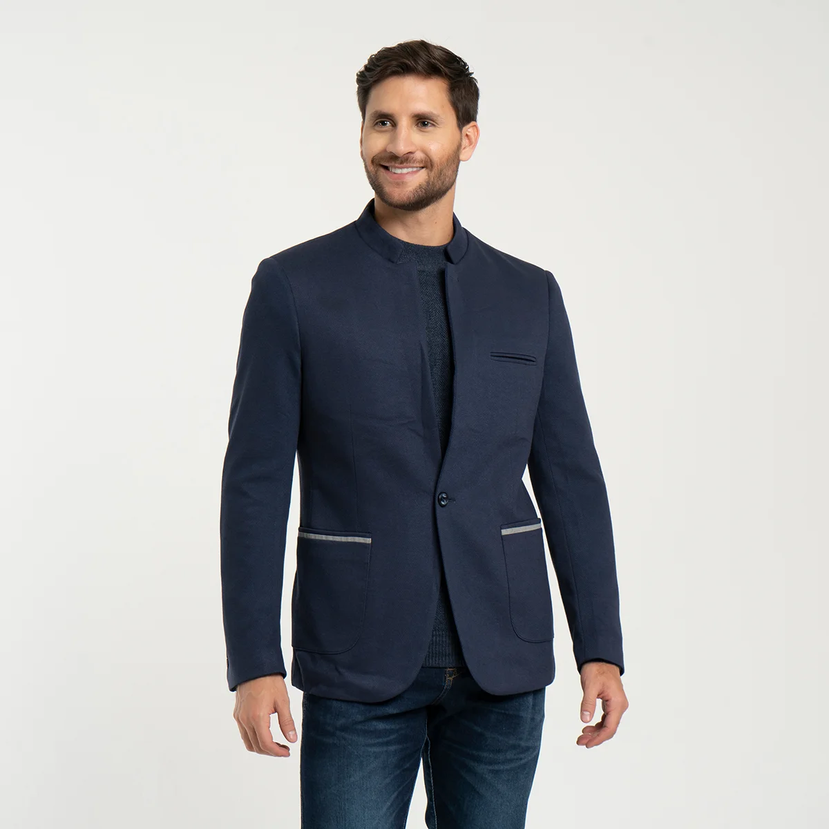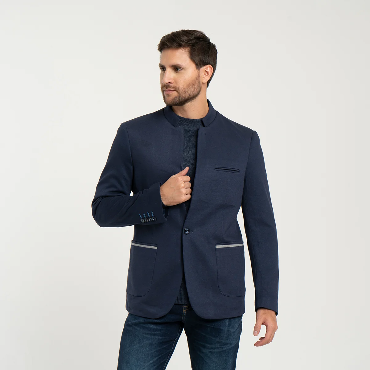 Blazer para hombre, con cuello alto, cuenta con tres bolsillos, uno en la parte superior izquierdo tipo ribete, y dos bolsillos tipo parche curvos con detalles decorativos en contraste, este diseño cuenta cierre frontal de un solo botón central.