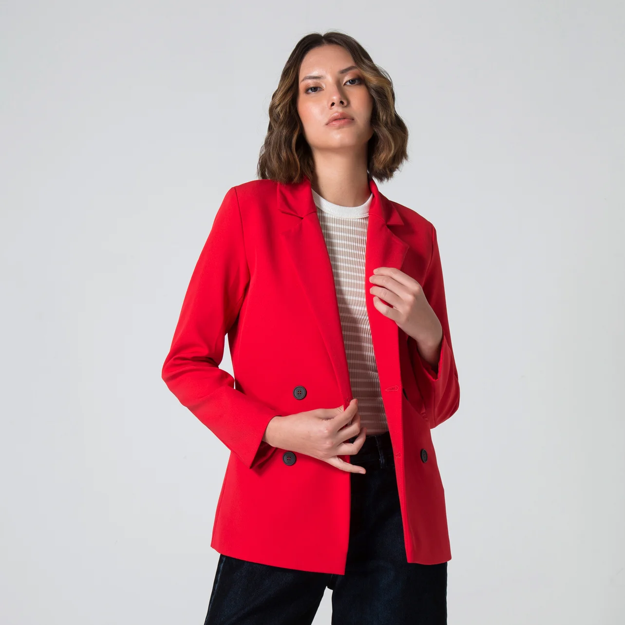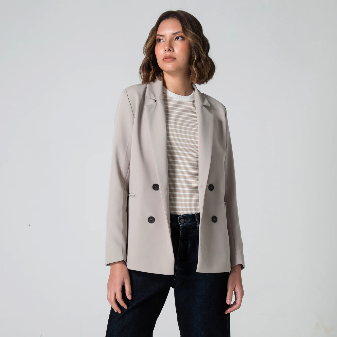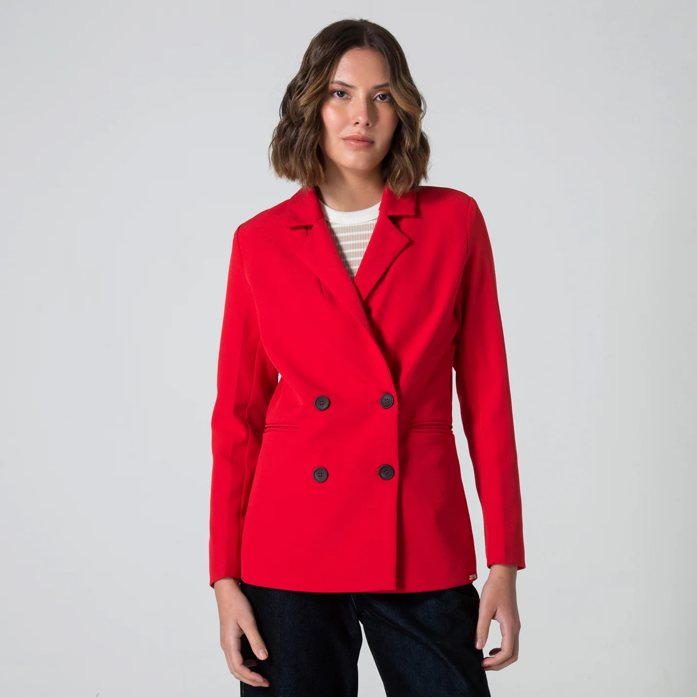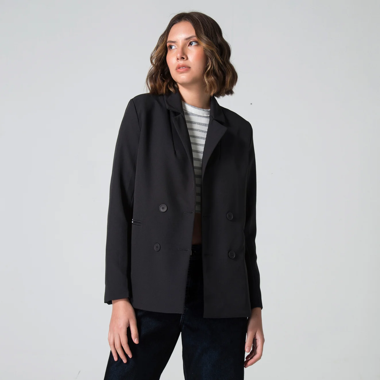 Blazer Sfera silueta regular que combina elegancia y comodidad. Su diseño incluye un cuello solapa clásico y hombros marcados, lo que le proporciona una estructura moderna y sofisticada. El sistema de cierre frontal es cruzado, asegurado con botones que añaden un toque distintivo. Además, cuenta con bolsillos tipo ribete, ofreciendo funcionalidad sin sacrificar el estilo. La prenda está diseñada con cortes estratégicos que realzan la cintura, permitiendo una mejor adaptación al cuerpo y favoreciendo la figura. Ideal para cualquier ocasión, esta blazer se puede combinar fácilmente con outfits tanto formales como casuales.