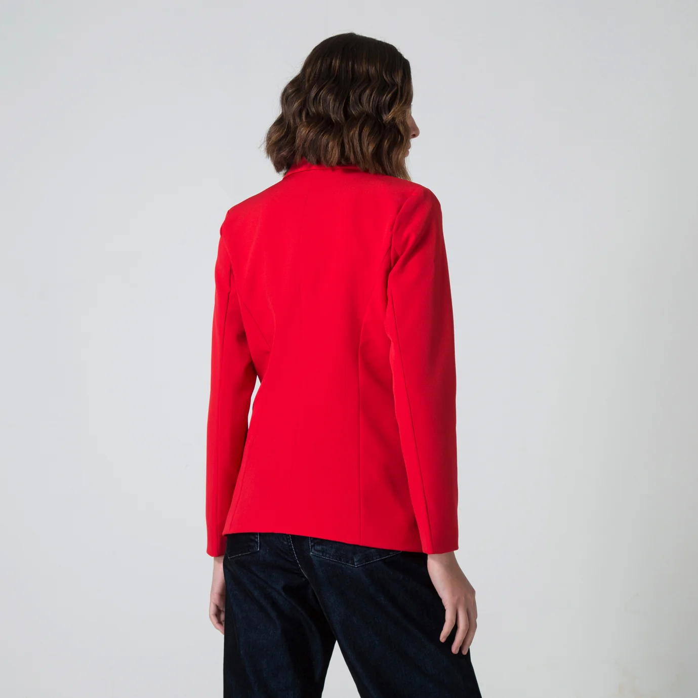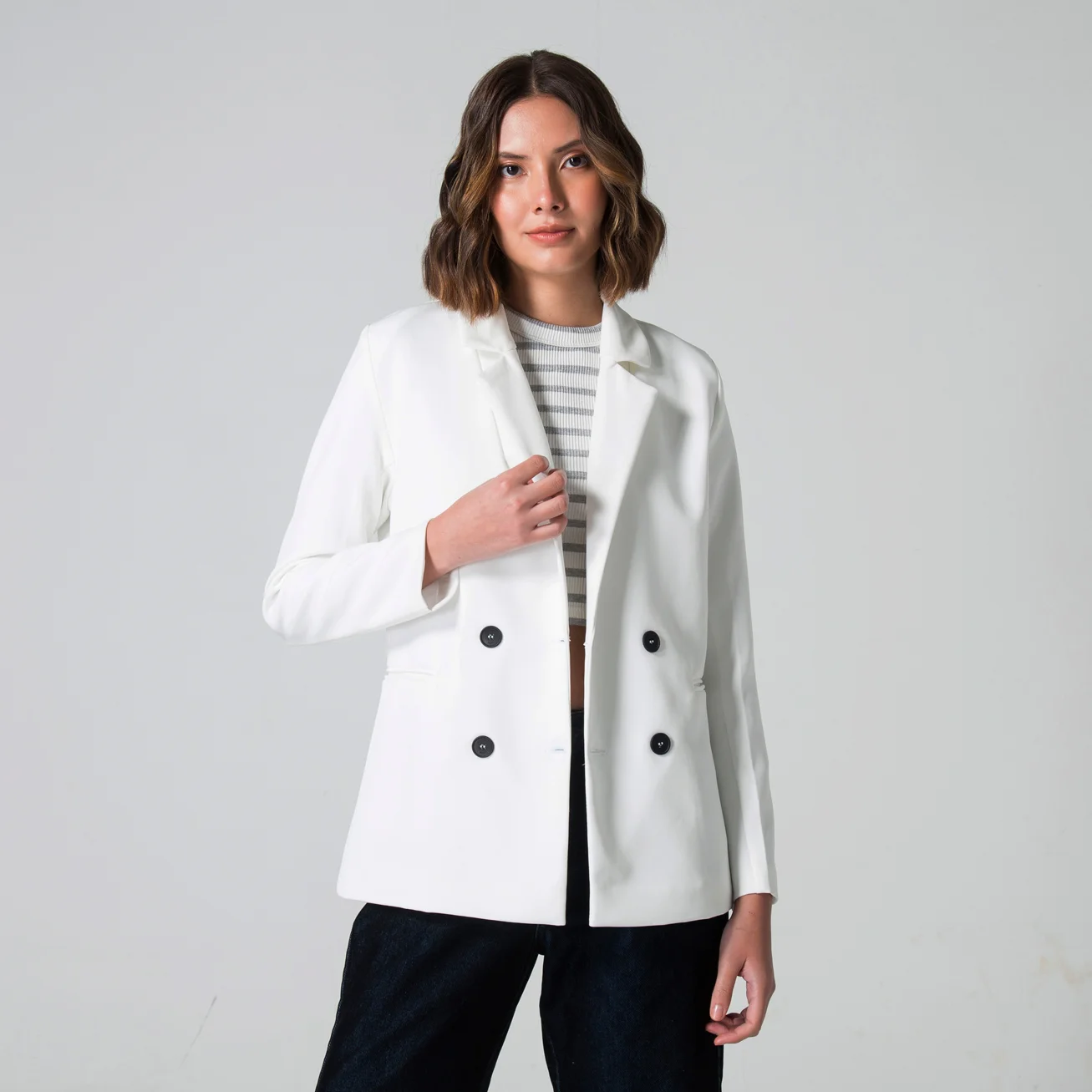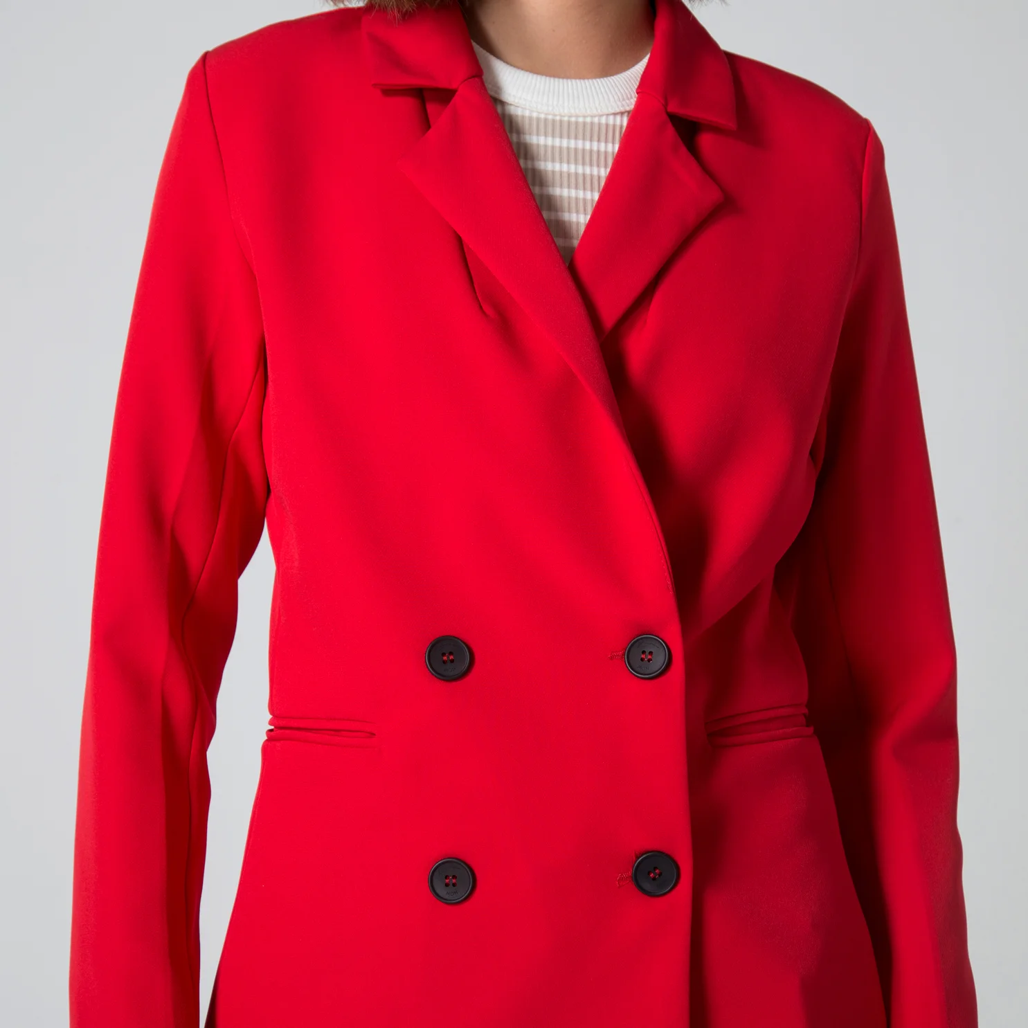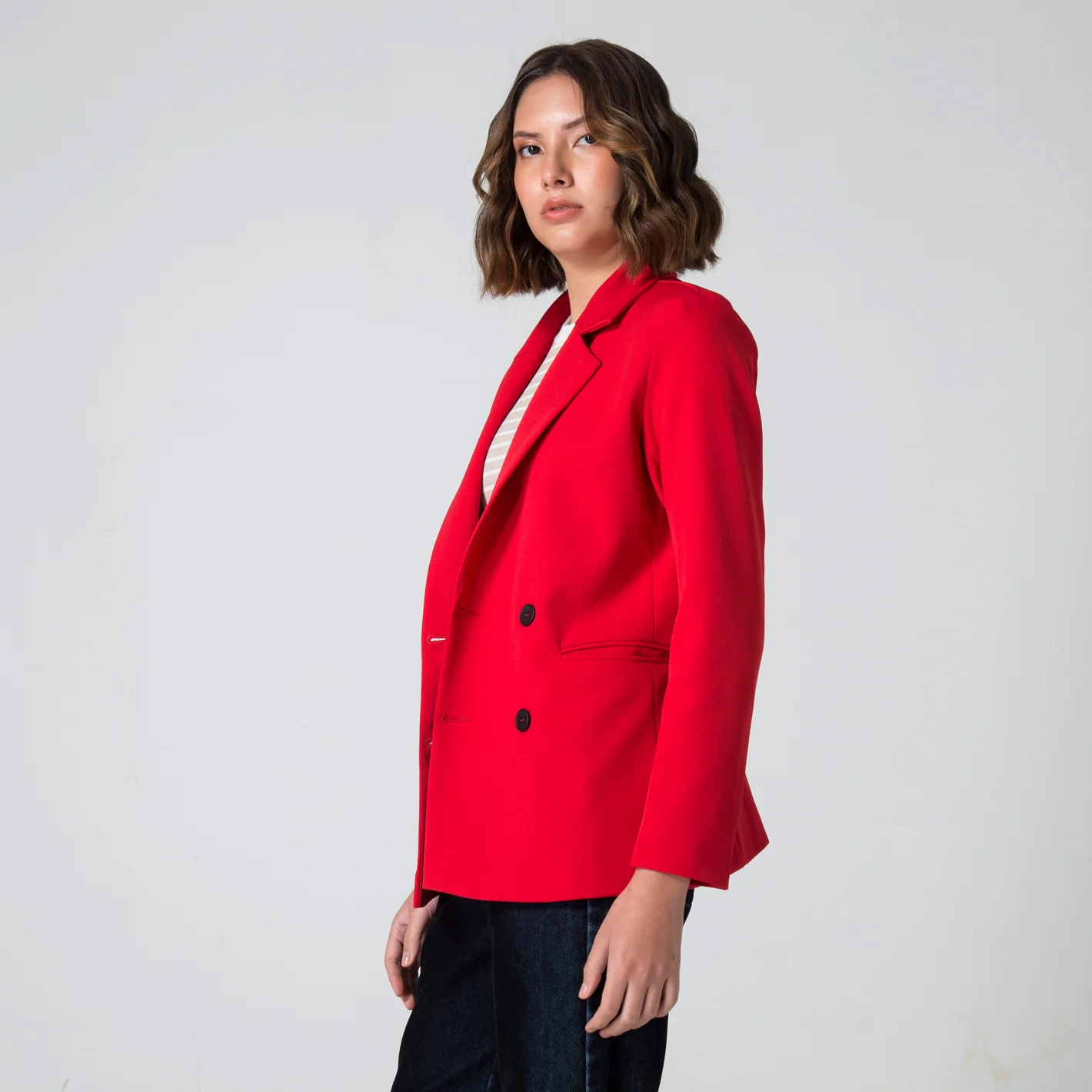 Blazer Sfera silueta regular que combina elegancia y comodidad. Su diseño incluye un cuello solapa clásico y hombros marcados, lo que le proporciona una estructura moderna y sofisticada. El sistema de cierre frontal es cruzado, asegurado con botones que añaden un toque distintivo. Además, cuenta con bolsillos tipo ribete, ofreciendo funcionalidad sin sacrificar el estilo. La prenda está diseñada con cortes estratégicos que realzan la cintura, permitiendo una mejor adaptación al cuerpo y favoreciendo la figura. Ideal para cualquier ocasión, esta blazer se puede combinar fácilmente con outfits tanto formales como casuales.