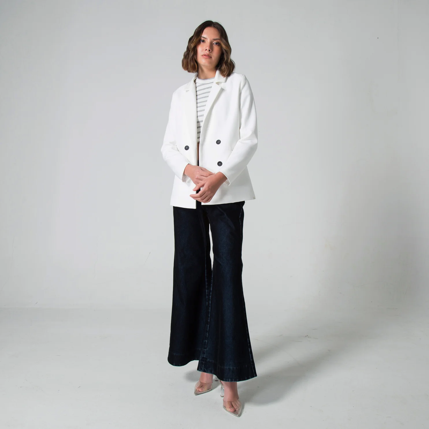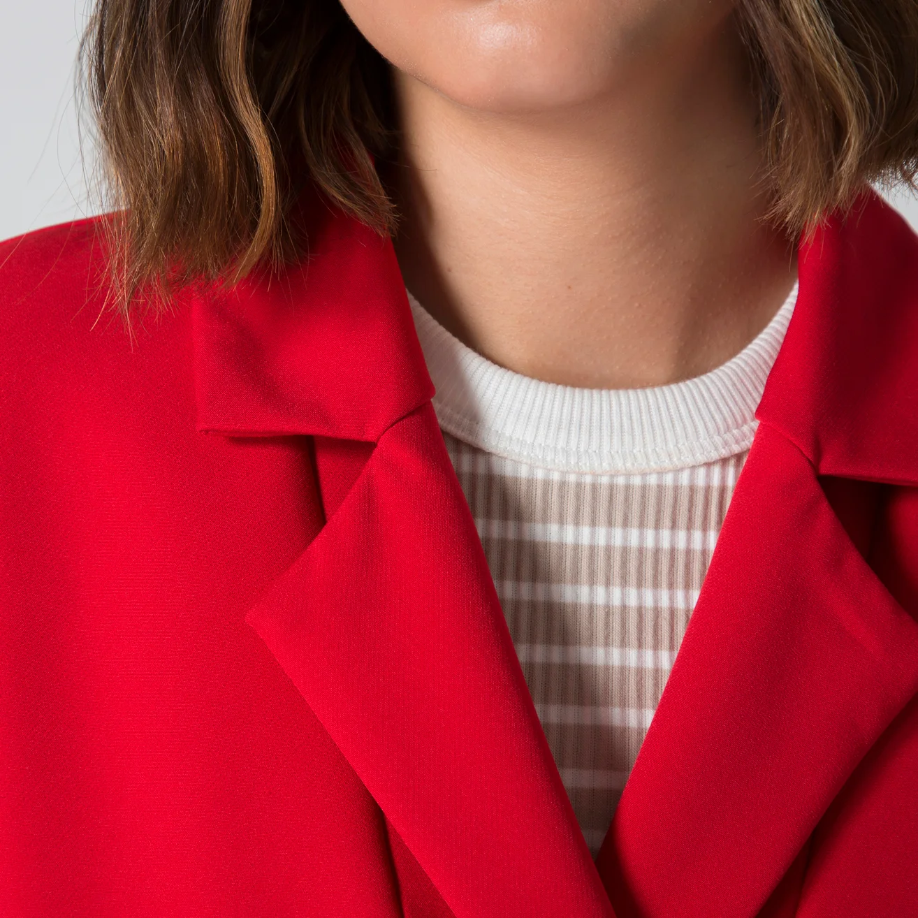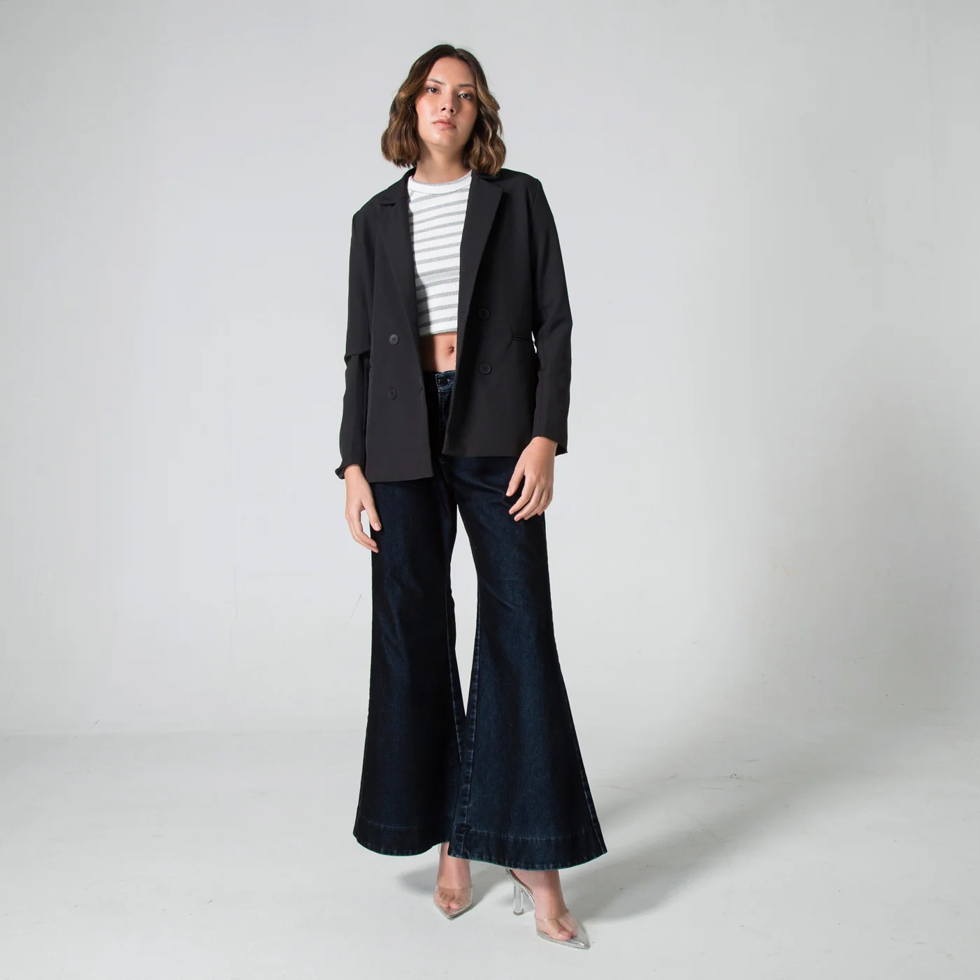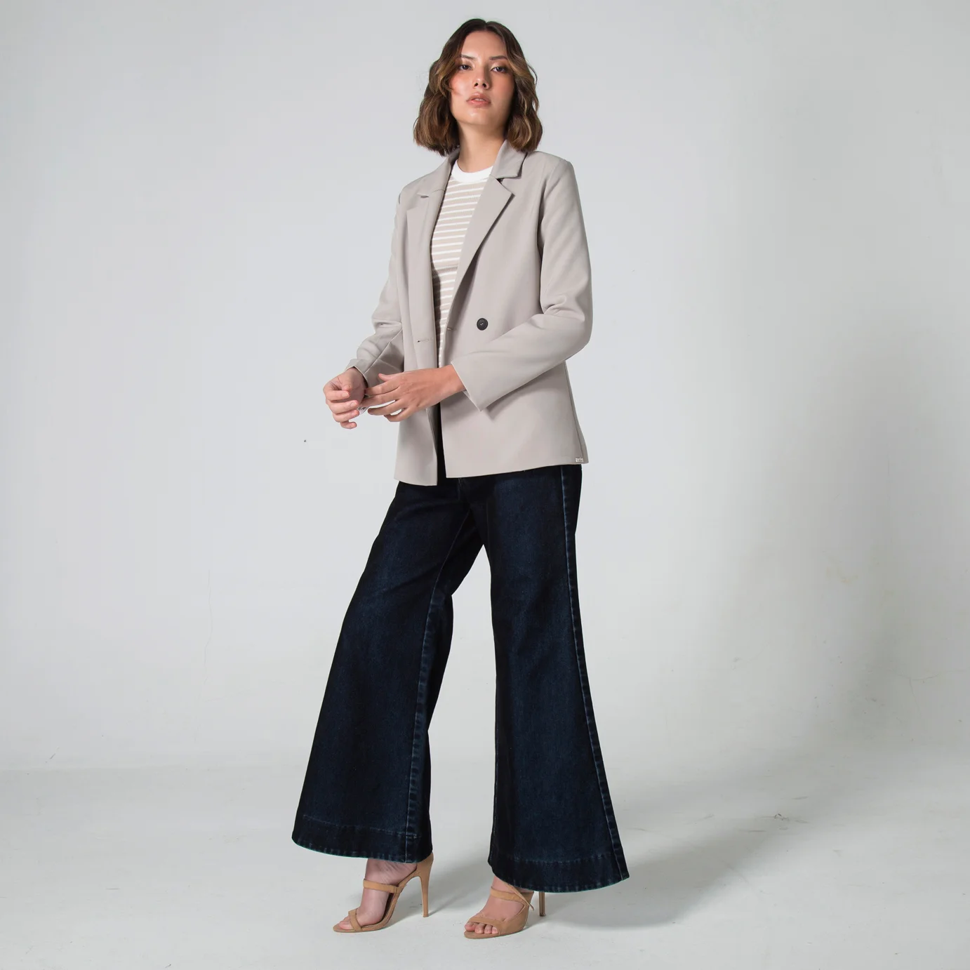 Blazer Sfera silueta regular que combina elegancia y comodidad. Su diseño incluye un cuello solapa clásico y hombros marcados, lo que le proporciona una estructura moderna y sofisticada. El sistema de cierre frontal es cruzado, asegurado con botones que añaden un toque distintivo. Además, cuenta con bolsillos tipo ribete, ofreciendo funcionalidad sin sacrificar el estilo. La prenda está diseñada con cortes estratégicos que realzan la cintura, permitiendo una mejor adaptación al cuerpo y favoreciendo la figura. Ideal para cualquier ocasión, esta blazer se puede combinar fácilmente con outfits tanto formales como casuales.