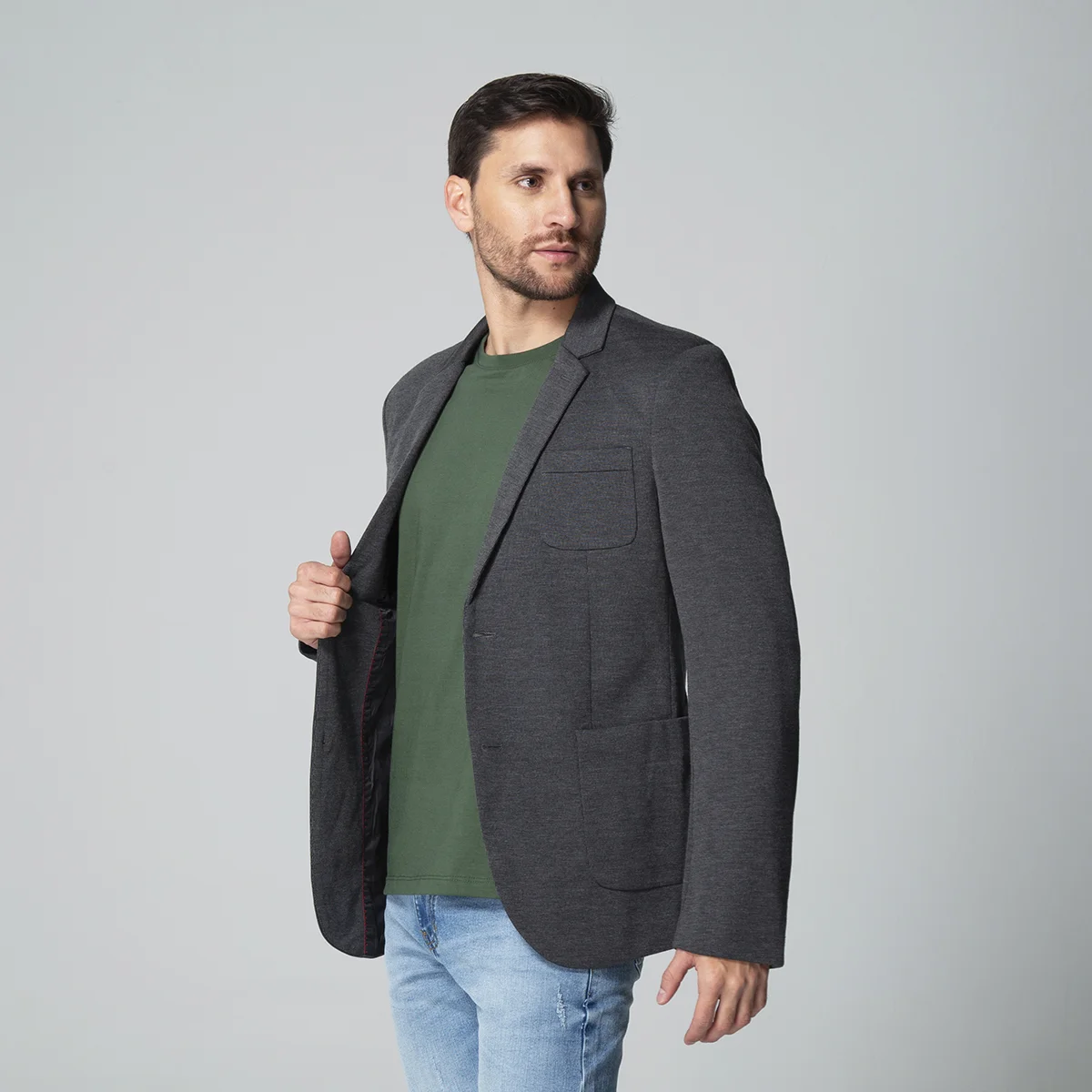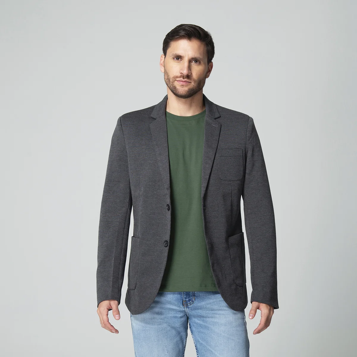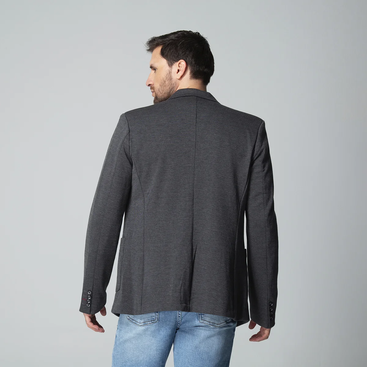 Las mangas largas del blazer finalizan con un elegante detalle de botonadura, aportando un acabado pulido al diseño. Este blazer para hombre es una opción versátil que se adapta a diversas ocasiones, asegurando que quien lo lleve luzca siempre impecable.