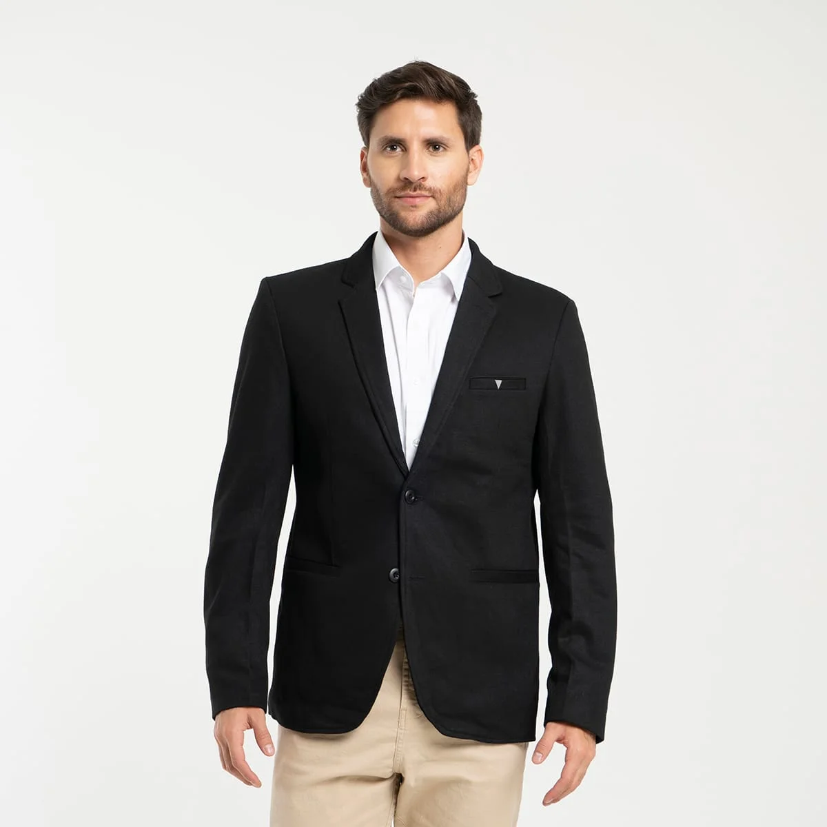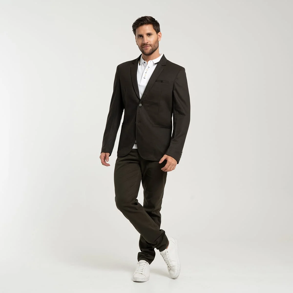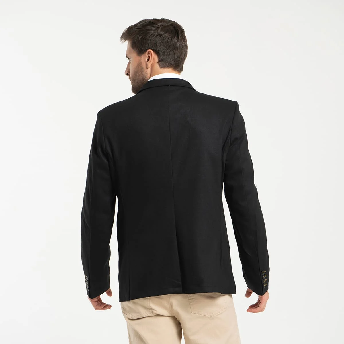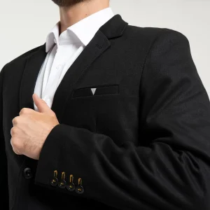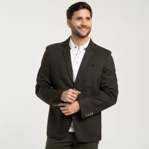 Blazer Paul, cuello con solapa, su sistema de cierre es de botonadura, en la parte frontal cuenta con pinzas de entalle y tres bolsillos, uno en la parte superior izquierdo tipo ribete, y dos bolsillos tipo ribete, mangas largas terminadas con detalle de botonadura.
