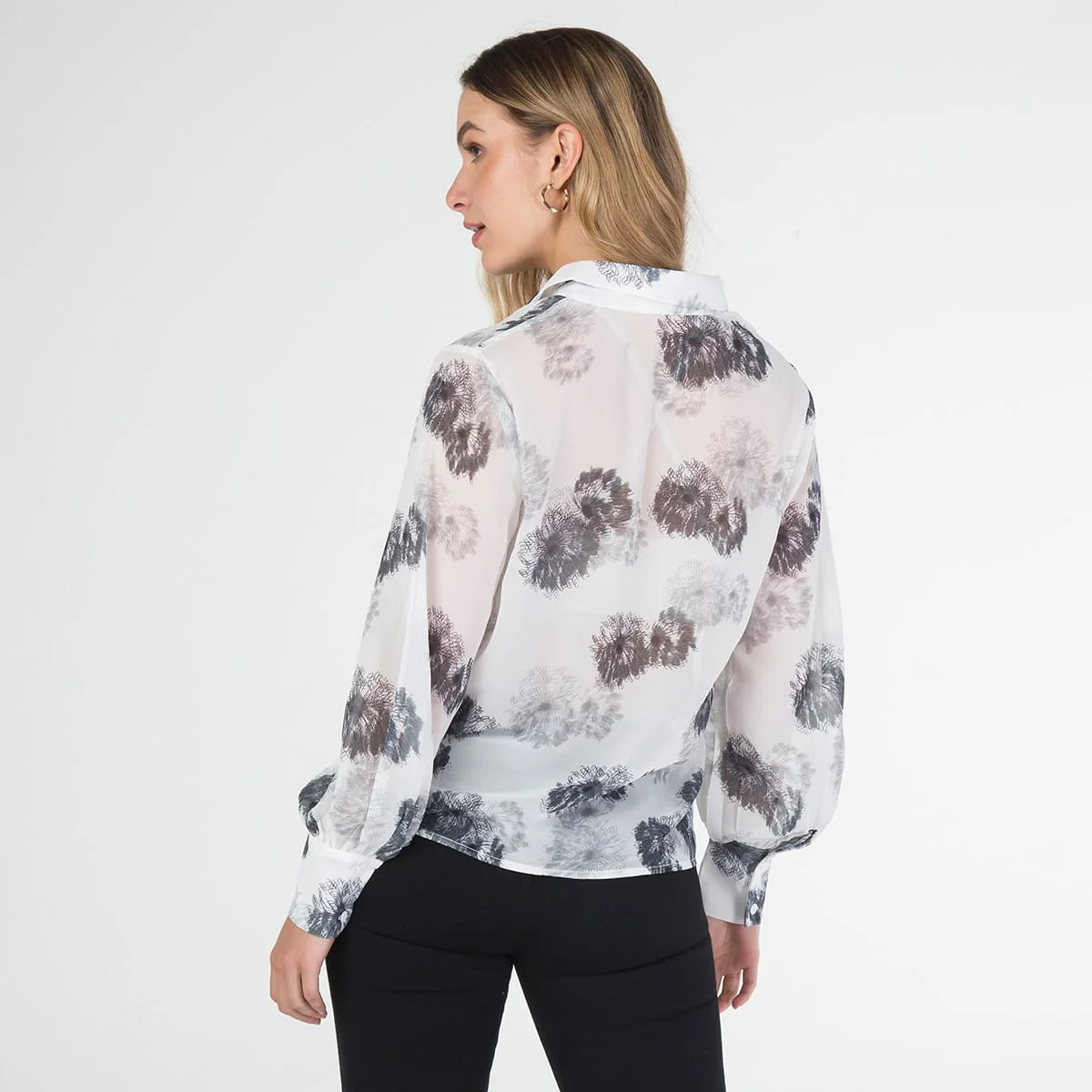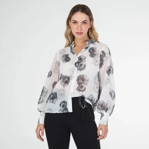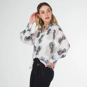 Blusa estampada Bray, con cuello camisero, manga larga globo terminada con cierre de botonadura, su sistema de cierre es mediante botonadura.