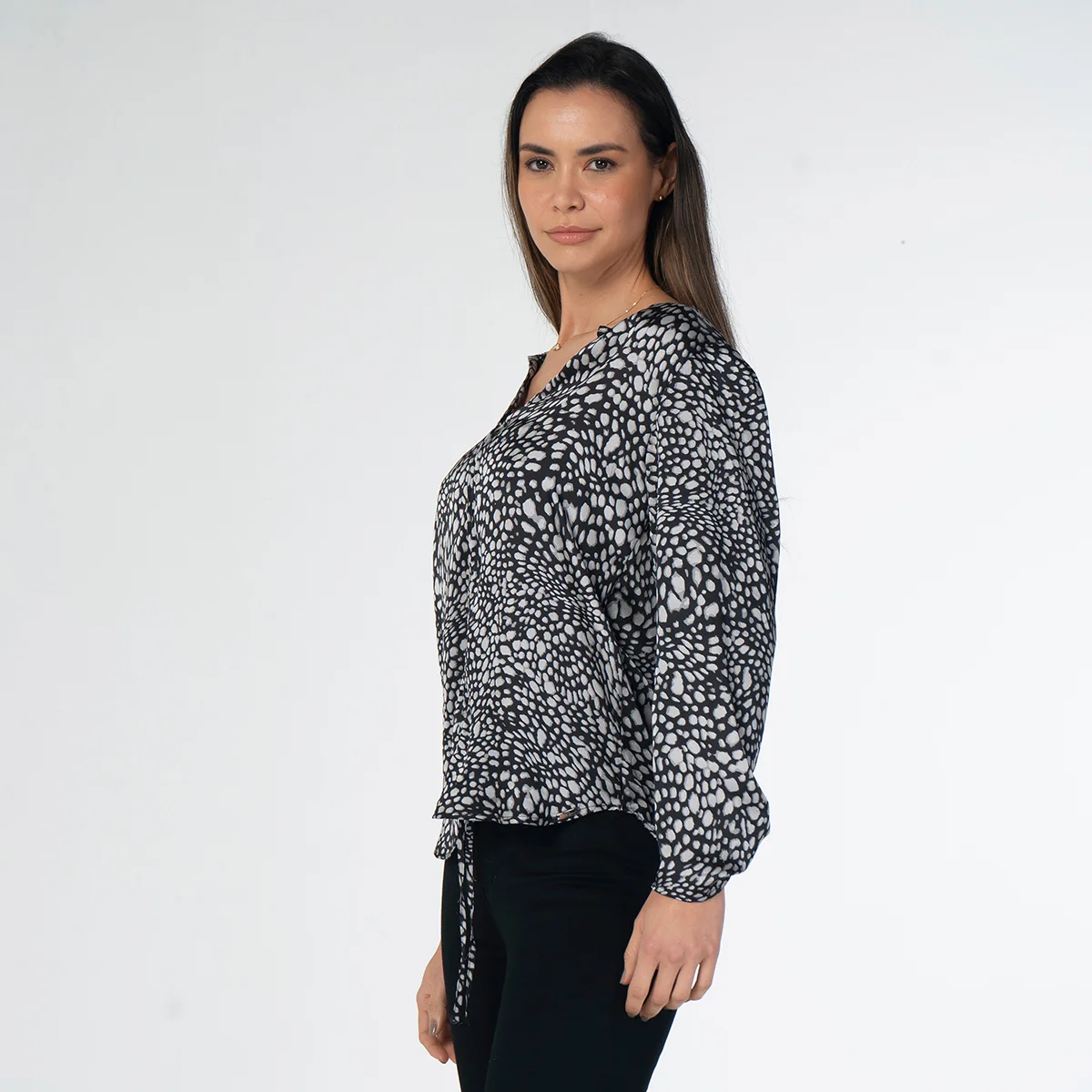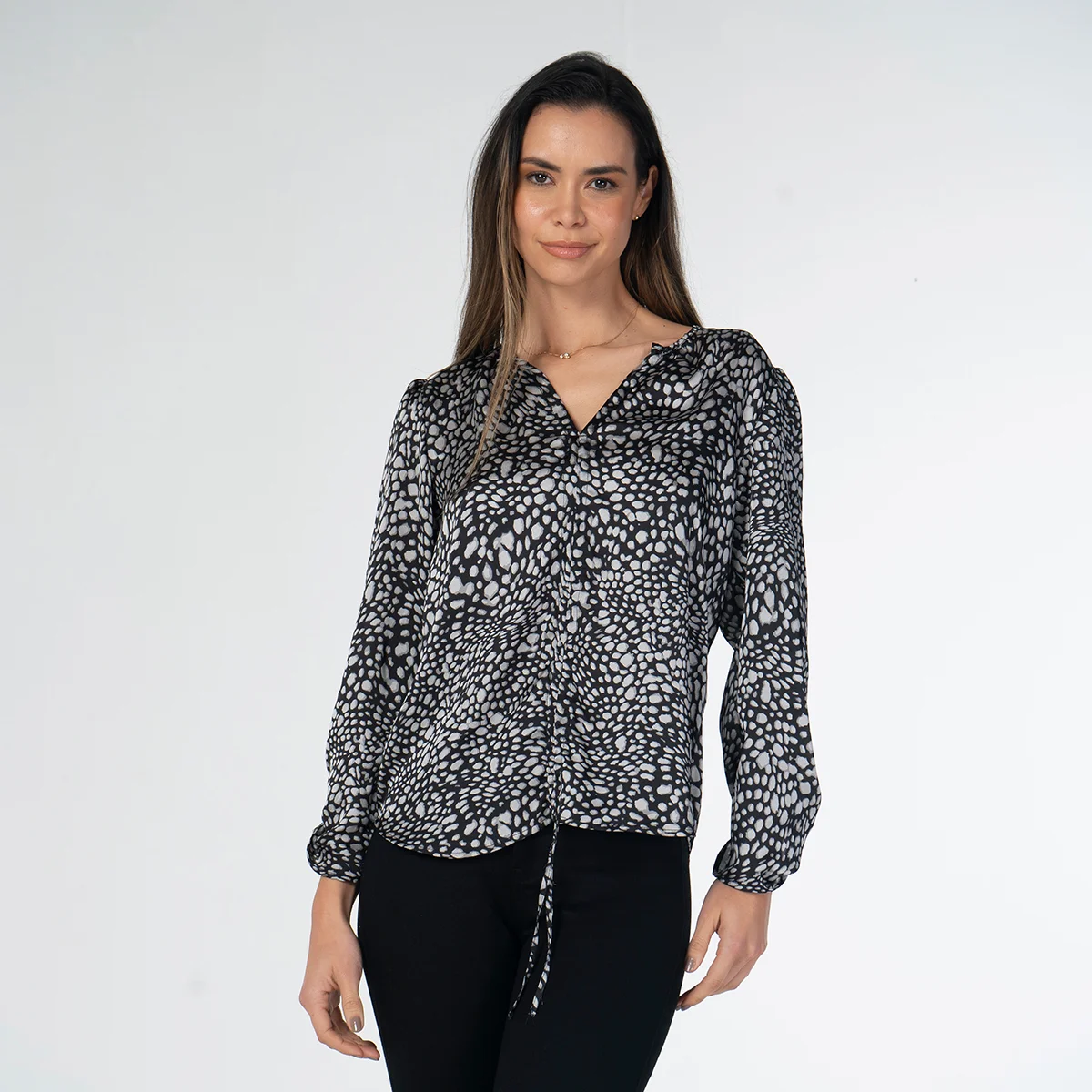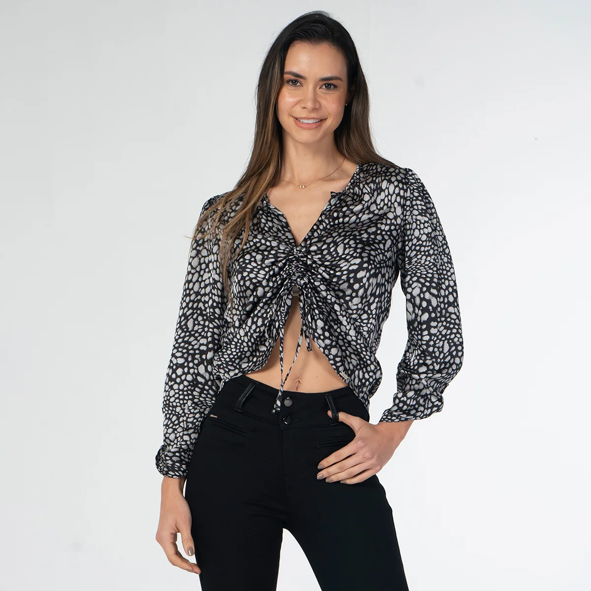 Blusa Wildly silueta slim que se ajusta elegantemente al cuerpo, resaltando la figura de quien la lleva. Su escote tipo V añade un toque de sofisticación, al tiempo que proporciona un aire fresco y moderno. Las mangas largas aportan un elemento clásico, perfectas para cualquier ocasión. Un detalle distintivo se encuentra en la parte frontal, donde un delicado recogido en el centro añade textura y movimiento a la prenda, realzando su diseño, Esta blusa es ideal para combinar con jeans o una falda, convirtiéndola en una elección versátil para el día a día o eventos especiales.