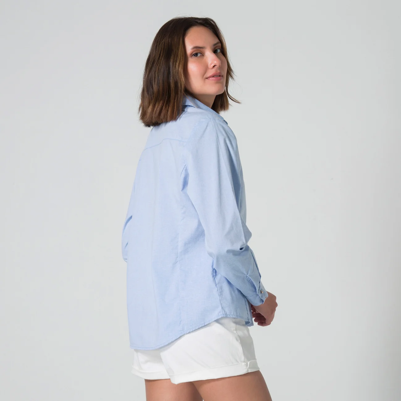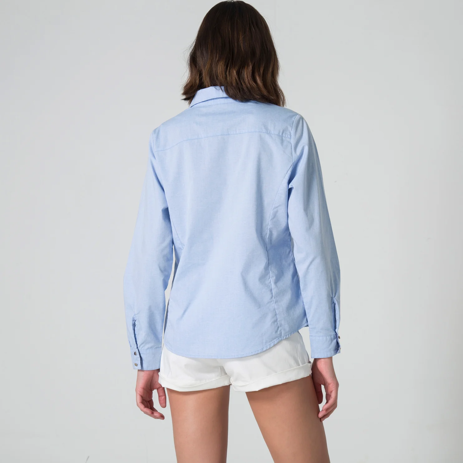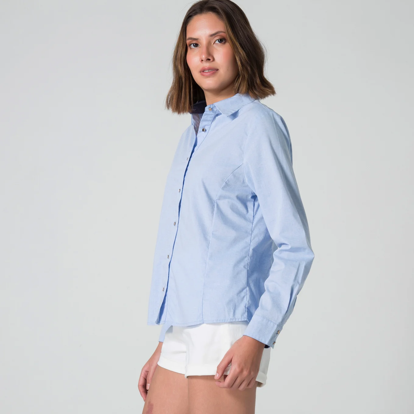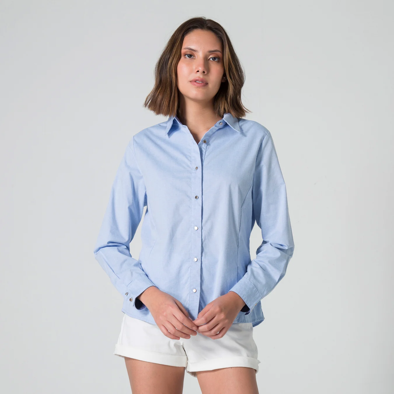 Blusa Ángel es una prenda elegante y sofisticada, diseñada con un cuello camisero que aporta un toque clásico y profesional. Su manga larga se complementa con puños terminados en una delicada botonadura, lo que añade un acabado pulcro y refinado. El sistema de cierre de la blusa es también a través de una botonadura frontal, lo que permite un ajuste cómodo y versátil. Ideal para ocasiones tanto formales como informales, esta blusa para mujer puede ser combinada fácilmente con pantalones o faldas, ofreciendo una opción para el vestuario diario. Su diseño atemporal asegura que sea una pieza esencial en cualquier armario.
