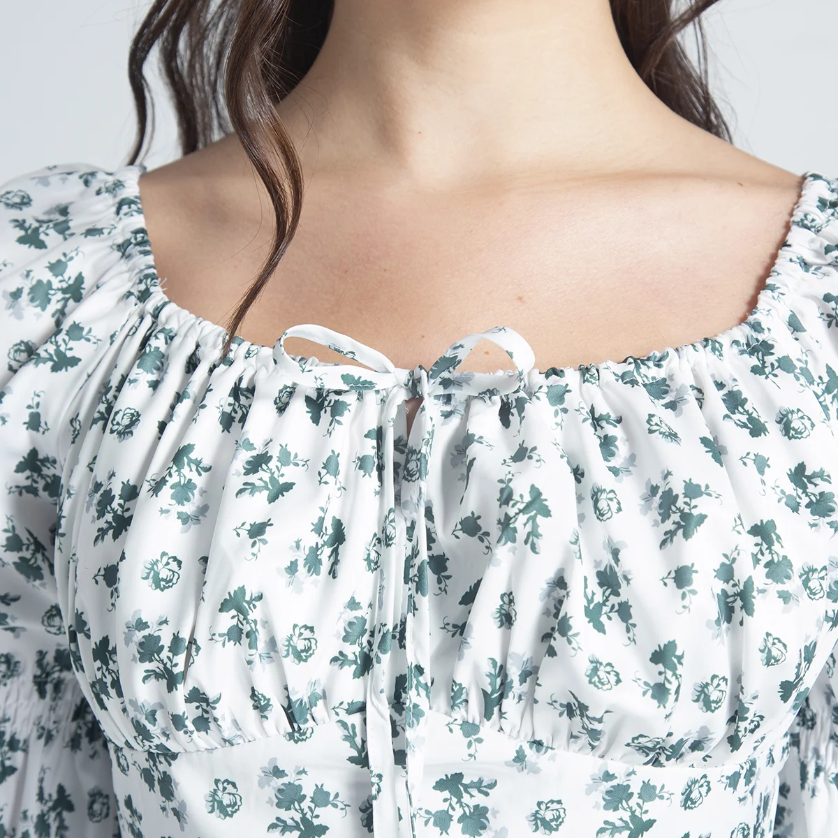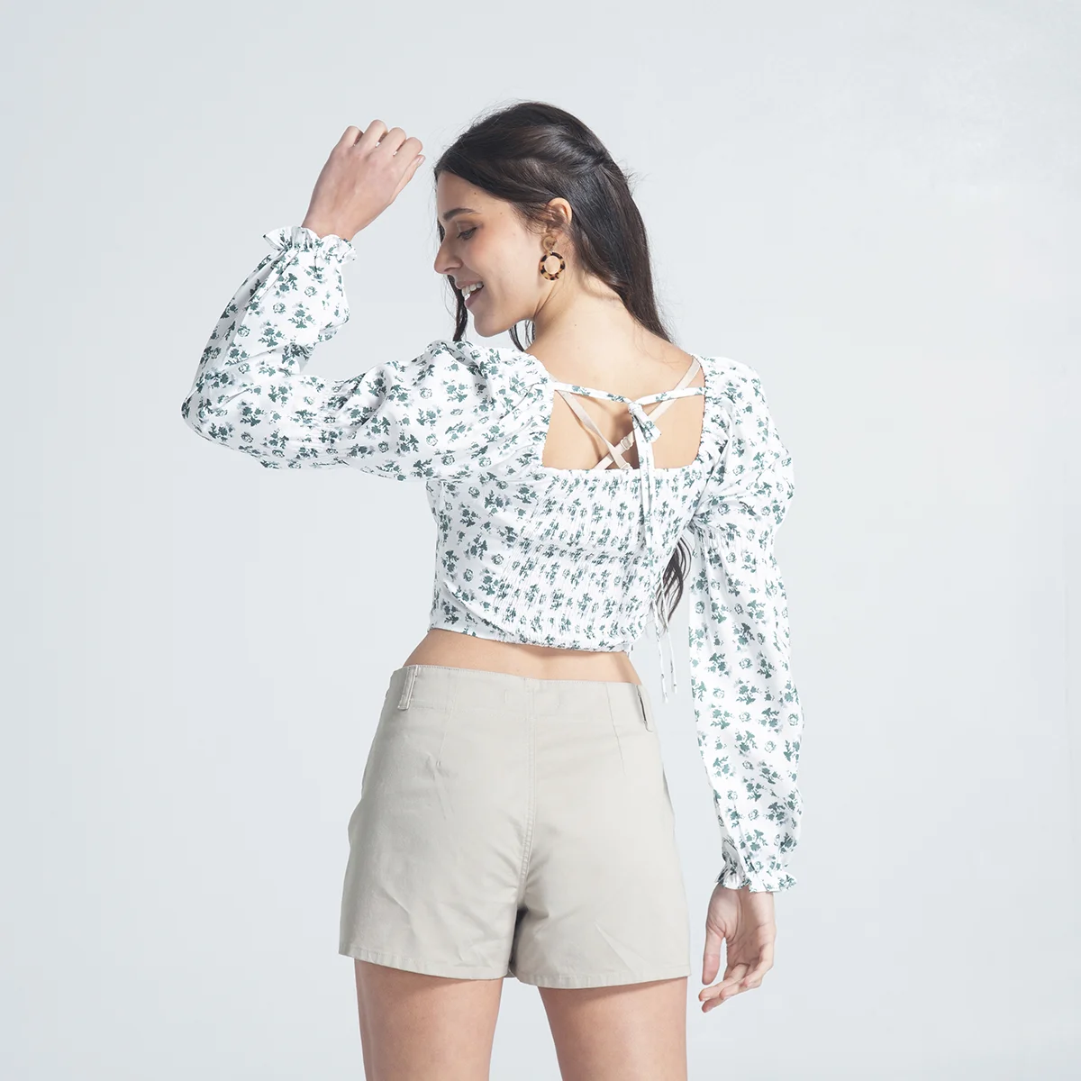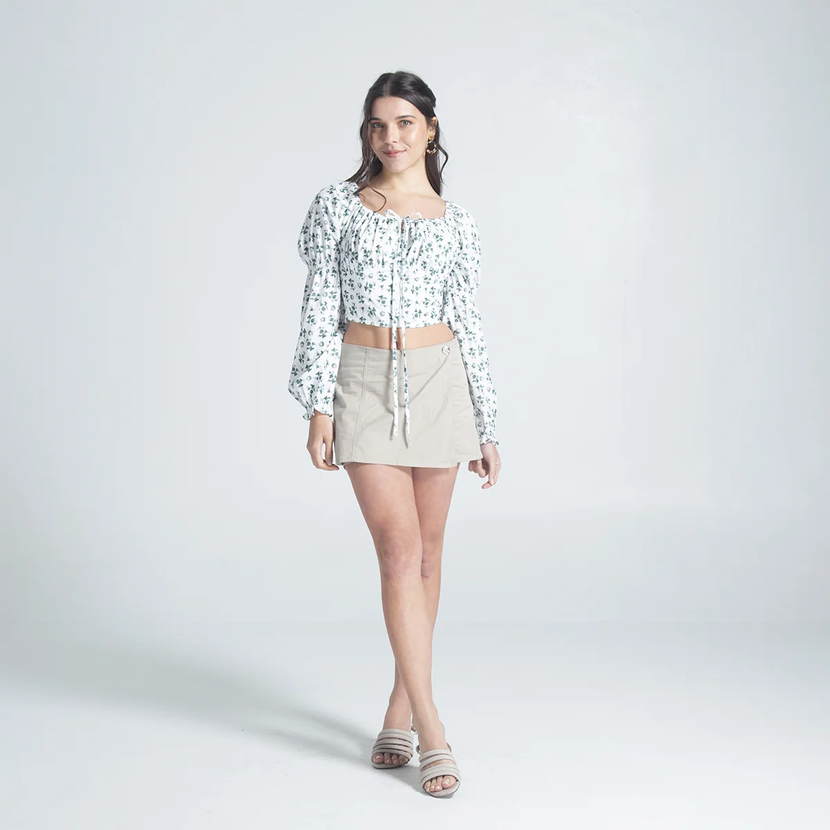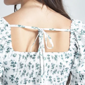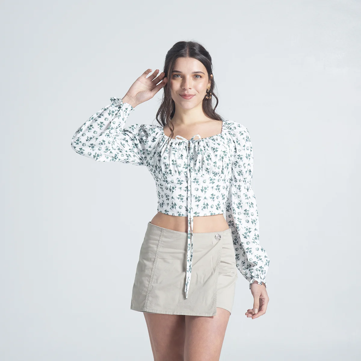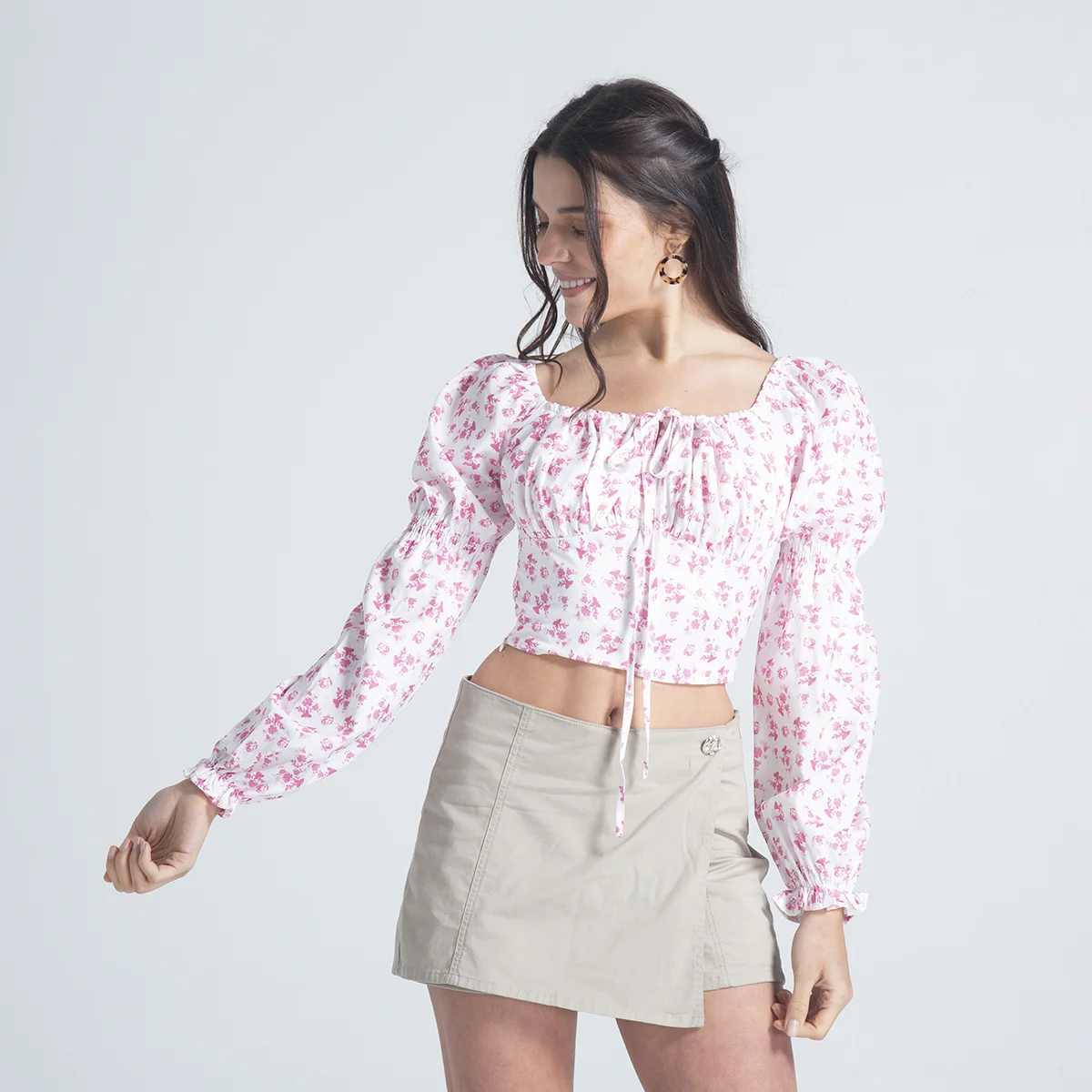 blusa crop top Izzy con estampado floral es la pieza clave para un look romántico y fresco, destacando por su diseño de mangas abullonadas con detalle elástico que aporta volumen y tendencia. Su escote cuadrado ajustable con lazo frontal y el corpiño fruncido realzan la silueta femenina con delicadeza, mientras que su confección ligera la hace ideal para combinar con faldas de tiro alto o jeans en días de sol. Esta blusa para mujer es perfecta para quienes buscan un estilo coquette, combina versatilidad y elegancia en un solo diseño, asegurando comodidad y un ajuste favorecedor para cualquier ocasión casual.