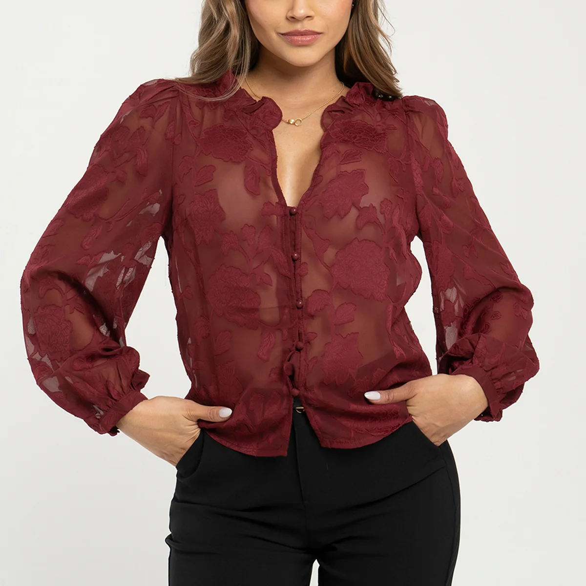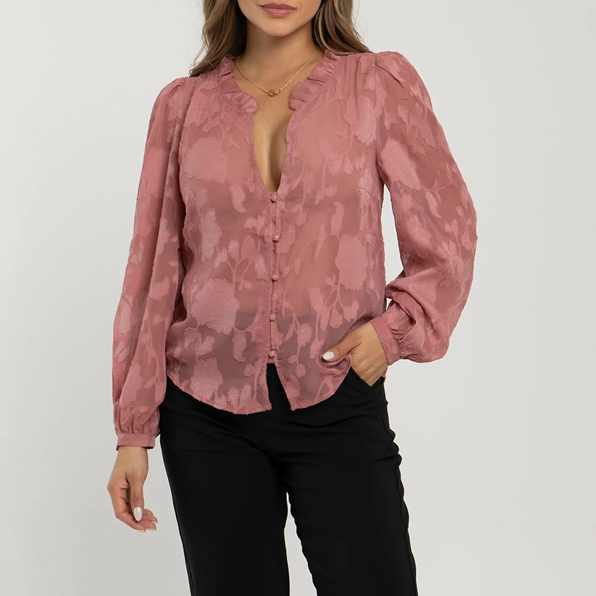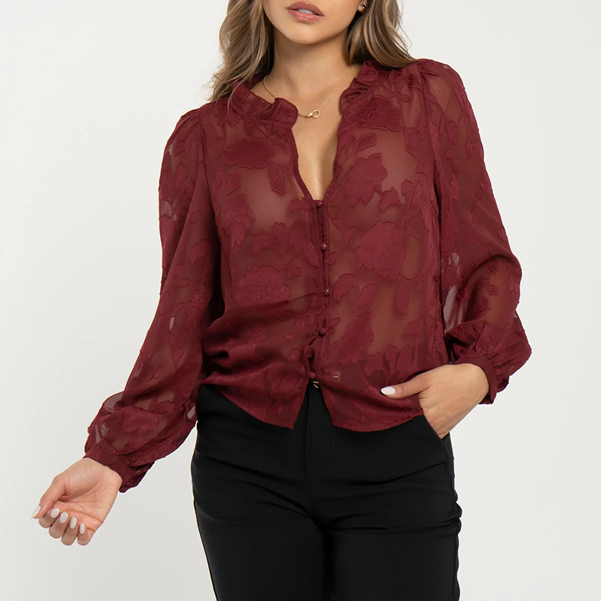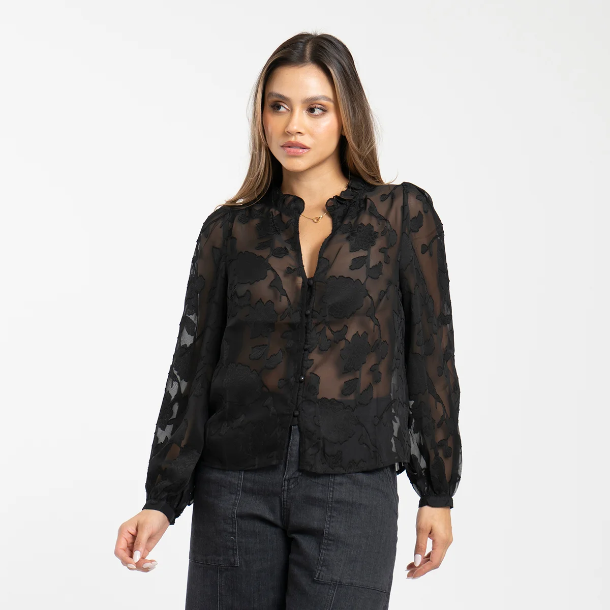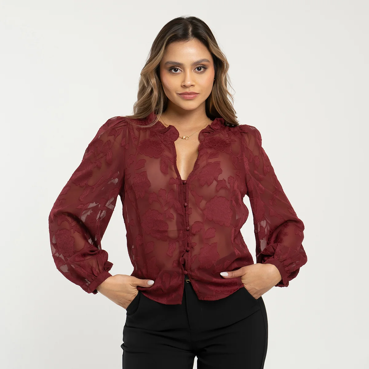 Blusa con transparencia Iconic es una prenda sofisticada y versátil que añade un toque de elegancia a tu guardarropa. Su diseño presenta un escote en V que realza la figura, mientras que el cuello alto recogido aporta un aire chic y contemporáneo. Las mangas largas en forma de globo, con puños terminados en botón, añaden un detalle distintivo y atractivo. Además, su sistema de cierre mediante botonadura asegura un ajuste perfecto y cómodo. Esta blusa es ideal para diversas ocasiones, ya sea en un evento formal o una salida casual, garantizando que siempre destaques con estilo. Combínala con una falda ajustada o pantalones elegantes para completar tu look.