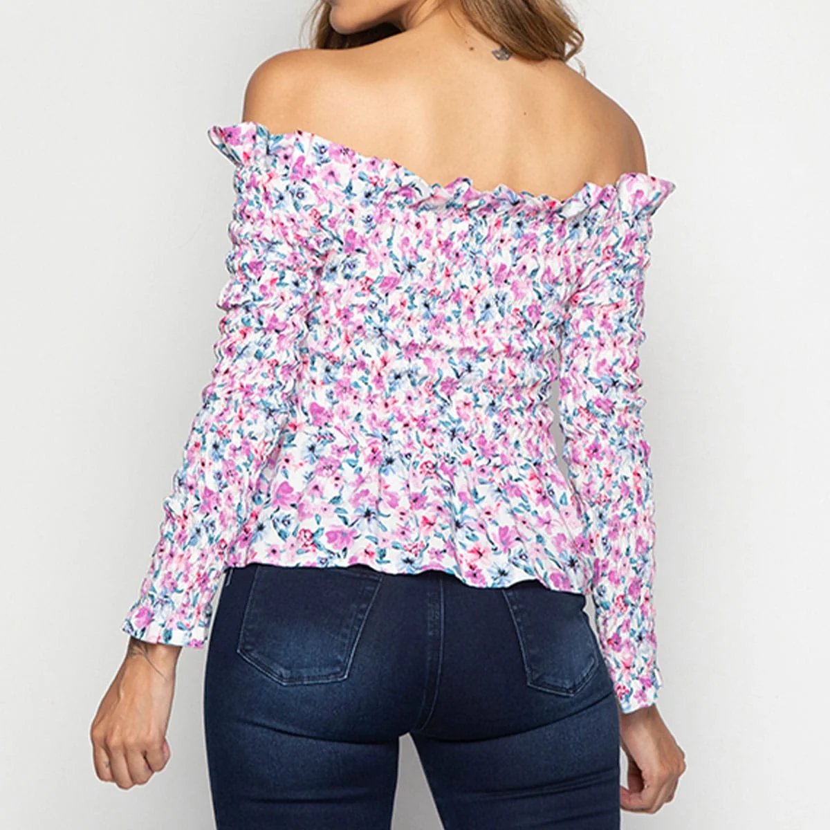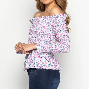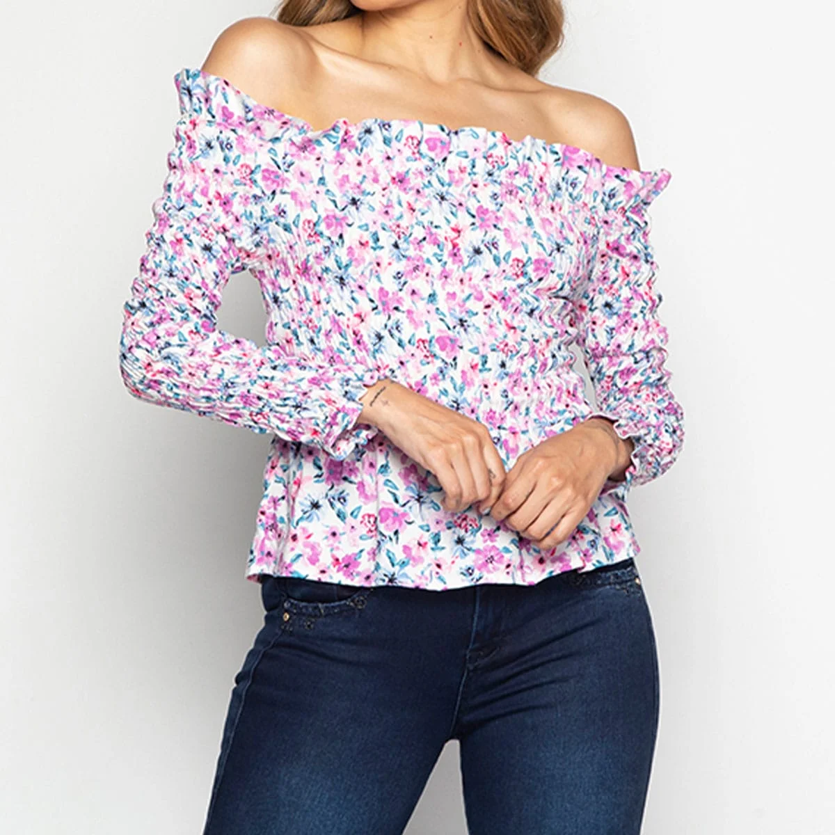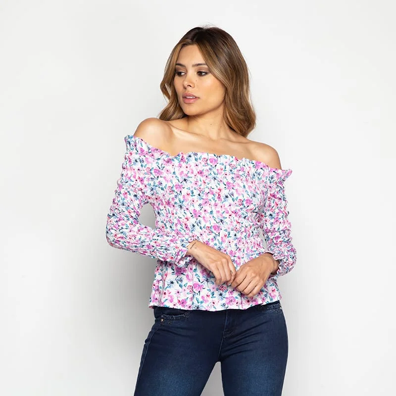 Blusa para mujer, cuello bandeja con encauchado divid, manga larga y sistema encauchado, al igual que en frente y espalda hasta el bajo busto. En el busto en frente y espalda liso con vuelo para mejor volumen y horma. Esta es una prenda de la linea now, un diseño de la temporada basado en la tendencia de blusas campesinas, con detalles delicados y muy femeninos.