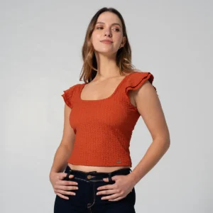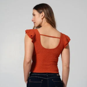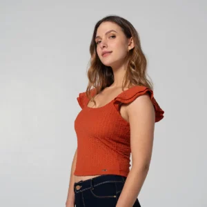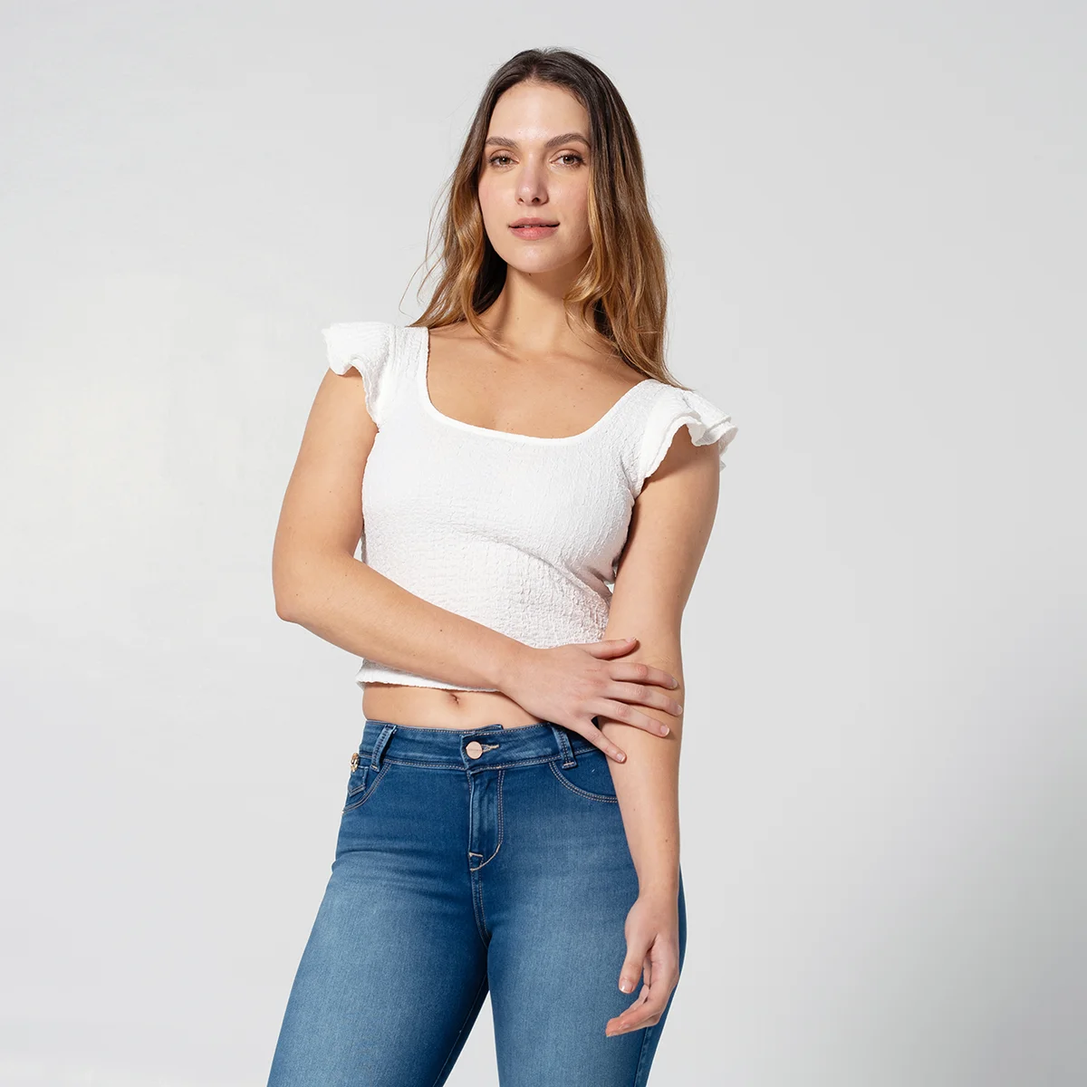 La Blusa Famax es una prenda femenina y ligera que destaca por su diseño con escote en U en la parte frontal, cuenta con mangas sisa que incorporan delicados boleros, añadiendo volumen y movimiento a los hombros.