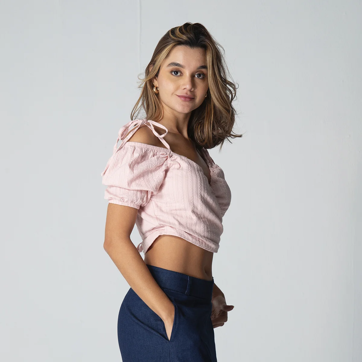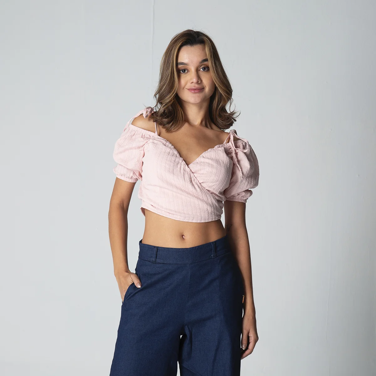 Blusa Bulma con mangas globo que aportan volumen y un toque romántico. Cuenta con un escote cruzado ajustable mediante un cordón, permitiendo adaptar la prenda a tu comodidad y estilo. Además, incorpora tiras para anudar, facilitando el ajuste perfecto y añadiendo un detalle decorativo. Ideal para un look fresco y femenino, perfecta para combinar con diferentes estilos y ocasiones.
