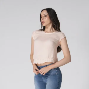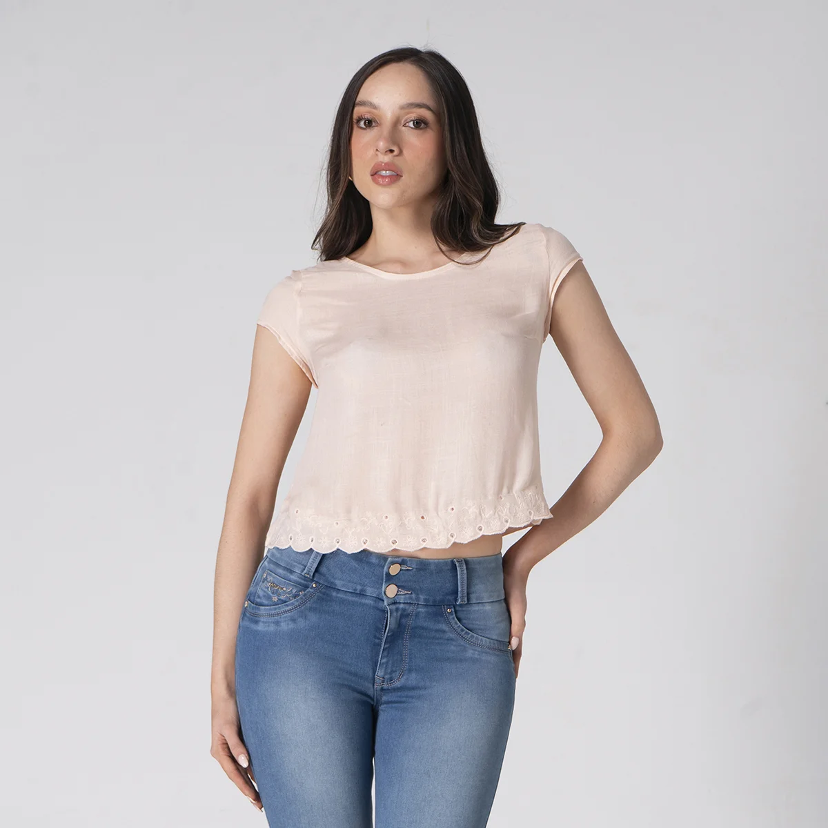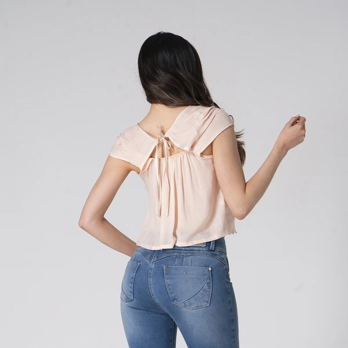 Blusa Marie silueta slim que resalta la figura de manera elegante y moderna. Su escote redondo con tiras de anudar aporta un toque delicado y femenino, permitiendo realizar el ajuste a gusto. Blusa para mujer de manga corta, ideal para días cálidos, y cuenta con un hermoso bordado en el ruedo que añade un detalle sofisticado. En la parte posterior, la blusa tiene una abertura que brinda un toque de estilo y comodidad adicional. Una pieza versátil y chic, perfecta para lucir en diferentes ocasiones.