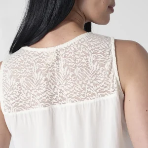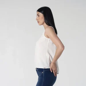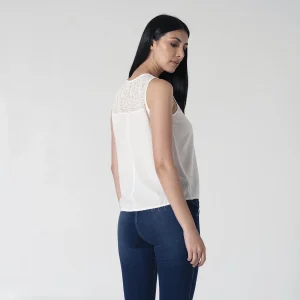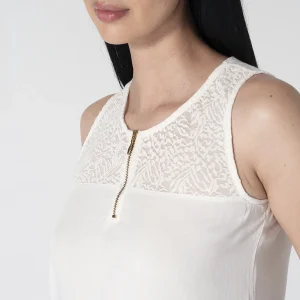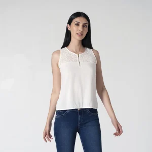 Blusa Rudi silueta slim que realza la figura de manera elegante, Tiene manga sisa que aportan un estilo fresco y cómodo, ideal para diferentes ocasiones. Su escote redondo con un delicado detalle de cremallera, añade un toque moderno y sofisticado, Además cuenta con cortes en la parte superior adornados con blonda, lo que le confiere un acabado femenino y con un toque de delicadeza. Es una prenda versátil y chic, perfecta para complementar un look sofisticado y a la moda.
