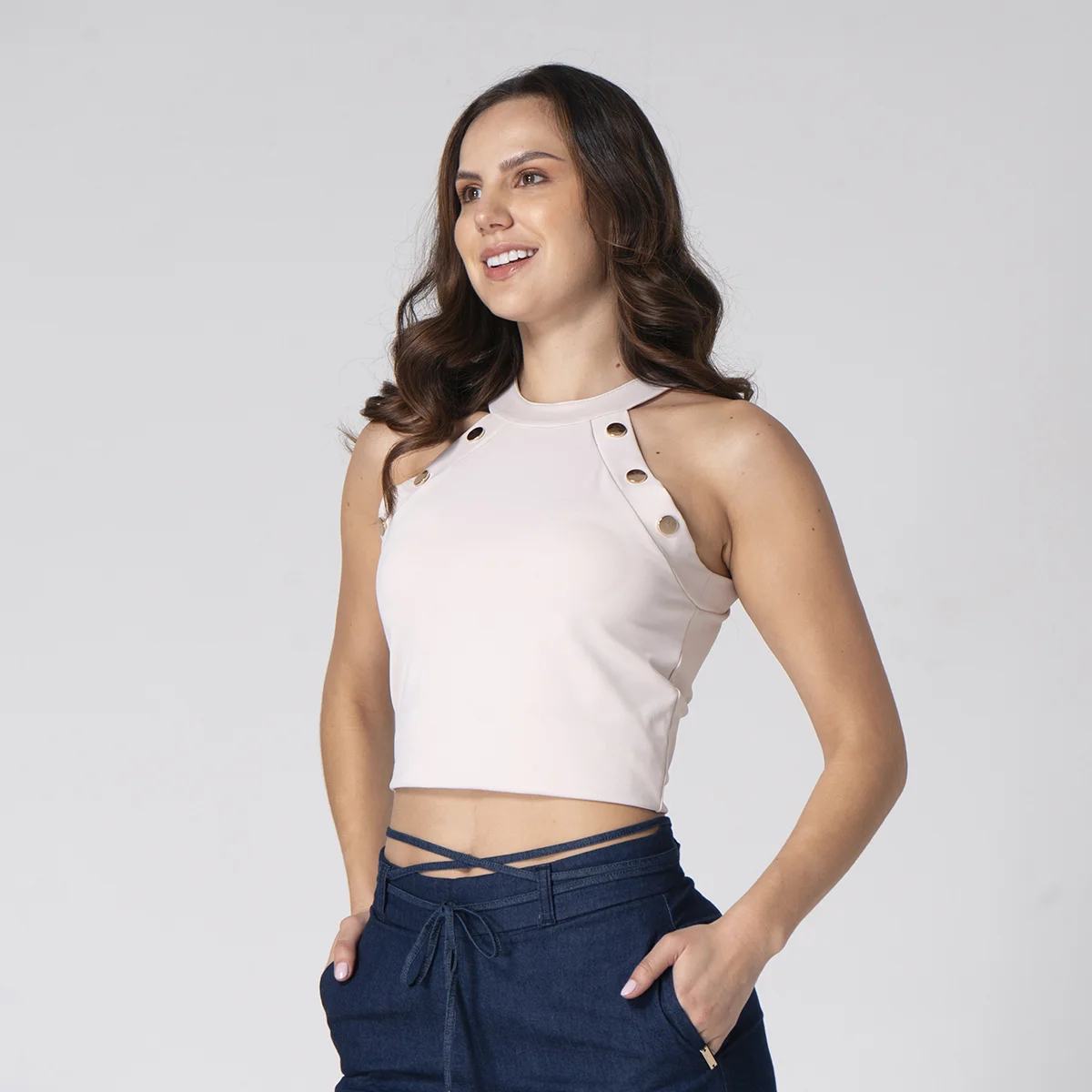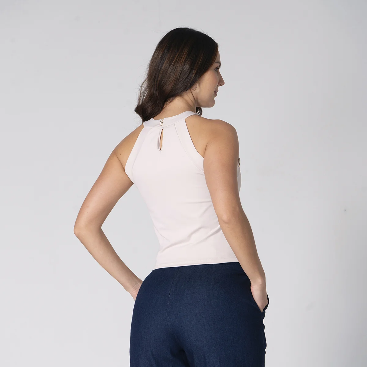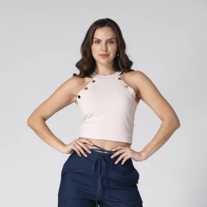 Blusa Wankii silueta slim que realza la figura, diseñada con un escote redondo que aporta un toque clásico y elegante, su manga sisa te ofrece comodidad y un estilo fresco, cuenta con detalles de broches decorativos que añaden un toque distintivo y sofisticado. En la parte trasera, cuenta con una abertura con cierre de botón, brindando un acabado moderno y funcional. Esta blusa para mujer es ideal para quienes buscan un conjunto versátil y con detalles únicos.
