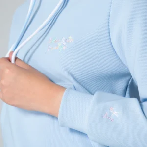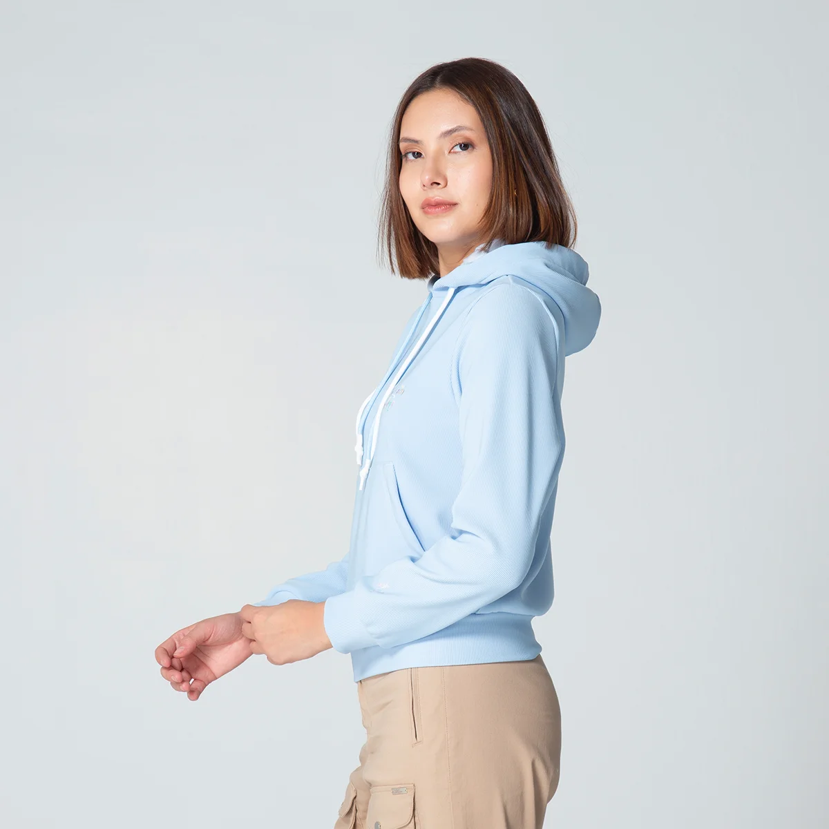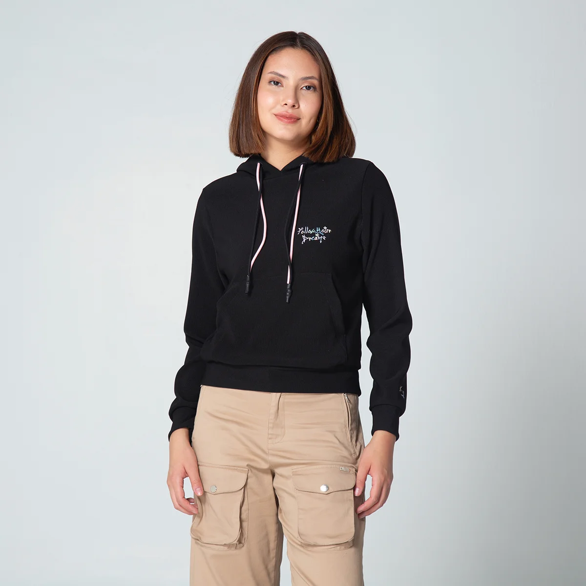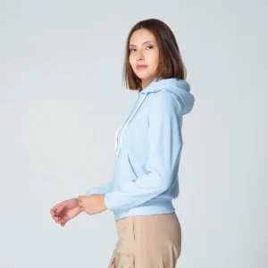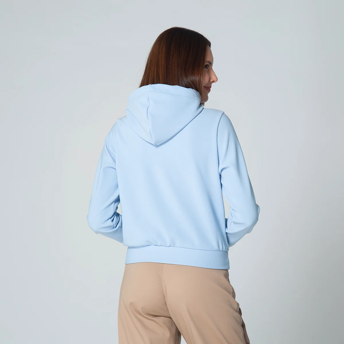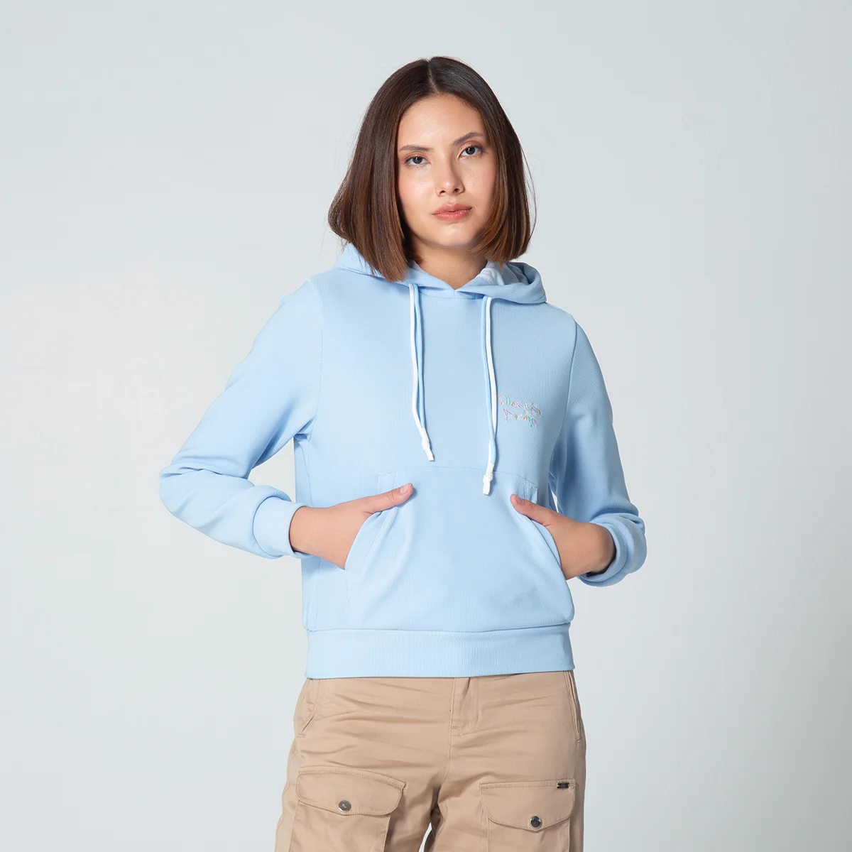 El frente de la prenda se distingue por un bordado que aporta carácter, y se complementa con una práctica manga con bolsillo tipo canguro, ideal para mantener las manos abrigadas o guardar pequeños objetos.