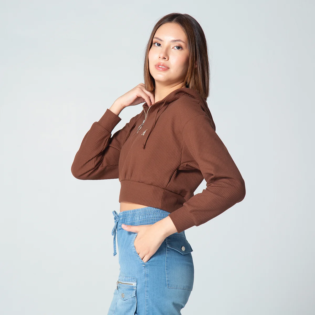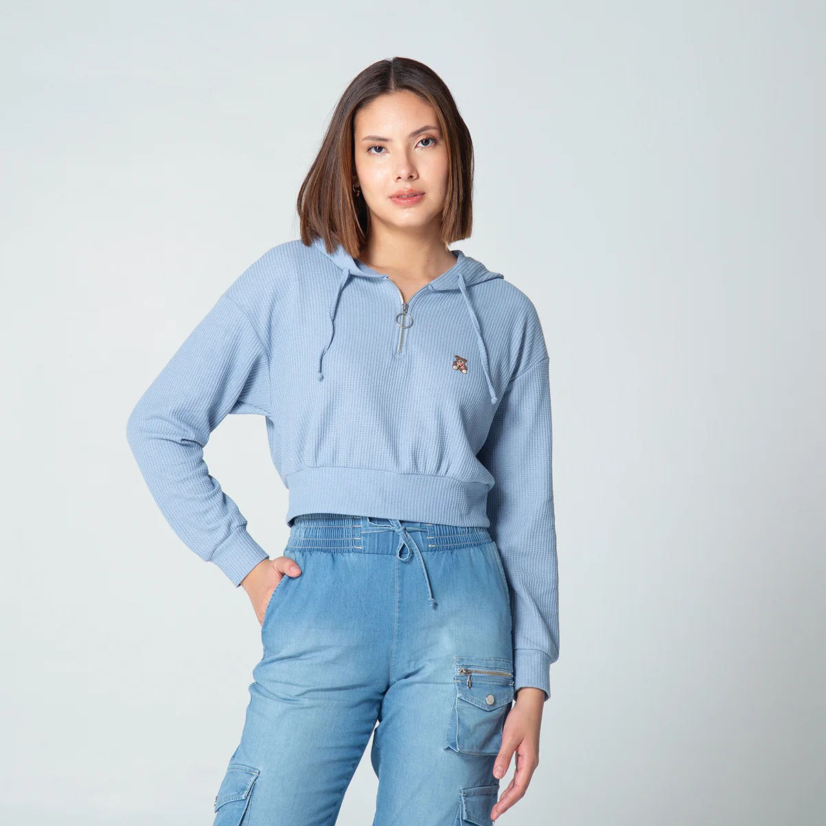 Añade un toque distintivo con un elegante bordado ubicado en el lado derecho, además cuenta con manga larga y hombro caído, realzando la sensación de confort y modernidad.