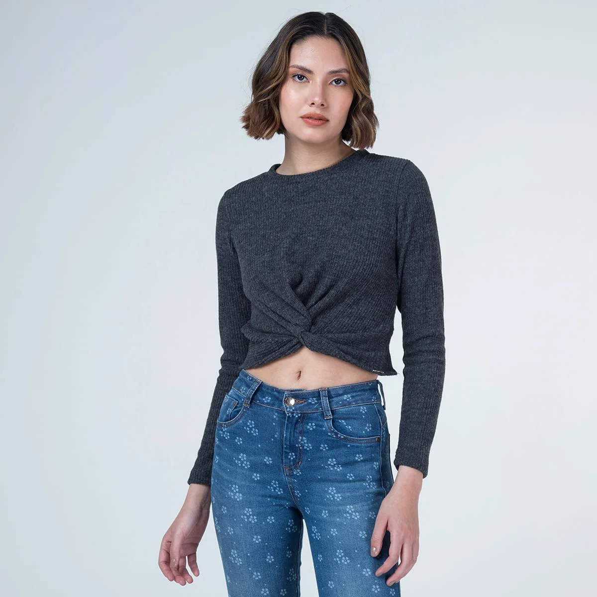 Buzo Shik corto de cuello redondo, manga larga perfecto para combinar con tus looks casuales. Buzo para mujer con detalle de anudado en cintura que le dan un toque de originalidad y estilo.