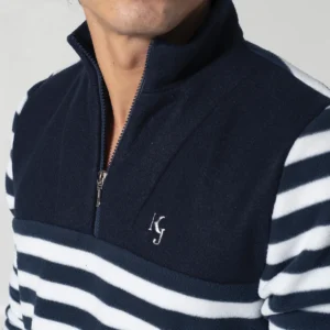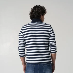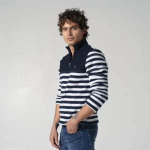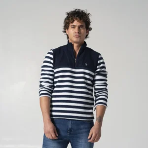 Buzo cerrado Line silueta regular cómoda y moderna, destacándose por su diseño con un canesú en contraste en la parte superior que enmarca una pechera y un cuello alto que se ajusta mediante una cremallera; cuenta con manga larga terminada en ruedo con elástico y tanca para permitir un ajuste personalizado y se completa con un elegante bordado ubicado en el delantero izquierdo a la altura del pecho.