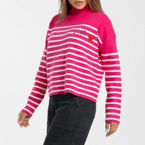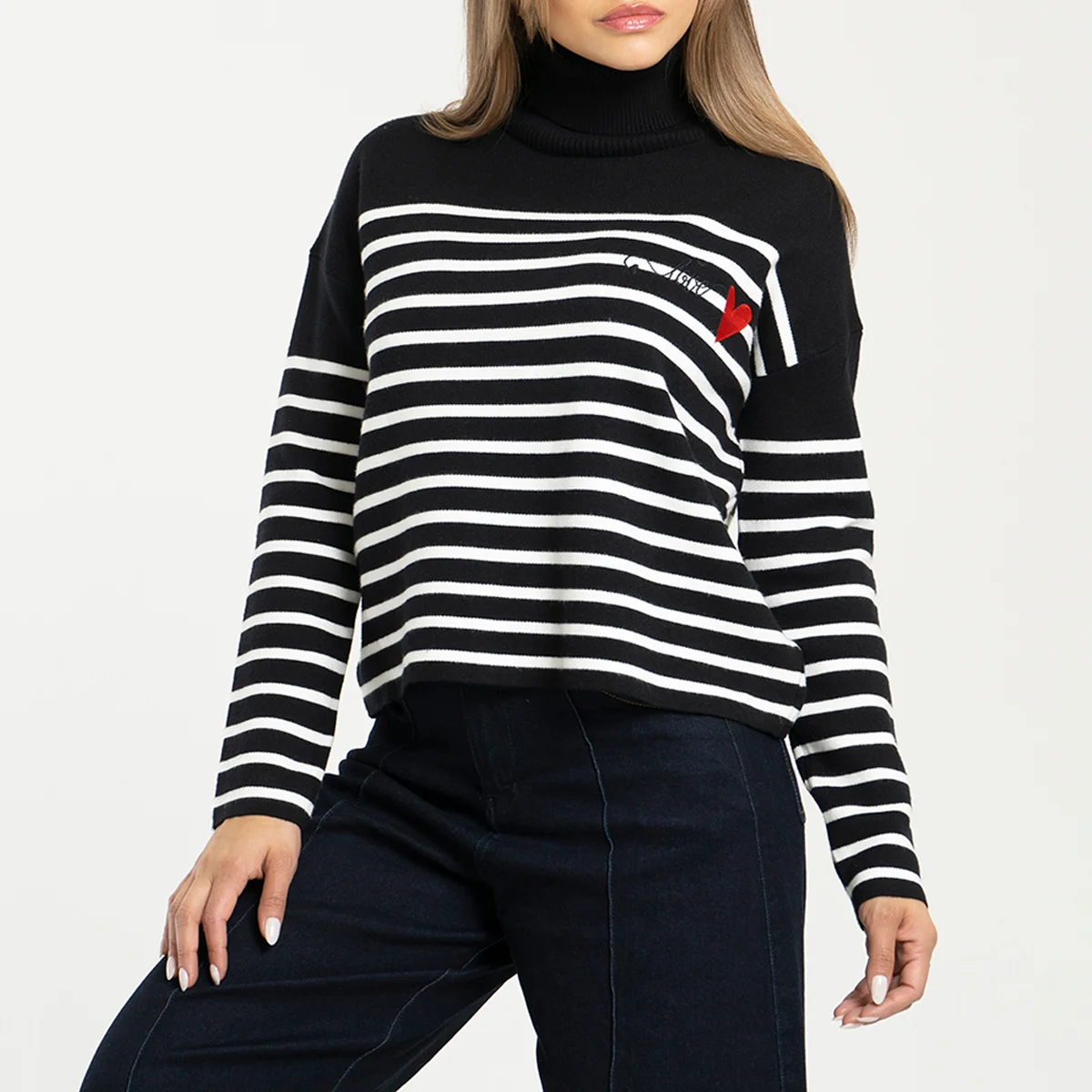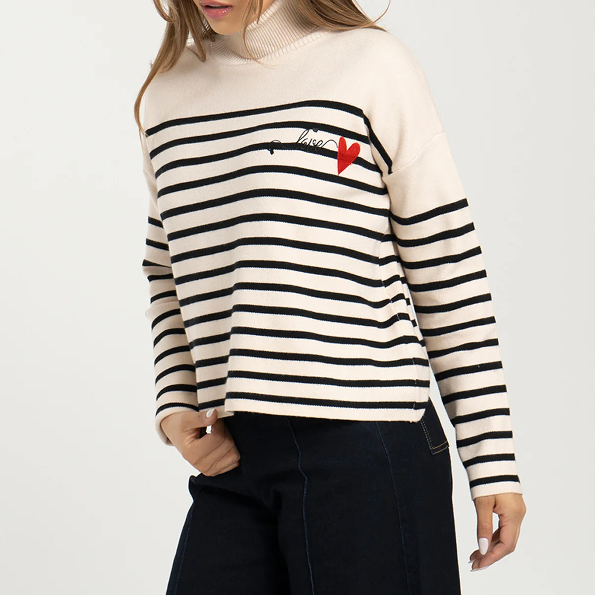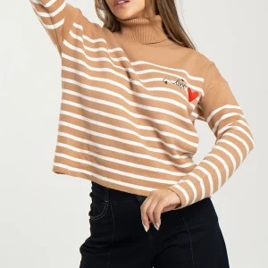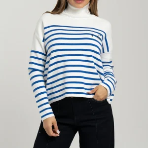 Buzo tejido Luccia manga larga, oversize, cuello alto con detalle bordado en su parte frontal superior izquierdo.