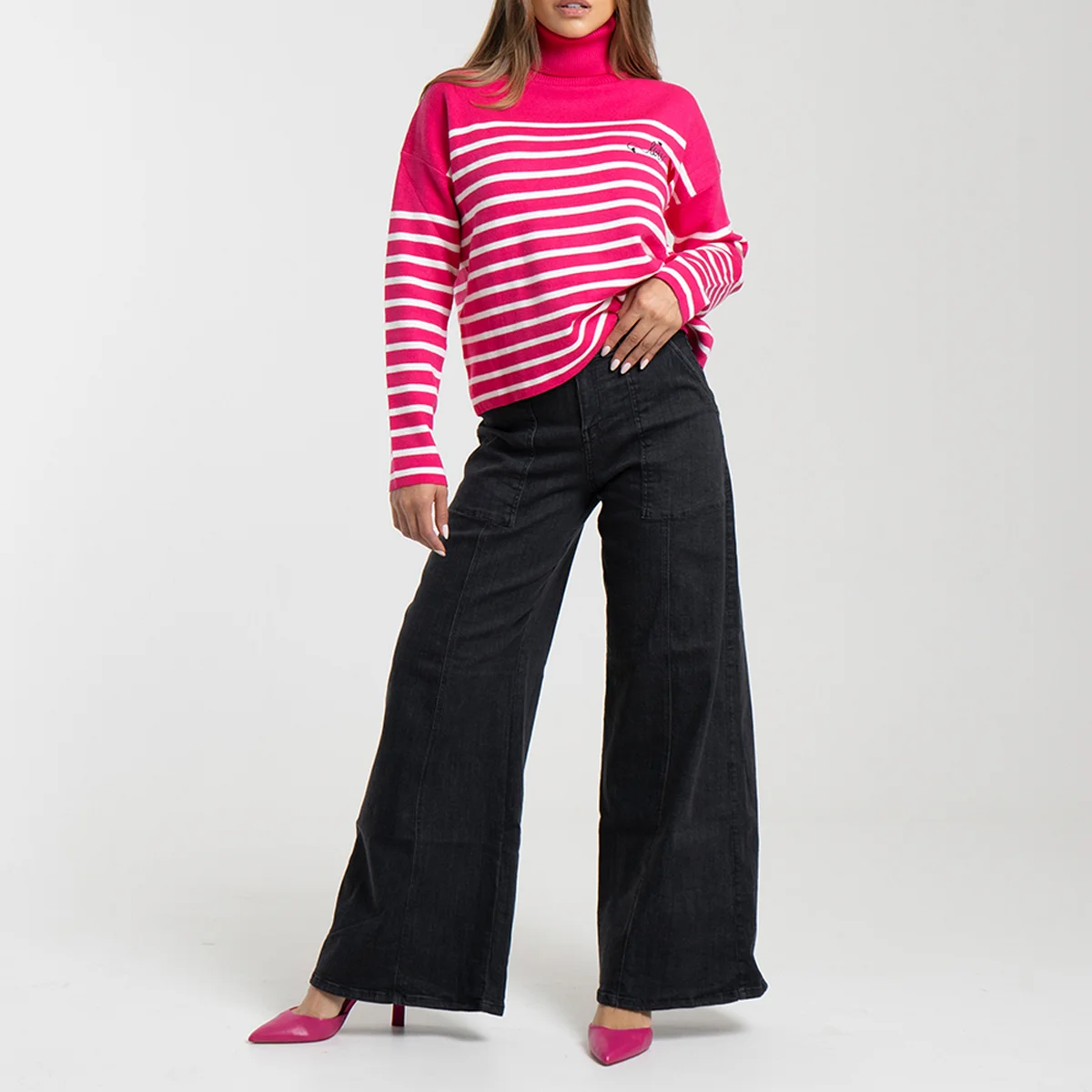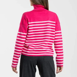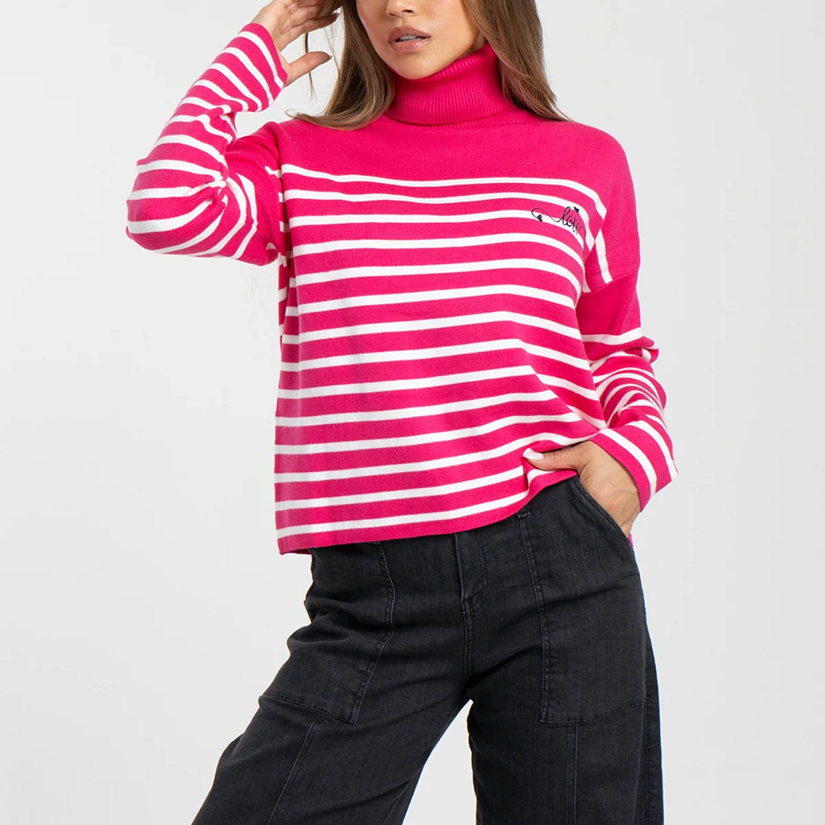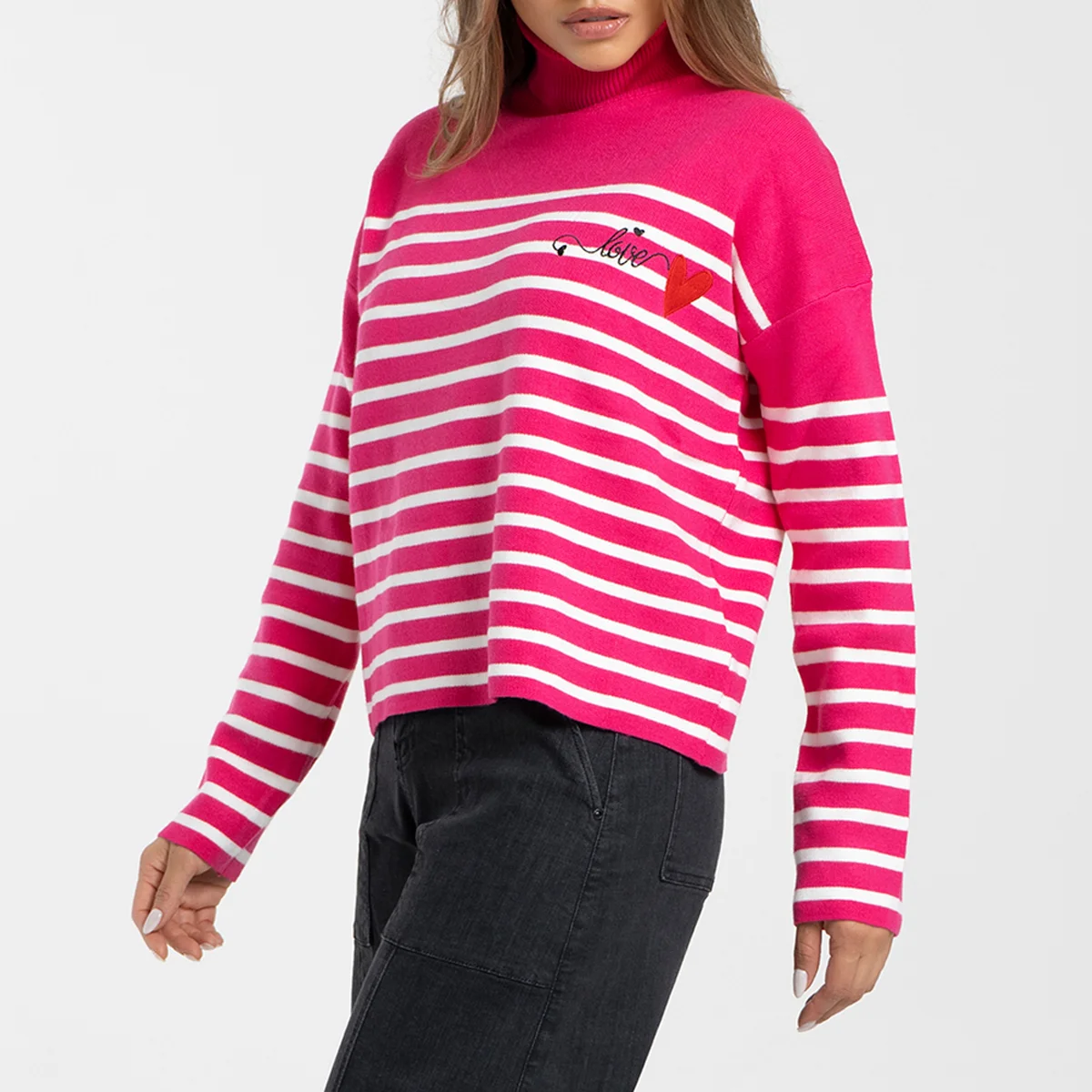 Buzo tejido Luccia manga larga, oversize, cuello alto con detalle bordado en su parte frontal superior izquierdo.