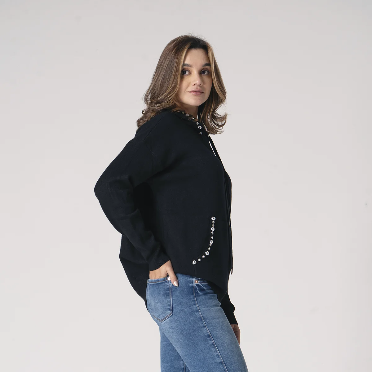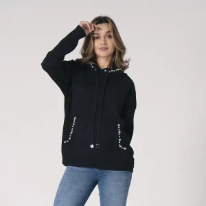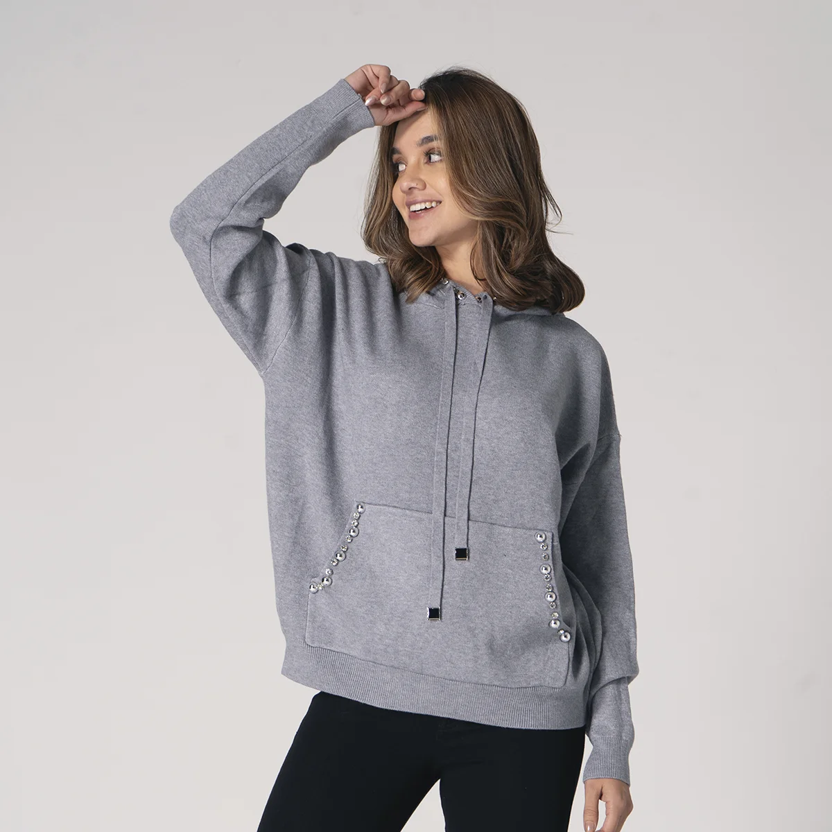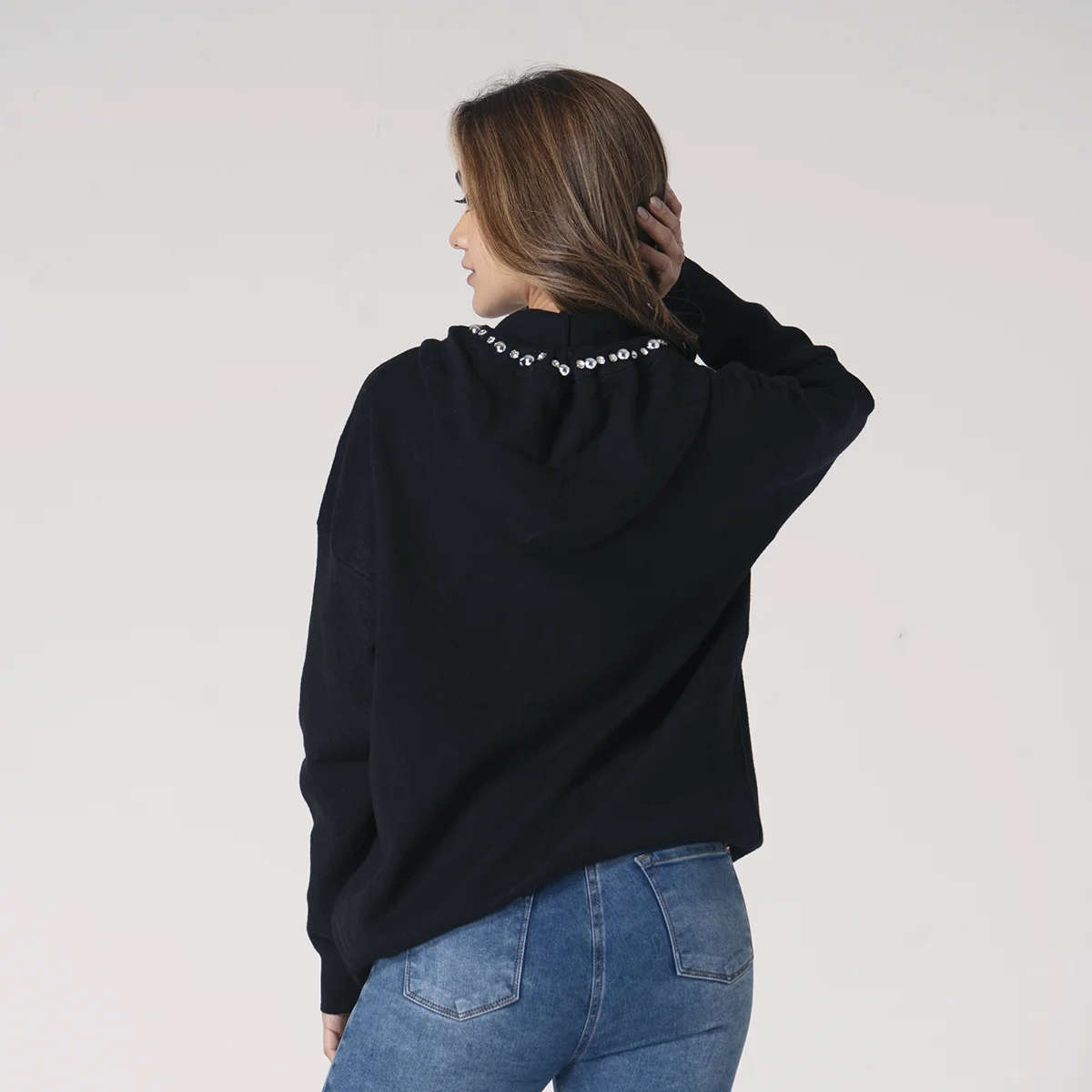 Buzo hilo Rebecca con capota y decoración de brillantes perfecto para mantenerte abrigado y cómodo durante el día, Su capota con canal de cordón de ajuste te permitirá protegerte del viento y la lluvia. En este hoodie el bolsillo tipo canguro y con brillantes en la parte frontal te brindará espacio para guardar tus manos o llevar contigo tus objetos personales de forma segura. Además, su pretina y puños en rib le dan un toque moderno y deportivo a tu outfit. ¡Sin duda, una prenda básica e imprescindible para tu guardarropa!