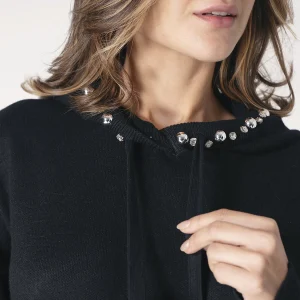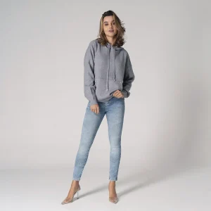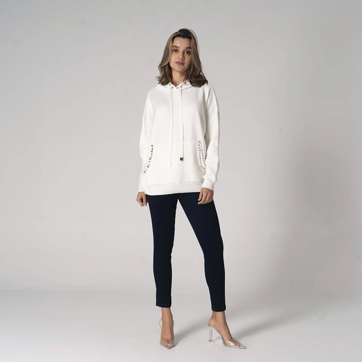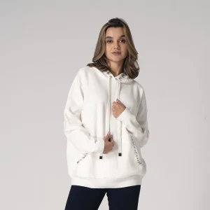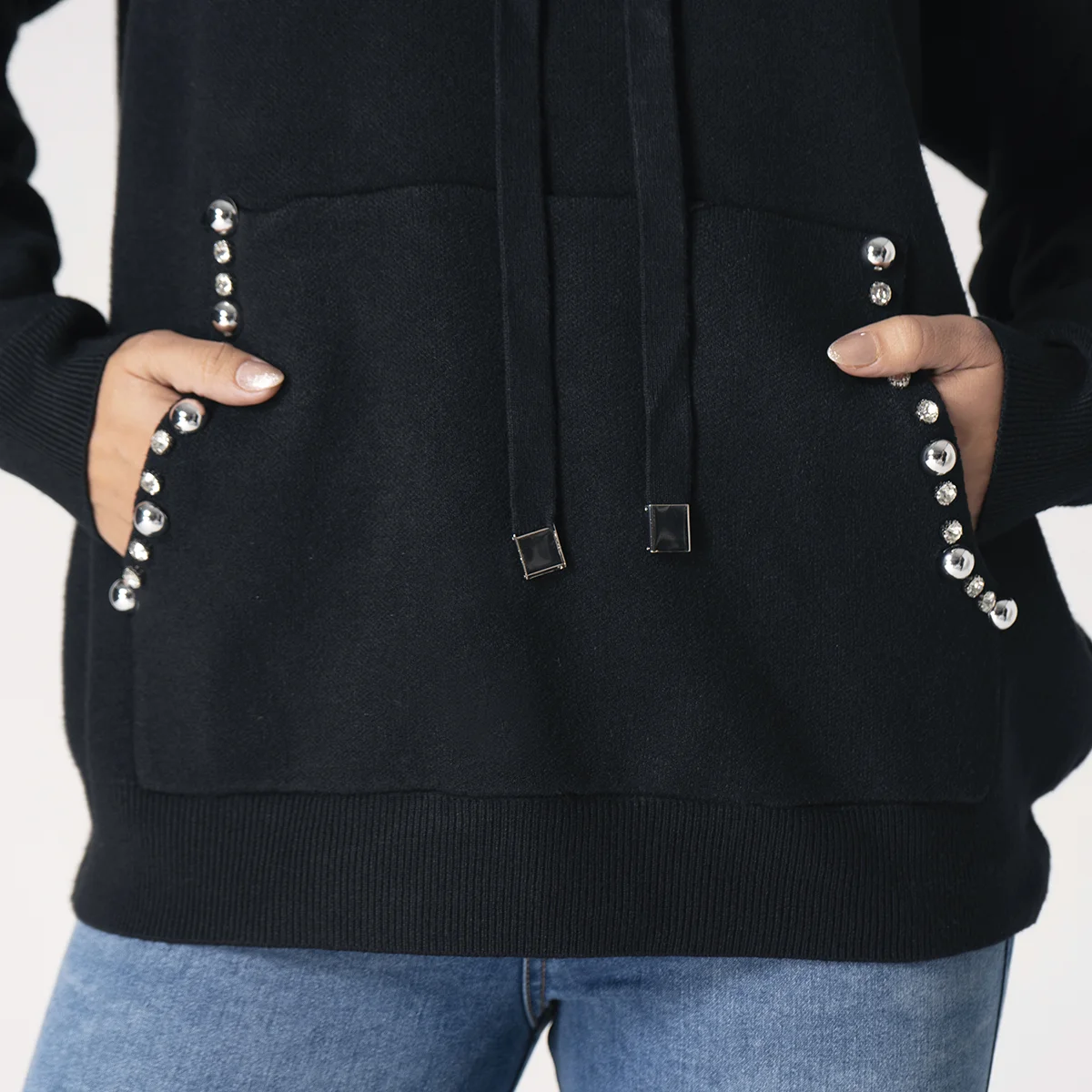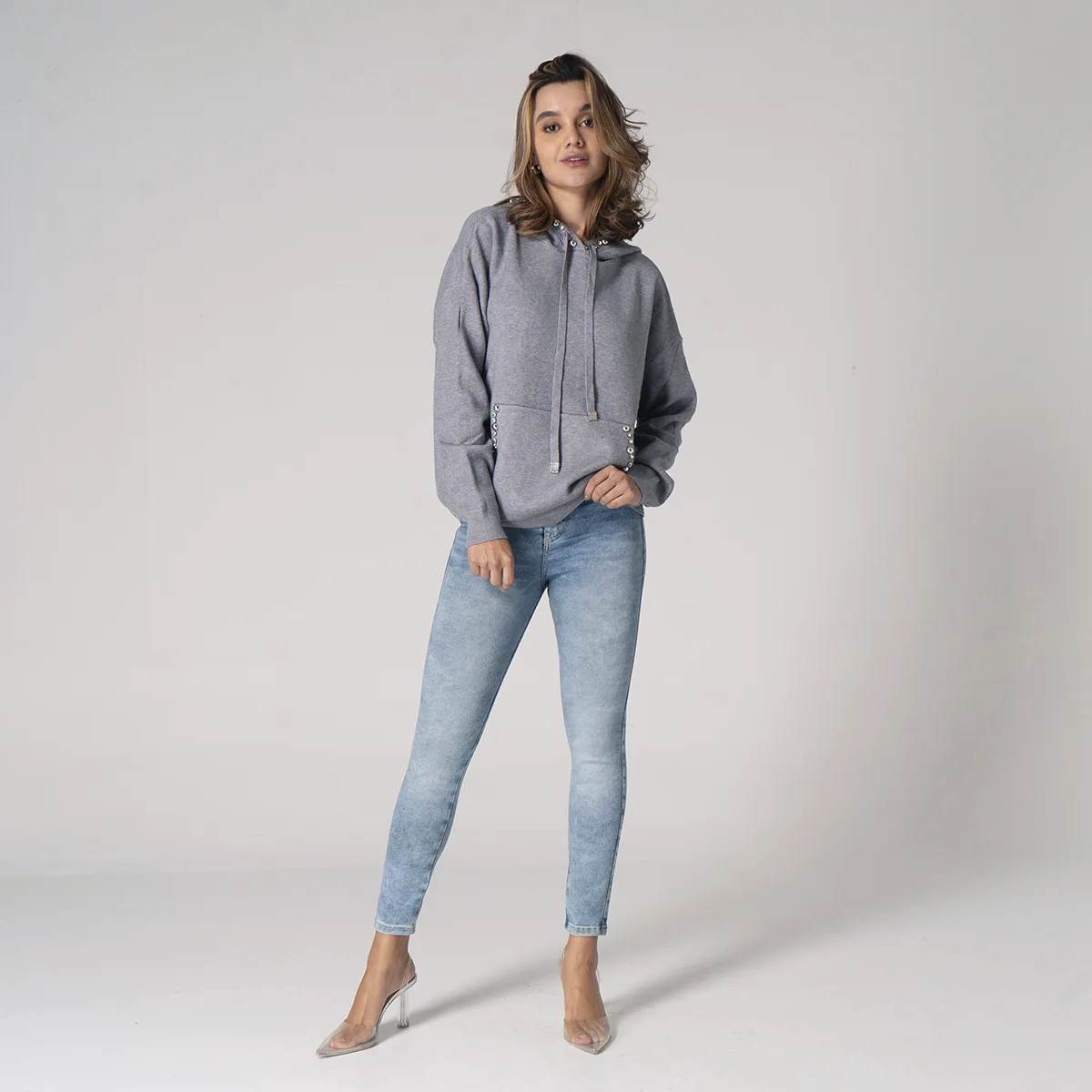 Buzo hilo Rebecca con capota y decoración de brillantes perfecto para mantenerte abrigado y cómodo durante el día, Su capota con canal de cordón de ajuste te permitirá protegerte del viento y la lluvia. En este hoodie el bolsillo tipo canguro y con brillantes en la parte frontal te brindará espacio para guardar tus manos o llevar contigo tus objetos personales de forma segura. Además, su pretina y puños en rib le dan un toque moderno y deportivo a tu outfit. ¡Sin duda, una prenda básica e imprescindible para tu guardarropa!