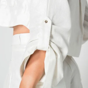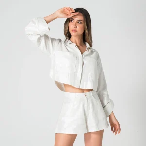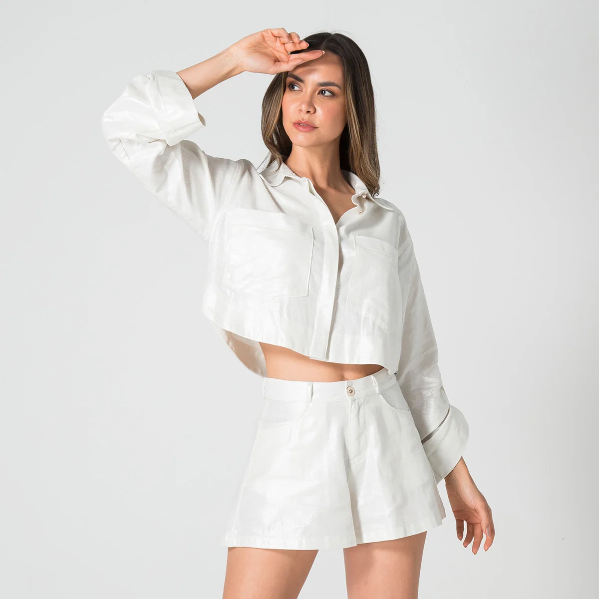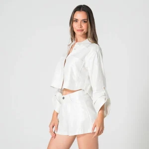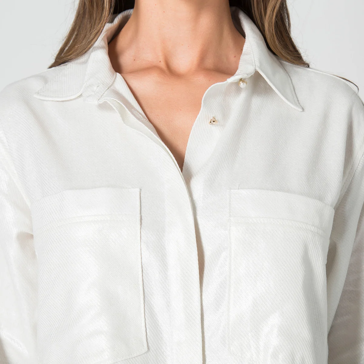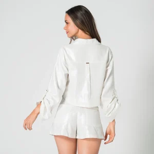 Camichaqueta Gilded es una prenda elegante y versátil, ideal para diferentes ocasiones. Cuenta con un escote redondo que le brinda un toque clásico y sofisticado. Sus mangas son tres cuartos, lo que la hace perfecta para transiciones de temperatura y le aporta un estilo moderno. En la parte frontal, dispone de bolsillos a la altura del pecho, que no solo añaden un elemento práctico, sino que también realzan su diseño. El sistema de cierre es mediante una botonadura, lo que permite un ajuste cómodo y seguro, además de contribuir a su apariencia estilizada.