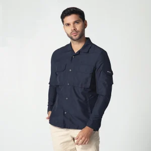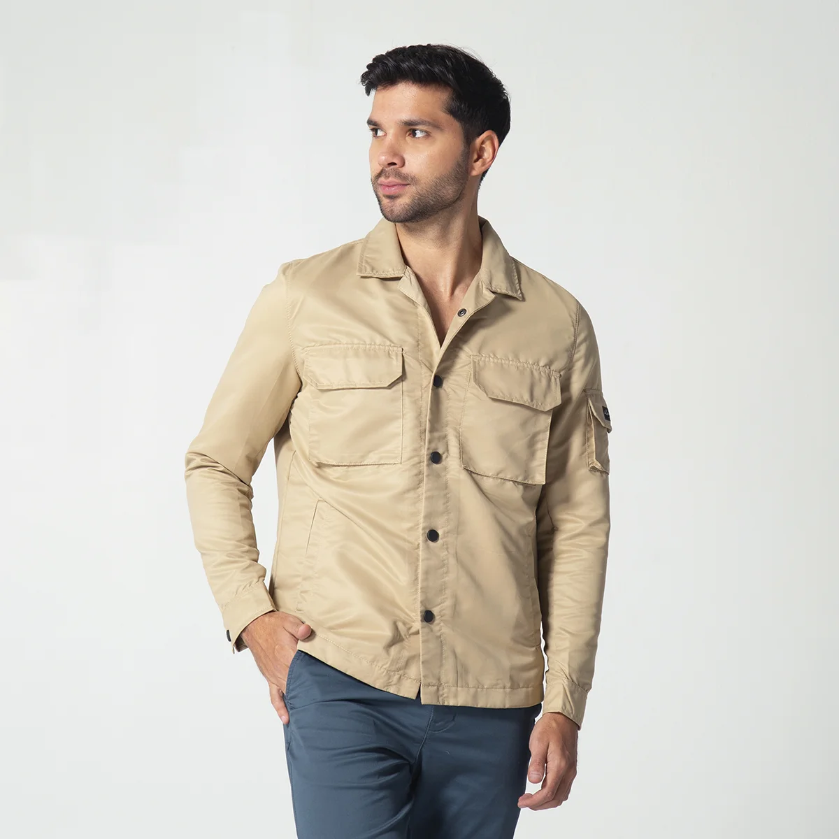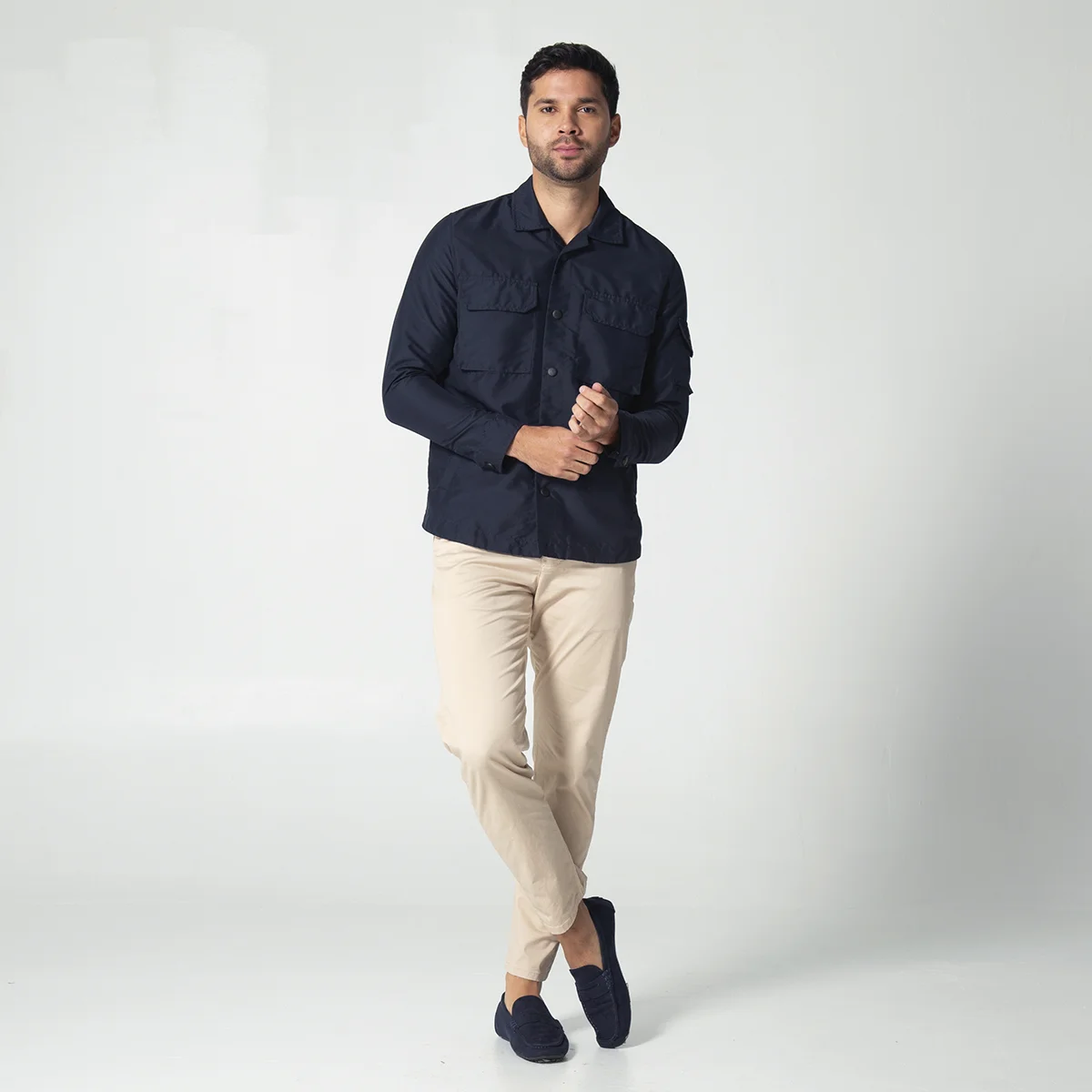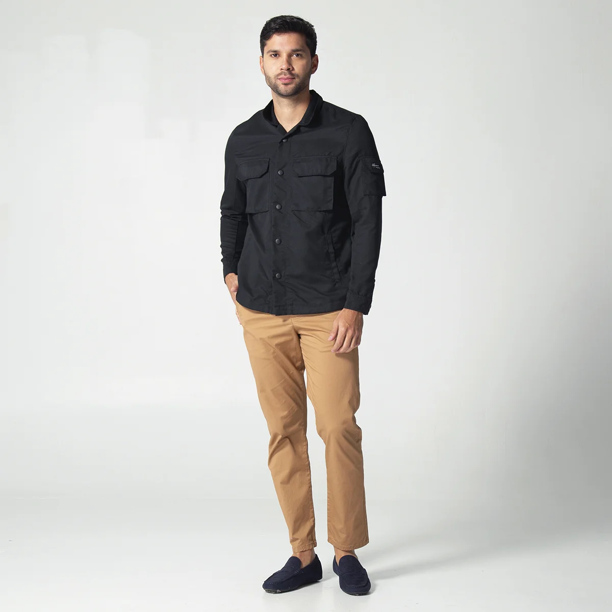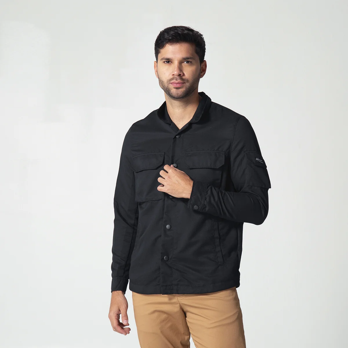 Camichaqueta music presenta una silueta regular, diseñada para un ajuste cómodo y estilizado. Tiene un cuello camisero que le da un toque clásico y versátil. Está confeccionada con manga larga, terminada en puños con cierre de broche para mayor ajuste y protección. En la parte frontal, cuenta con un sistema de cierre de broche que facilita su uso y añade un detalle de estilo. Incluye bolsillos en la parte delantera a la altura del pecho, con cierre de tapa para mayor seguridad, así como bolsillos en la cintura con ribete que aportan un toque decorativo y funcional. Además, dispone de un bolsillo en la manga izquierda, también con cierre de tapa, para guardar pequeños objetos de manera segura.