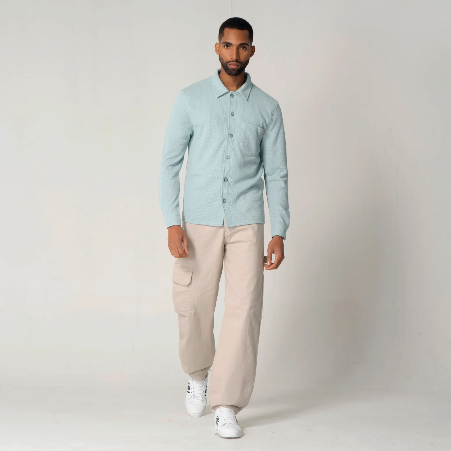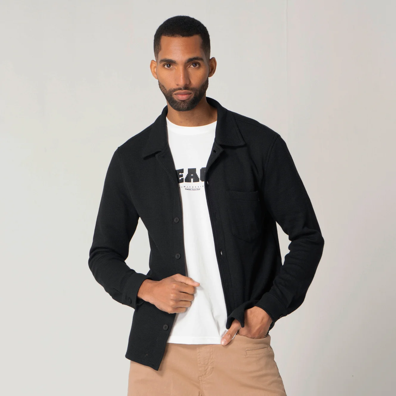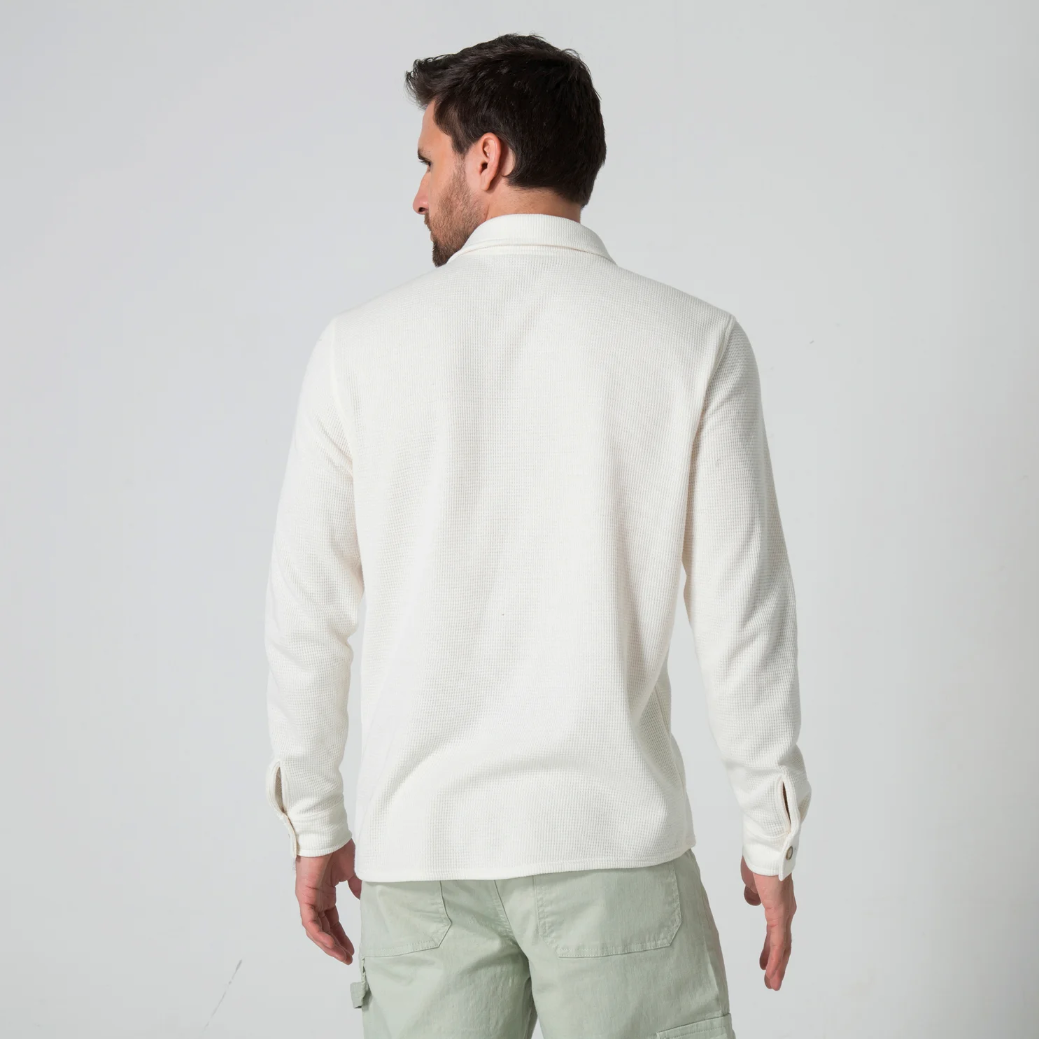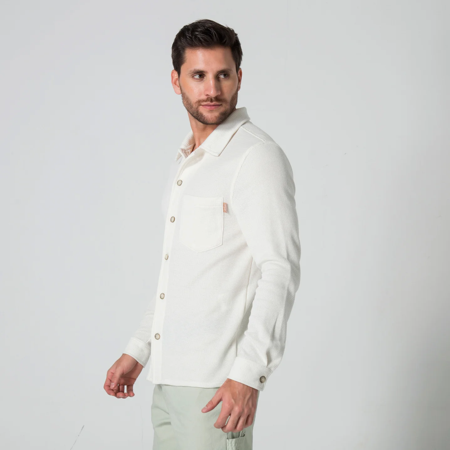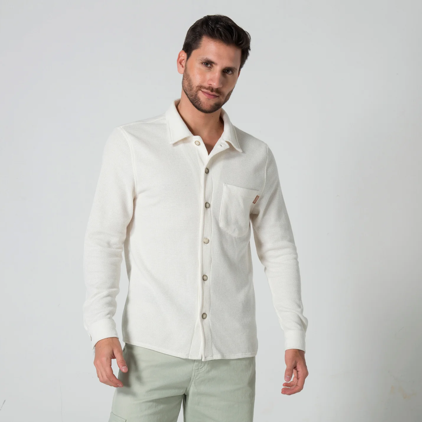 Camichaqueta Bass silueta slim es una prenda elegante y moderna que destaca por su diseño sofisticado. Su cuello camisero aporta un toque clásico, mientras que las mangas largas con puño de cruce de botón ofrecen un detalle distintivo que realza su estilo.