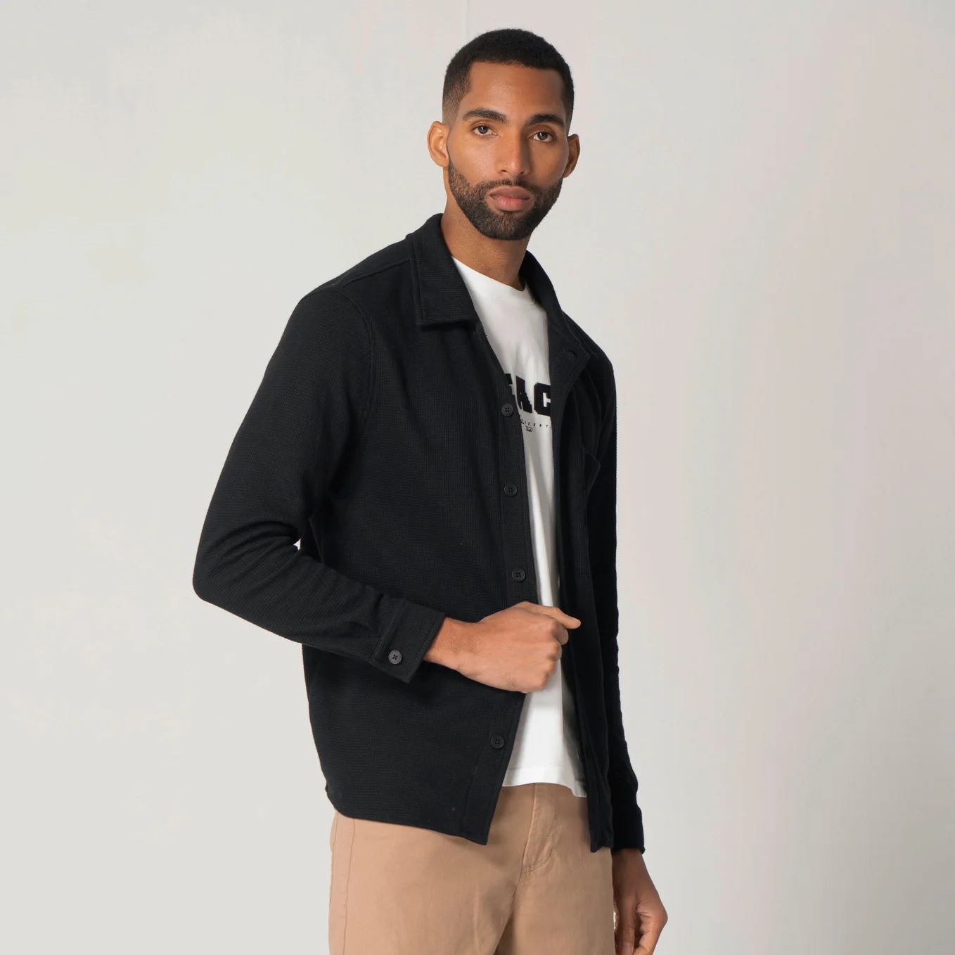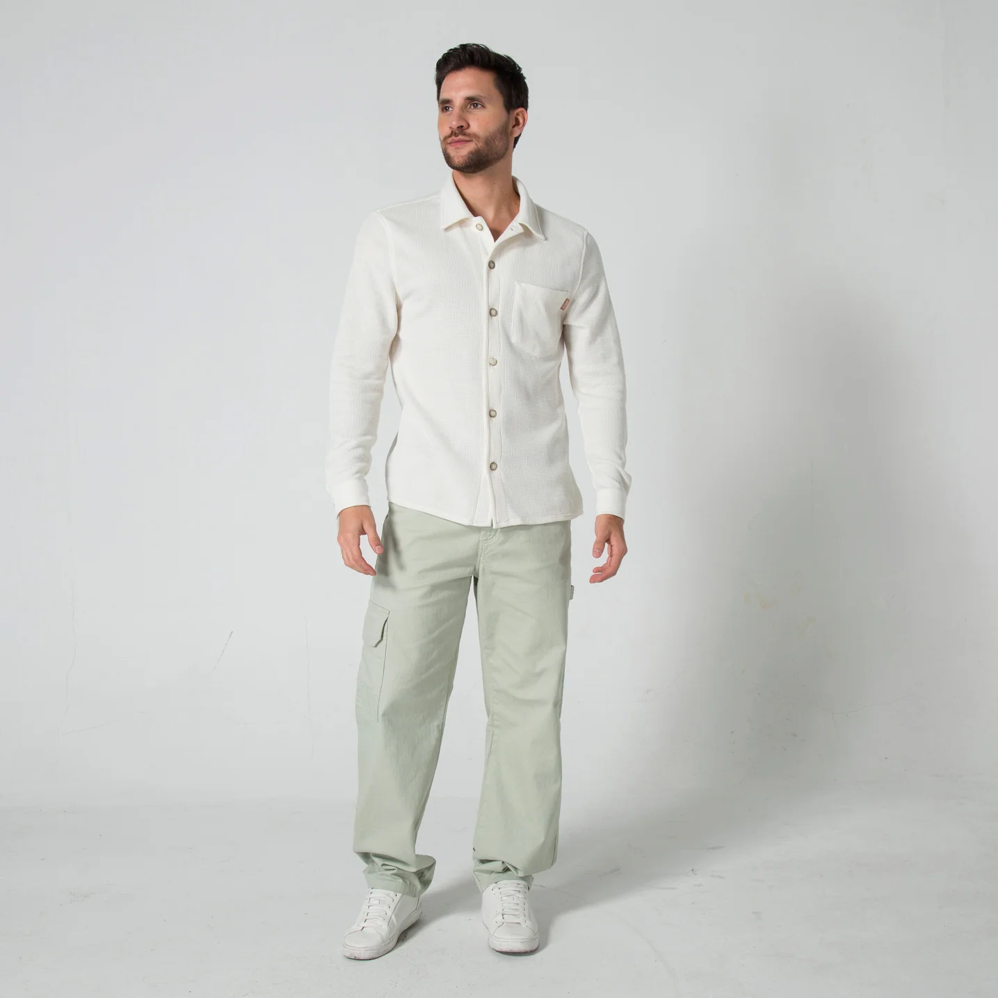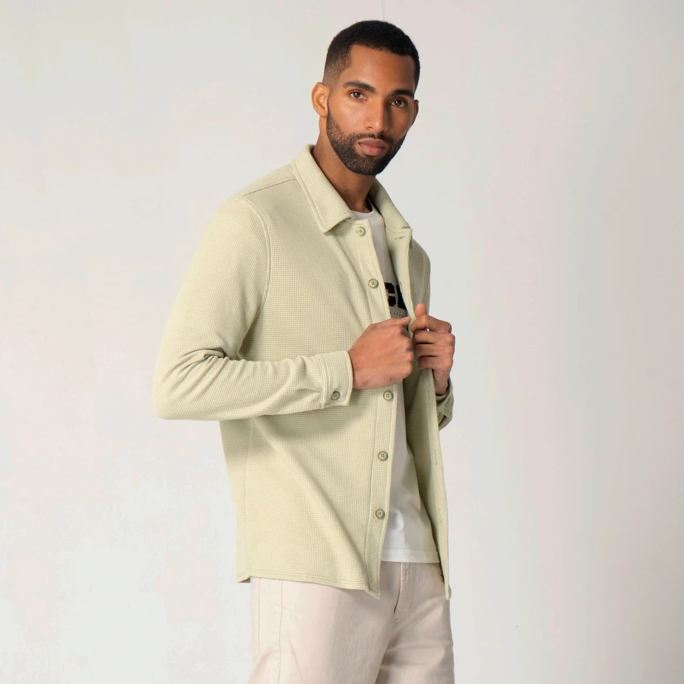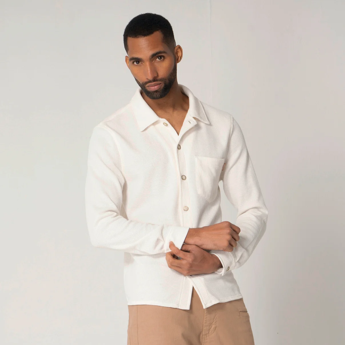 Camichaqueta Bass silueta slim es una prenda elegante y moderna que destaca por su diseño sofisticado. Su cuello camisero aporta un toque clásico, mientras que las mangas largas con puño de cruce de botón ofrecen un detalle distintivo que realza su estilo.
