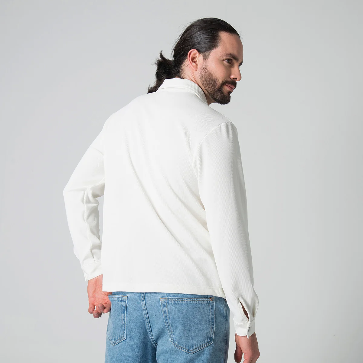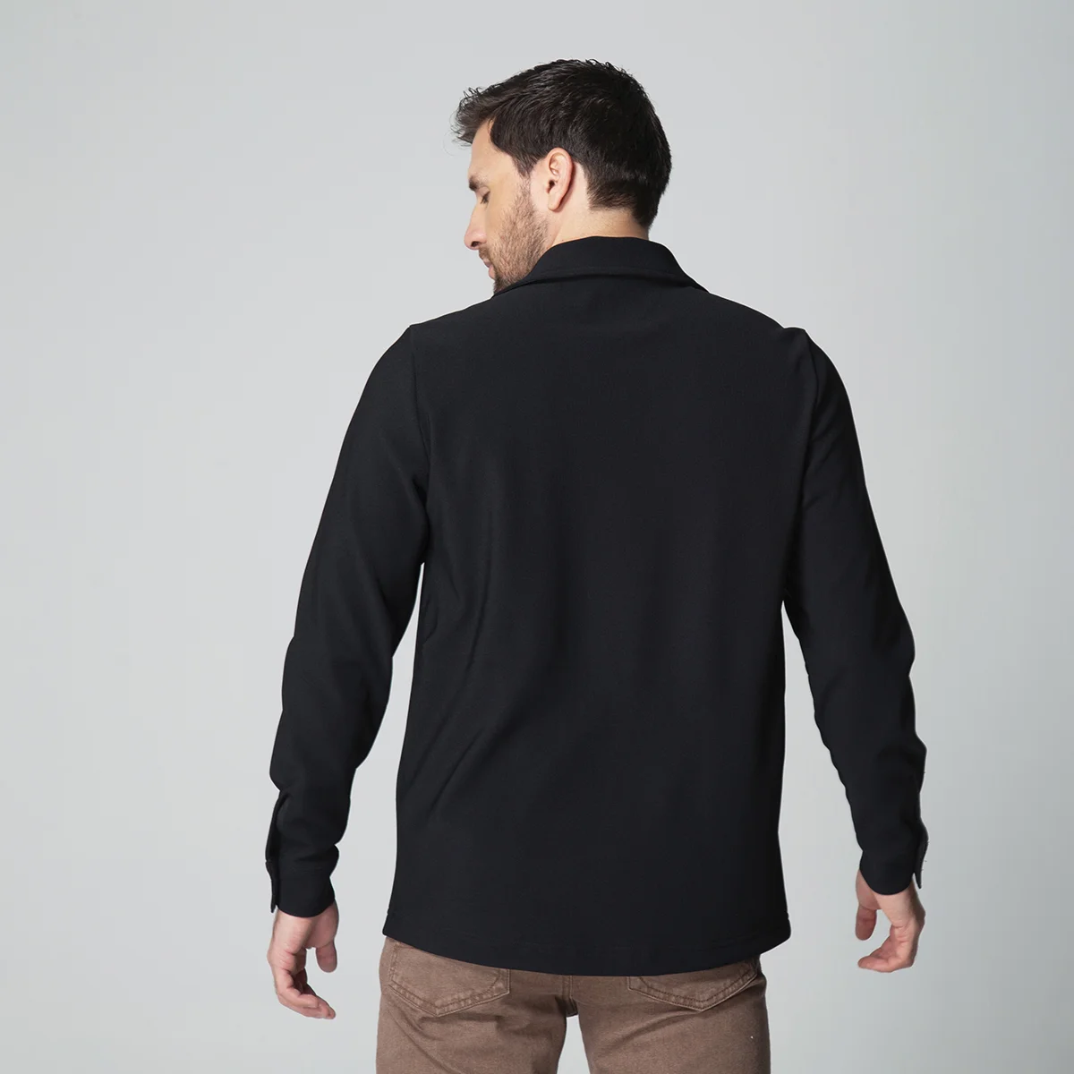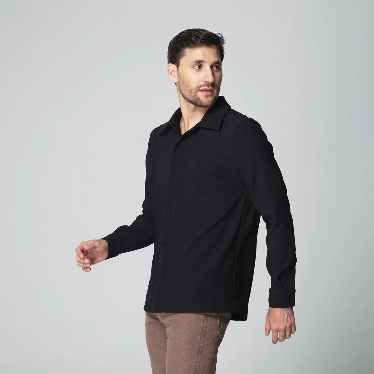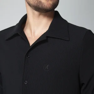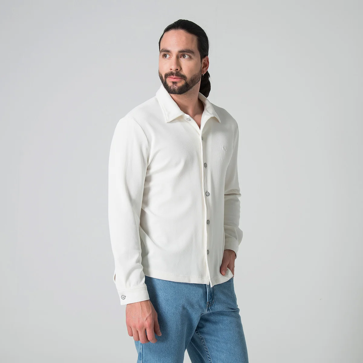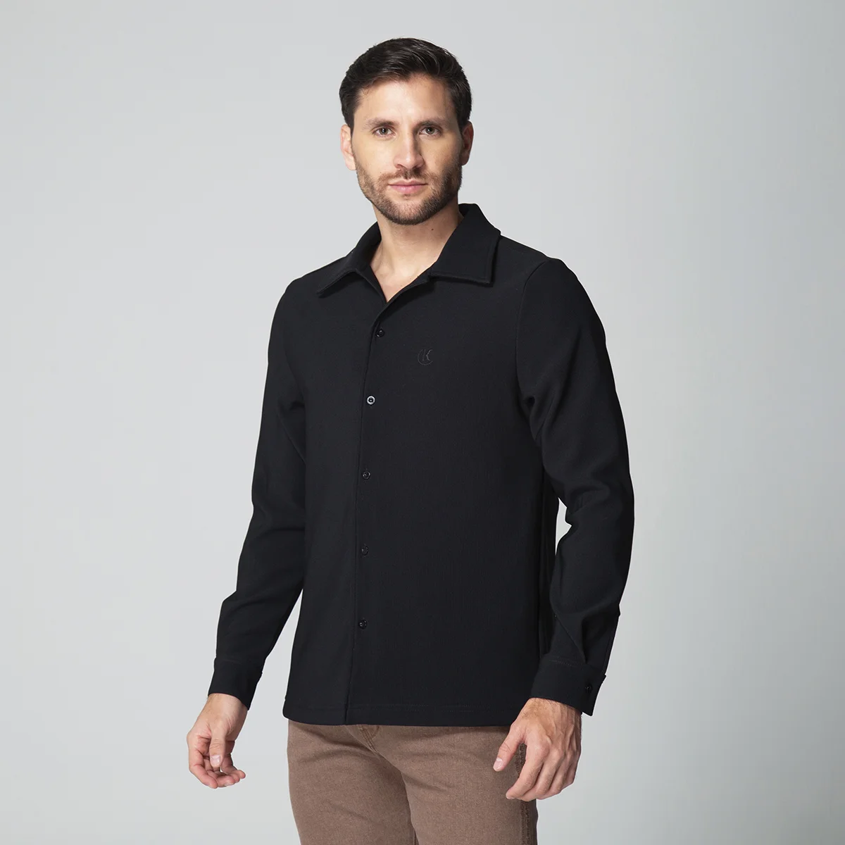 Camisa Kenblack presenta un elegante diseño con cuello camisero y manga larga, ideal para un estilo sofisticado y clásico. Cuenta con puños en las mangas y un cierre frontal compuesto por botones que facilitan su ajuste y apertura. El sistema de cierre en la parte frontal también está equipado con botones, asegurando comodidad y un aspecto pulido en cualquier ocasión.