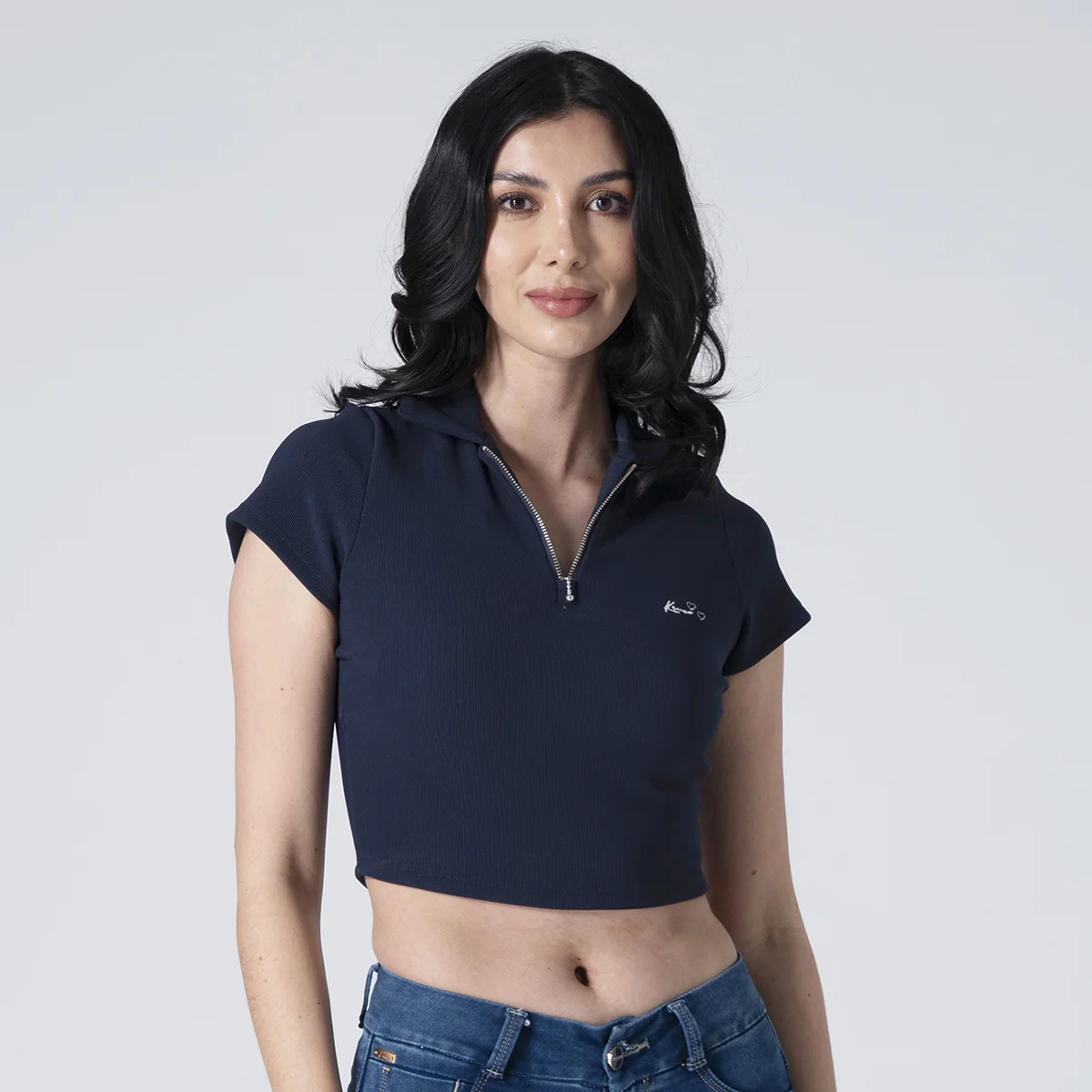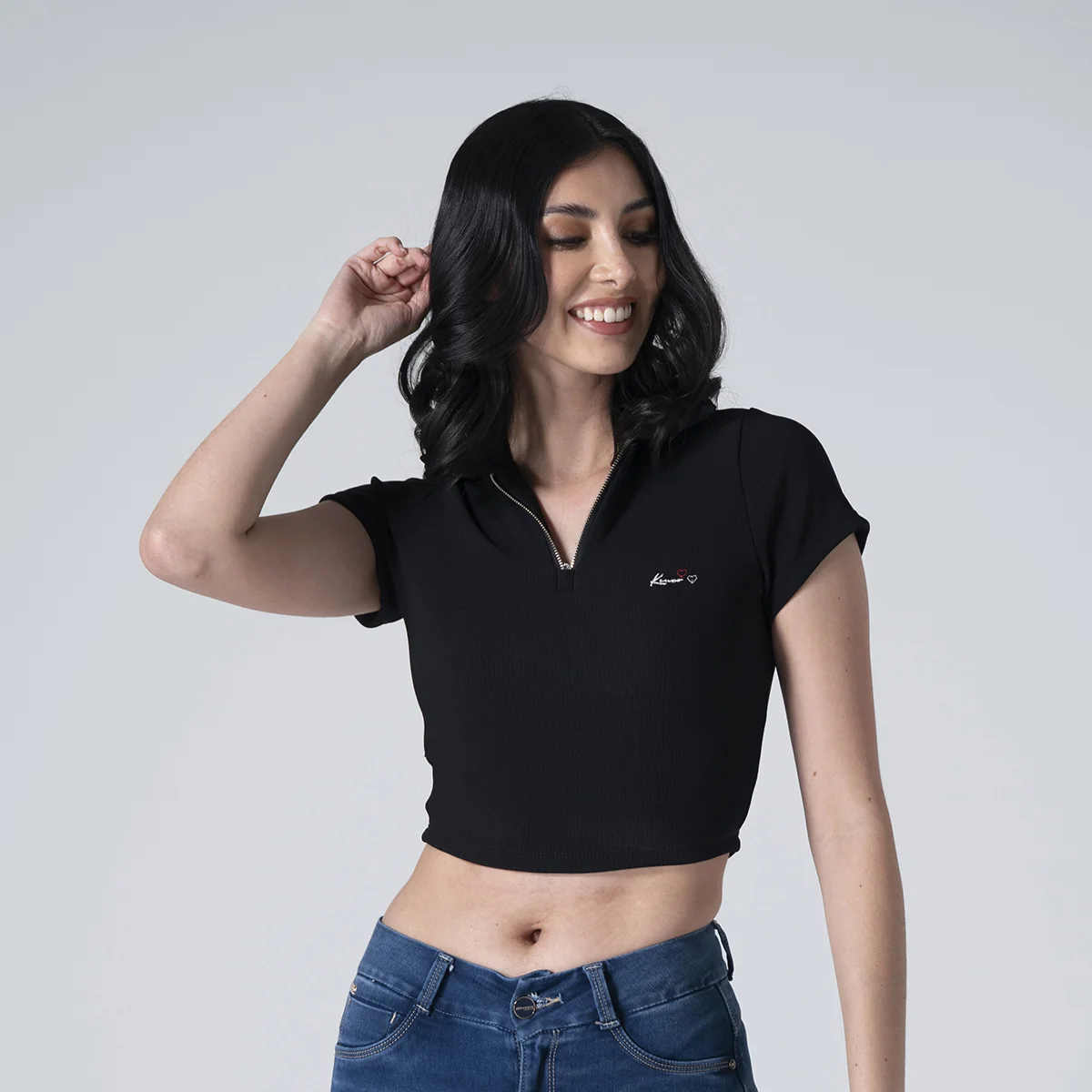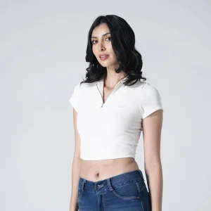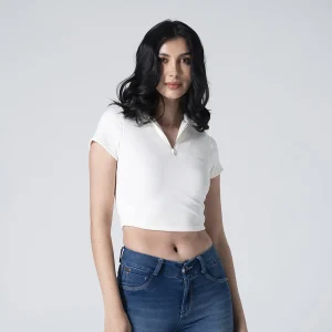 Blusa crop Beat silueta slim, diseñada para ajustarse perfectamente al cuerpo y resaltar la figura. Cuenta con un cuello tipo polo que le brinda un estilo clásico y elegante, y mangas cortas que aportan comodidad y frescura. En la parte frontal, presenta un sistema de cierre mediante cremallera, lo que facilita su puesta y añade un toque moderno a su diseño. Ideal para un look casual y sofisticado.