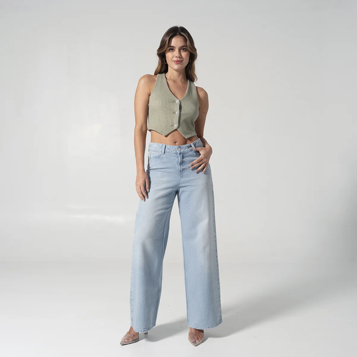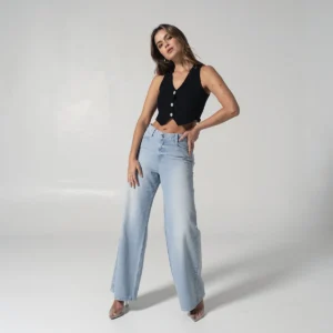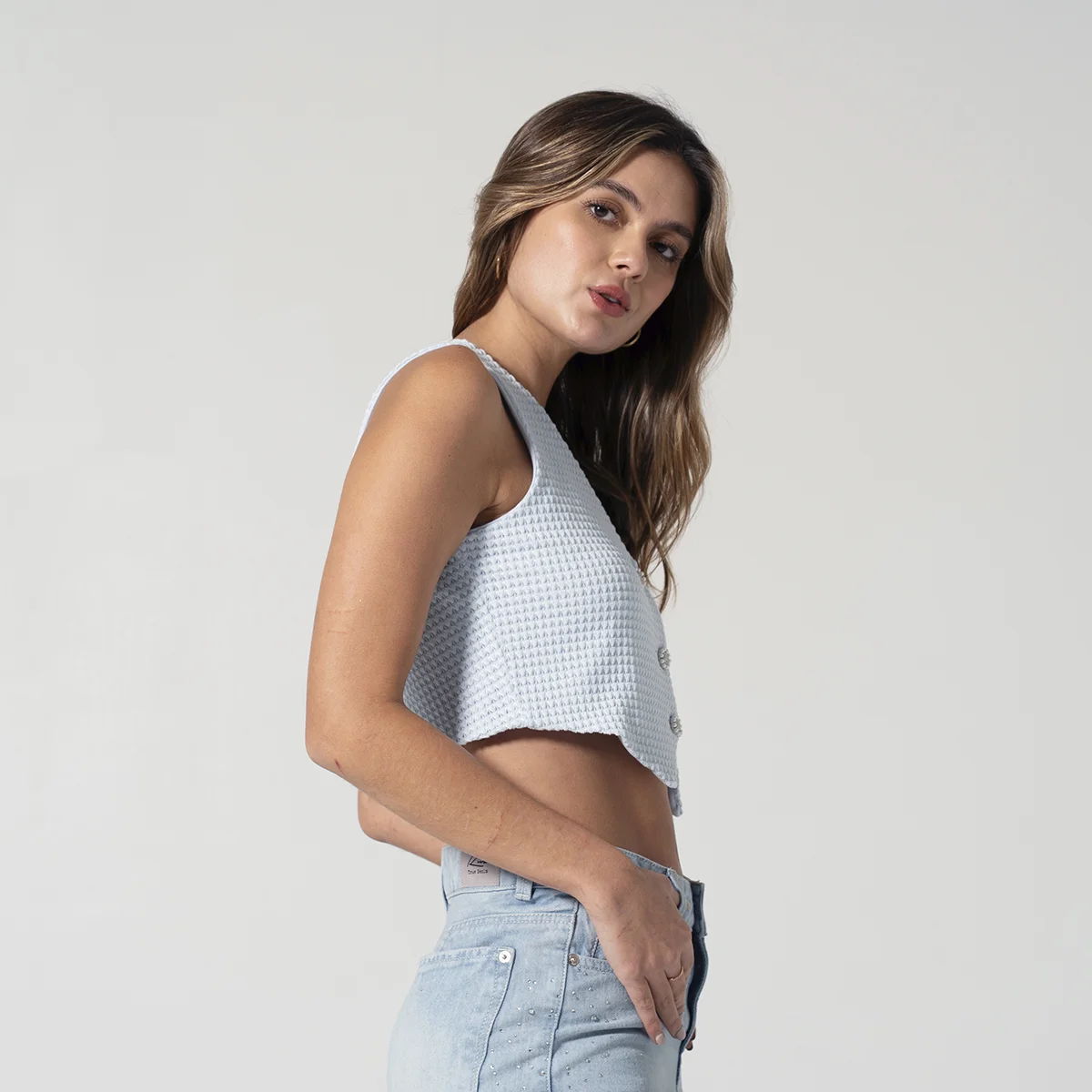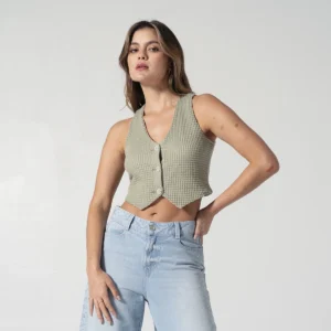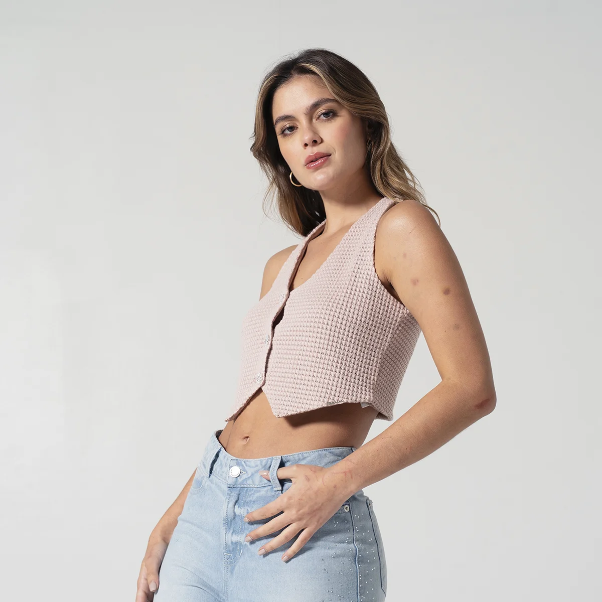 Además, cuenta con un cierre de botón en la parte frontal que facilita su uso y aporta un toque clásico y sofisticado al look. Este chaleco para mujer es perfecto para quienes buscan un estilo pulido y contemporáneo.