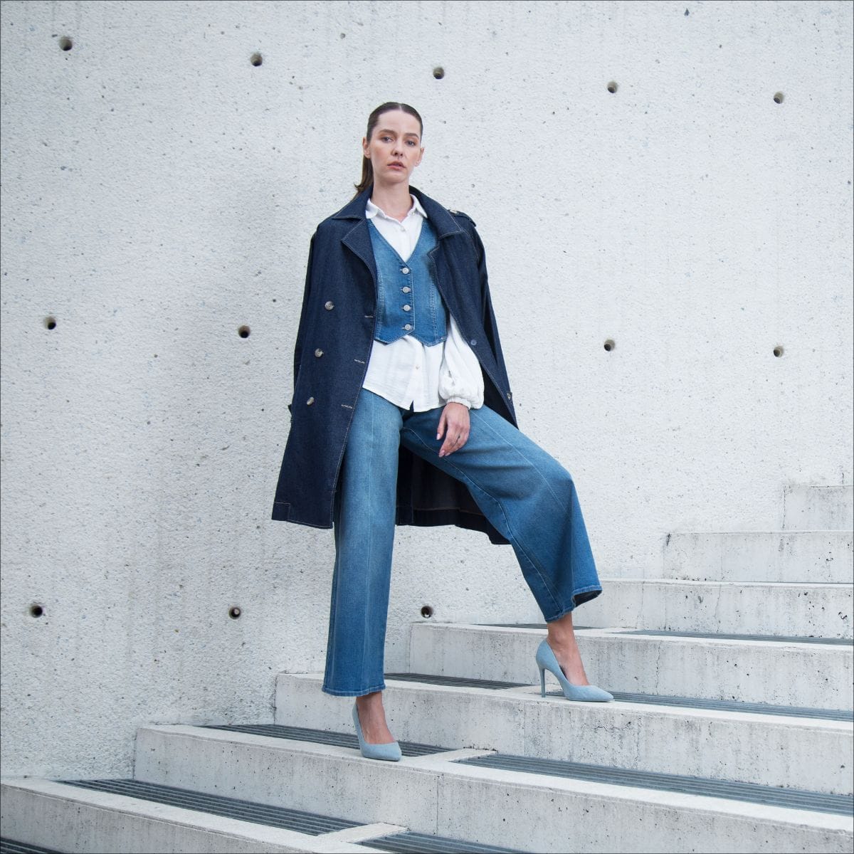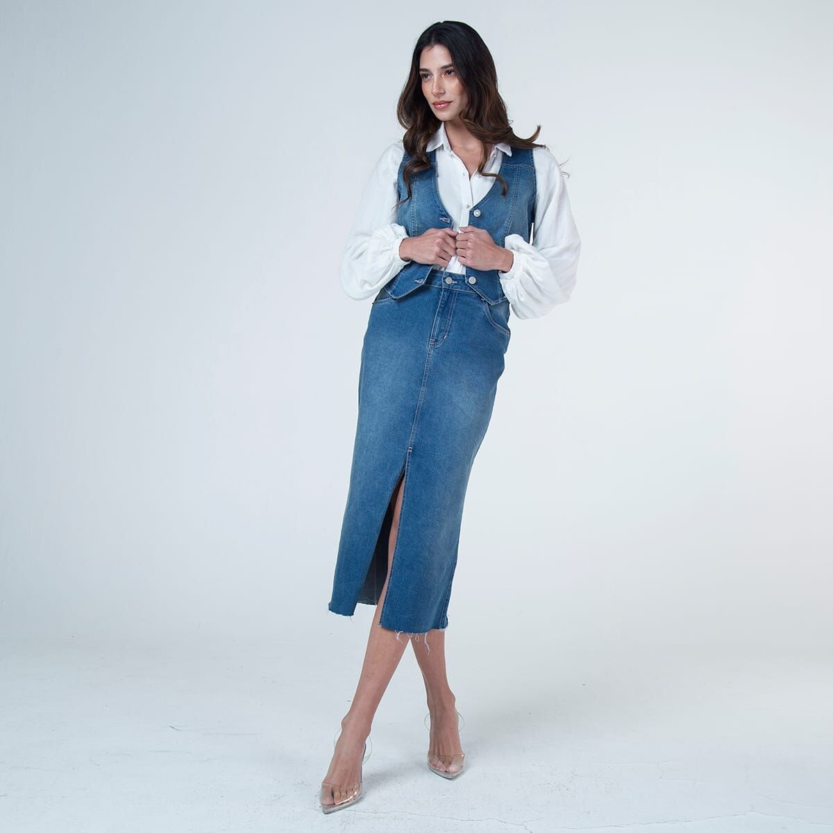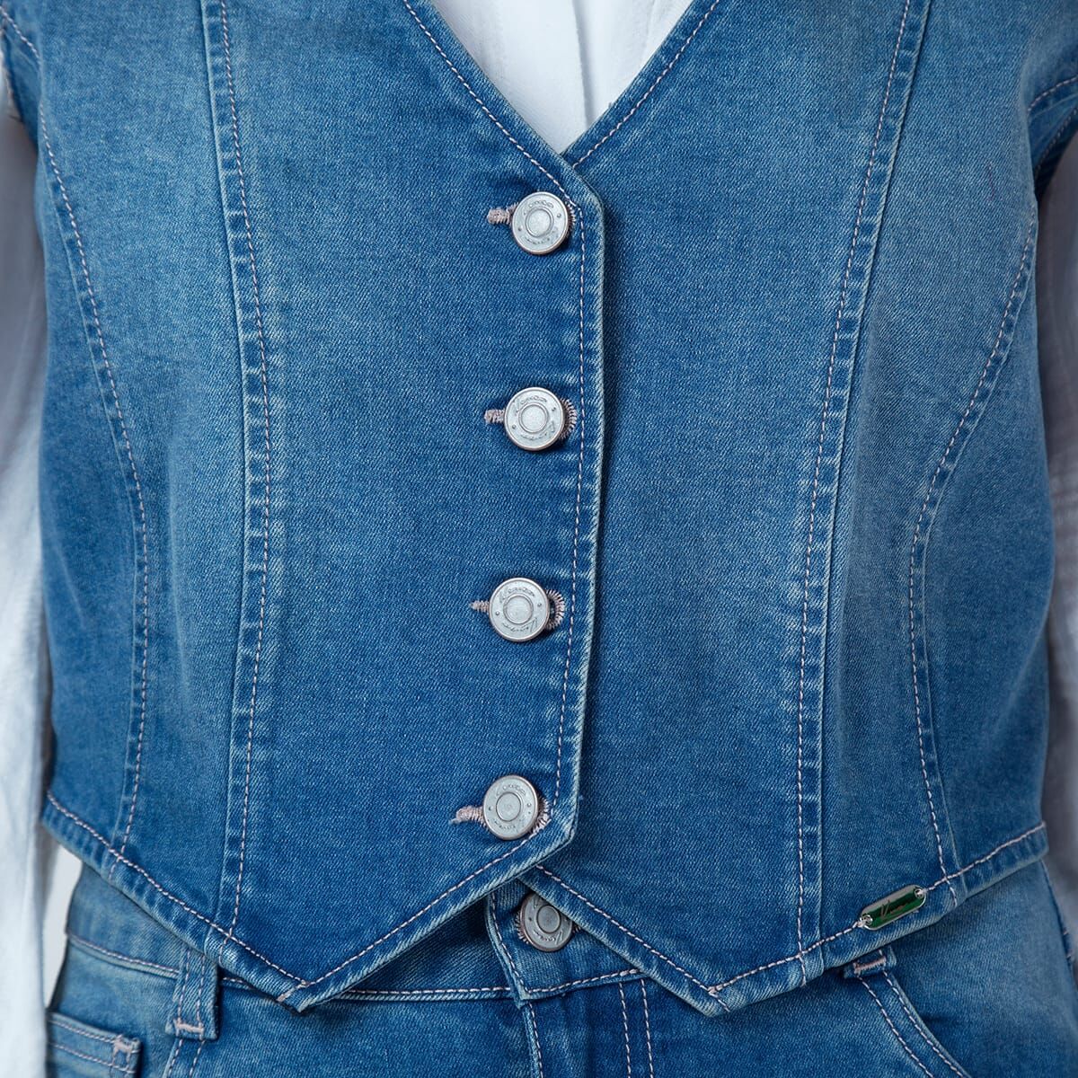 Chaleco corto Renatta en denim de escote en v, manga sisa, estarás lista para cualquier ocasión. Chaleco en Jean para mujer cuenta con cortes de entalle y cierre de botonadura.