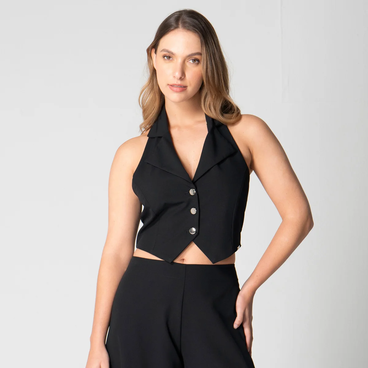 Chaleco Velo que redefine la elegancia con un toque audaz, esta prenda es la fusión perfecta entre la sastrería clásica y una sensual modernidad, cuenta con un clásico cuello solapa con un profundo escote en V que enmarca el torso, aportando un aire formal y estilizado, perfecto para llevar solo o sobre un top, El sistema de cierre frontal es un elegante cruce con botón, asegurando un ajuste impecable y estructurado que simula la formalidad de un chaleco de traje, la parte de la espalda es completamente descubierta, Este detalle inesperado transforma el chaleco de una prenda formal a una pieza llena de sensualidad y estilo, lleva este chaleco para elevar cualquier outfit, desde pantalones de vestir hasta jeans de talle alto.