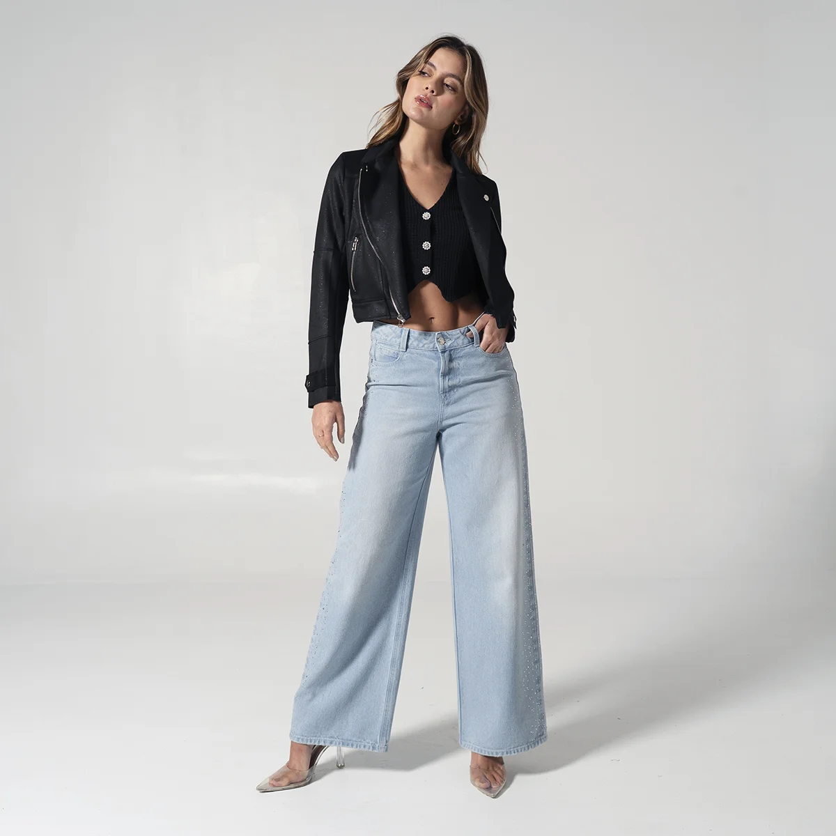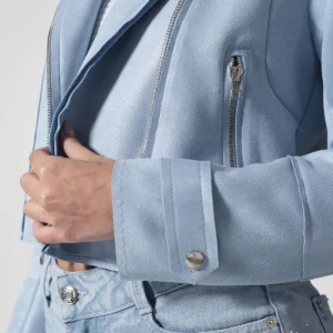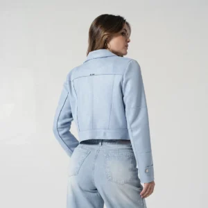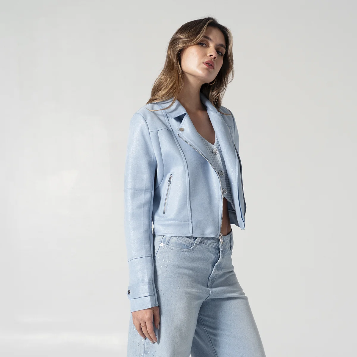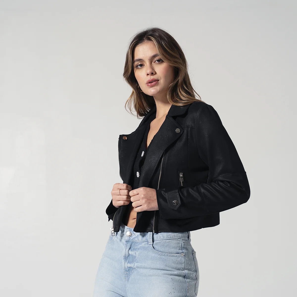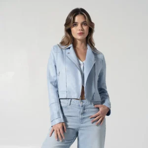 Chaqueta biker Kartiel silueta slim que realza la figura, cuenta con un cuello tipo solapa con cruce que aporta un estilo elegante y moderno, Sus mangas largas están decoradas con charreteras que añaden un toque distintivo y atrevido, El sistema de cierre es con cremallera facilitando su uso y ajuste mientras que en la parte frontal dispone de un bolsillo con cierre de cremallera para mayor funcionalidad y seguridad. Esta chaqueta para mujer es una pieza perfecta para un look urbano y sofisticado.