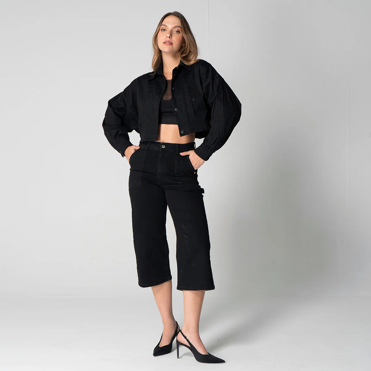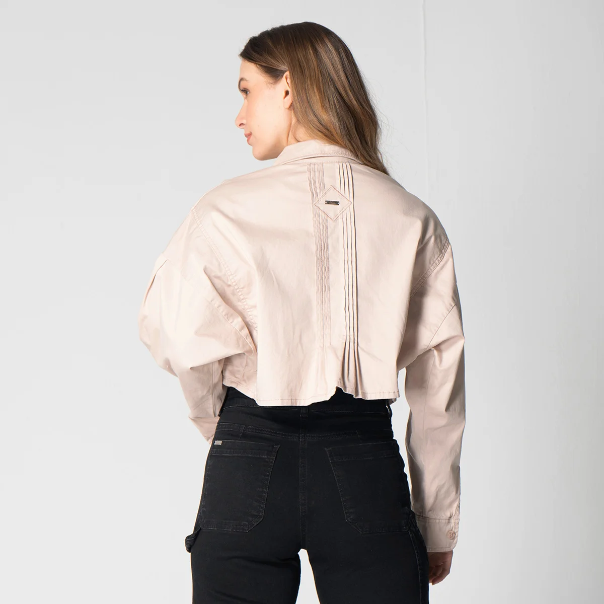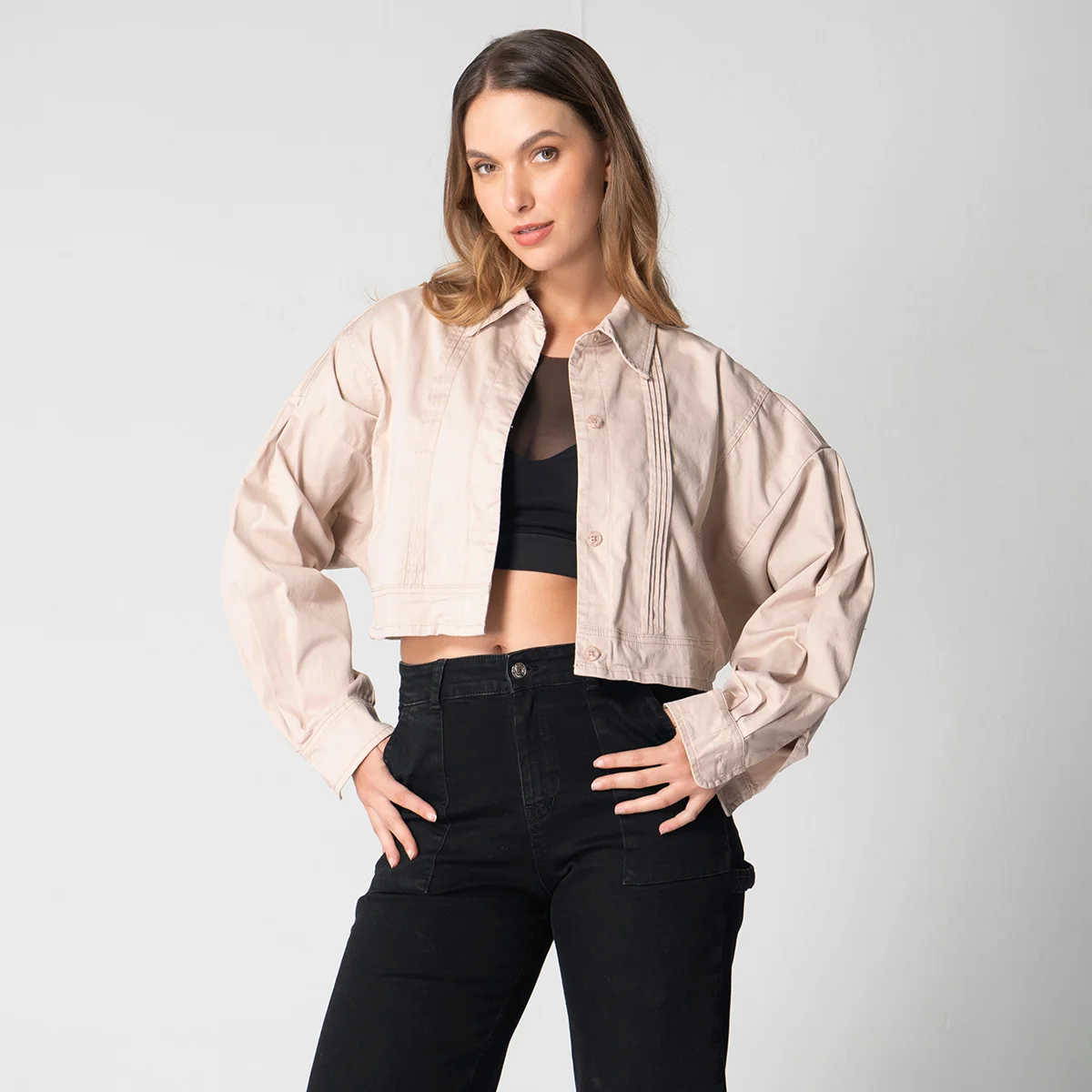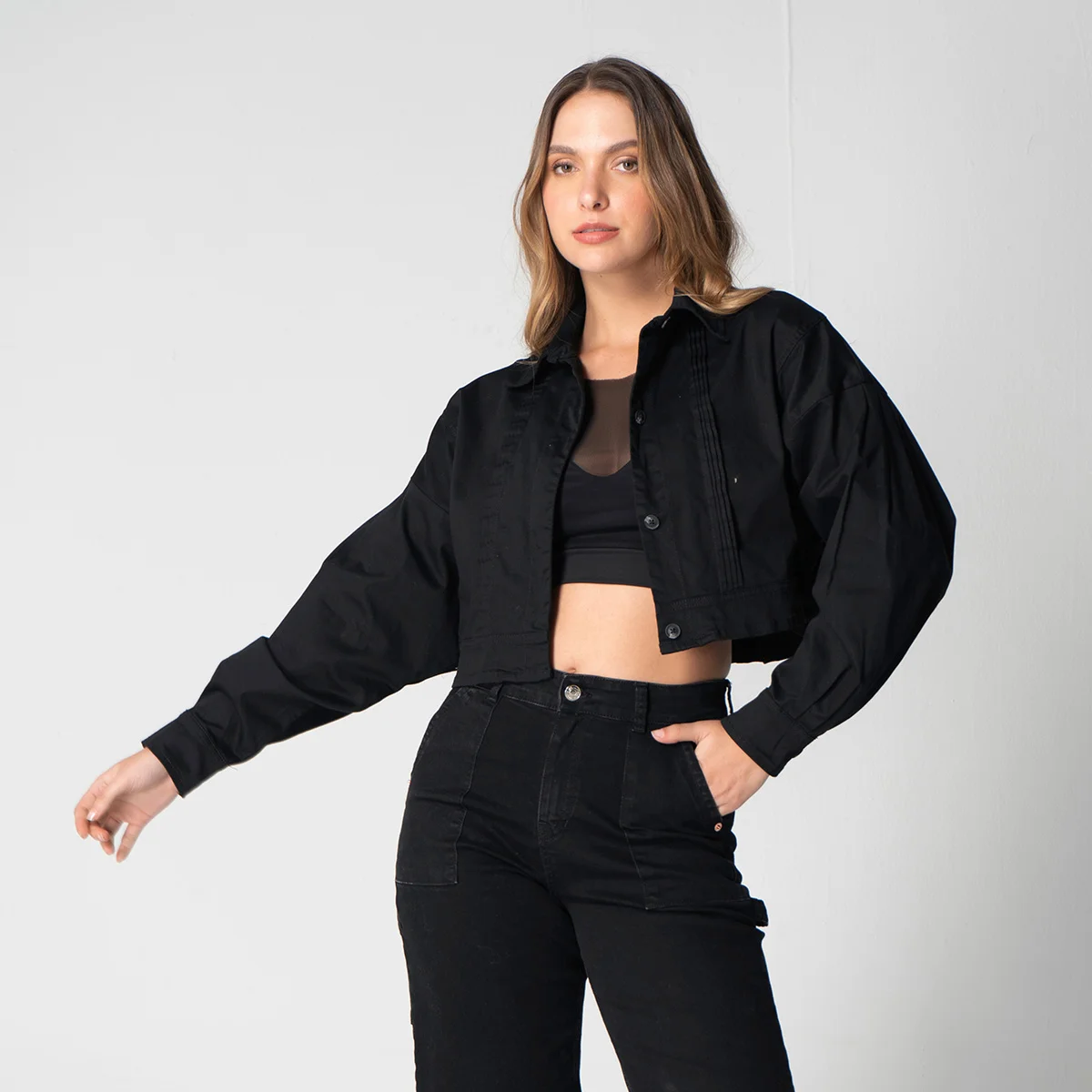 Chaqueta corta tipo torero Magesty, en dril resistente y duradero. Su diseño incluye un cuello camisero que aporta un toque clásico y elegante. Las mangas son largas y presentan una terminación de puño con cierre de botón, lo que añade un ajuste.