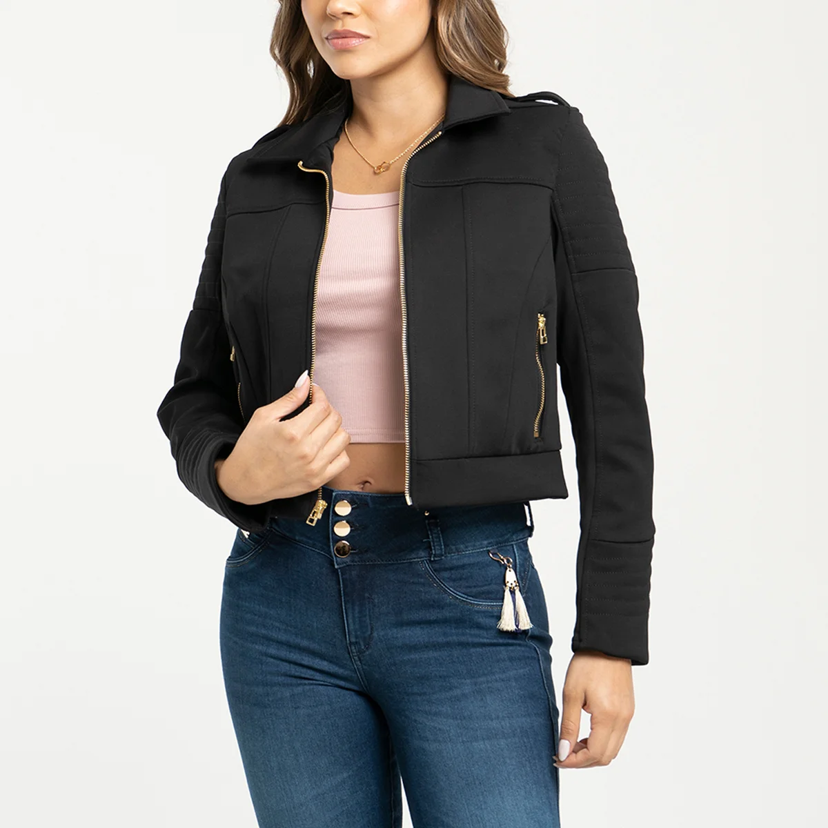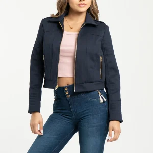Chaqueta Milan, con cuello tipo sport es una opción ideal para cualquier ocasión, mangas largas con cortes bordados, su parte frontal cuenta con cortes de entalle y bolsillos con cierre de cremallera. Su sistema de cierre central es de cremallera, la parte posterior cuenta con corte de entalle y detalle de pretina anatómica bordada que le añade un toque de elegancia.