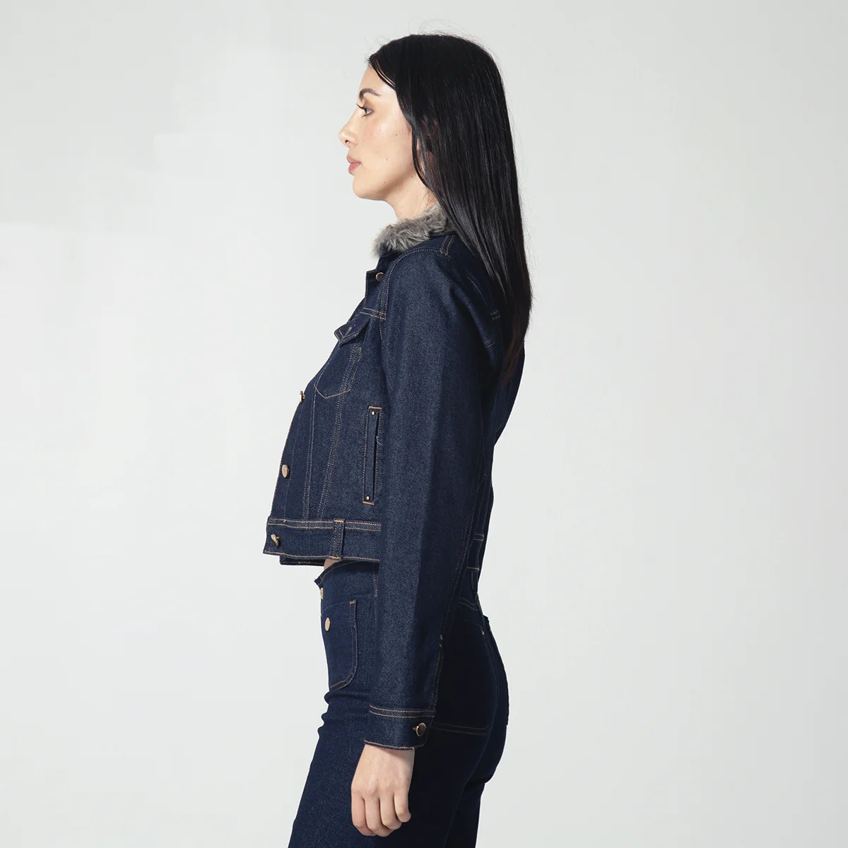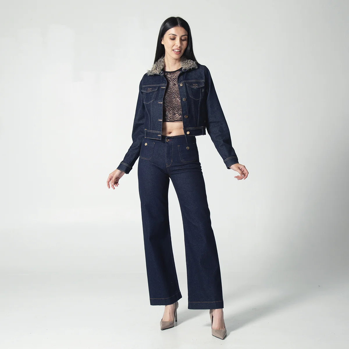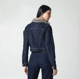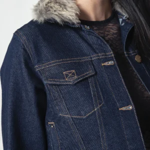 Chaqueta Lavinia en denim de nuestra capsula Raw Denim silueta slim que realza la figura de manera elegante y moderna, Cuenta con un cuello en peluche removible ofreciendo versatilidad y comodidad según la temporada o preferencia, Su sistema de cierre es de botones lo que le aporta un toque clásico y fácil de usar, En la parte frontal dispone de bolsillos tipo parche a la altura del pecho con cierre de tapa ideales para llevar pequeños objetos de forma segura, Además en la parte superior cuenta con bolsillos tipo ribete que complementan el diseño y aportan un estilo casual y sofisticado.