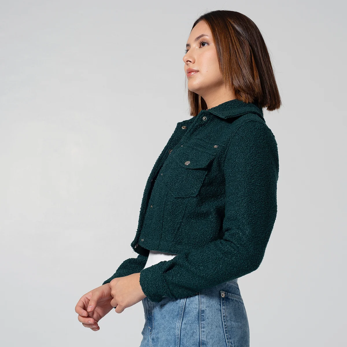Su sistema de cierre frontal se realiza mediante broches en la pechera, además la chaqueta incorpora funcionalidad y estilo con bolsillos con tapa ubicados estratégicamente a la altura del pecho.