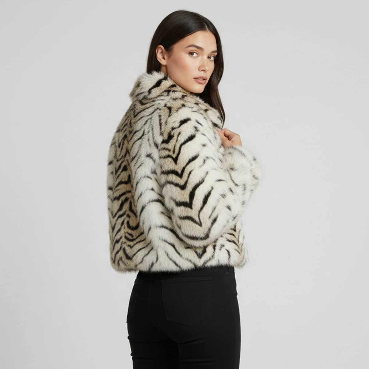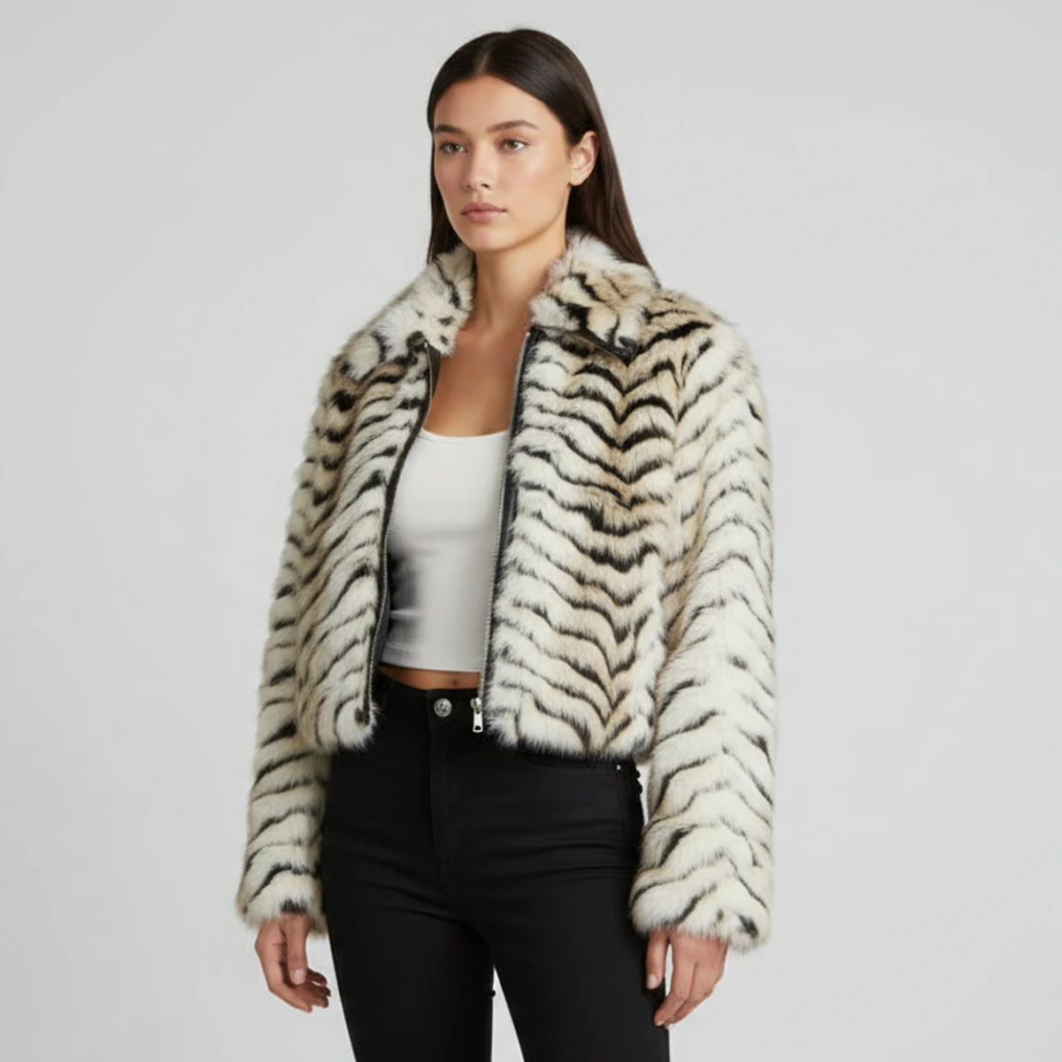Esta chaqueta Tigris de pelo con estampado de tigre es la prenda estrella para quienes buscan un estilo audaz y sofisticado, con un diseño de corte moderno y llamativo patrón de rayas en tonos crema y negro, esta chaqueta animal print ofrece una textura suave de alta calidad que garantiza calidez y confort en climas fríos. Su cierre frontal de cremallera y cuello estructurado la convierten en una pieza versátil ideal tanto para elevar un look casual con jeans negros como para complementar un atuendo de noche elegante, esta chaqueta para mujer añade un toque de lujo urbano a tu armario con este abrigo que combina tendencia, suavidad y un ajuste favorecedor de última moda.