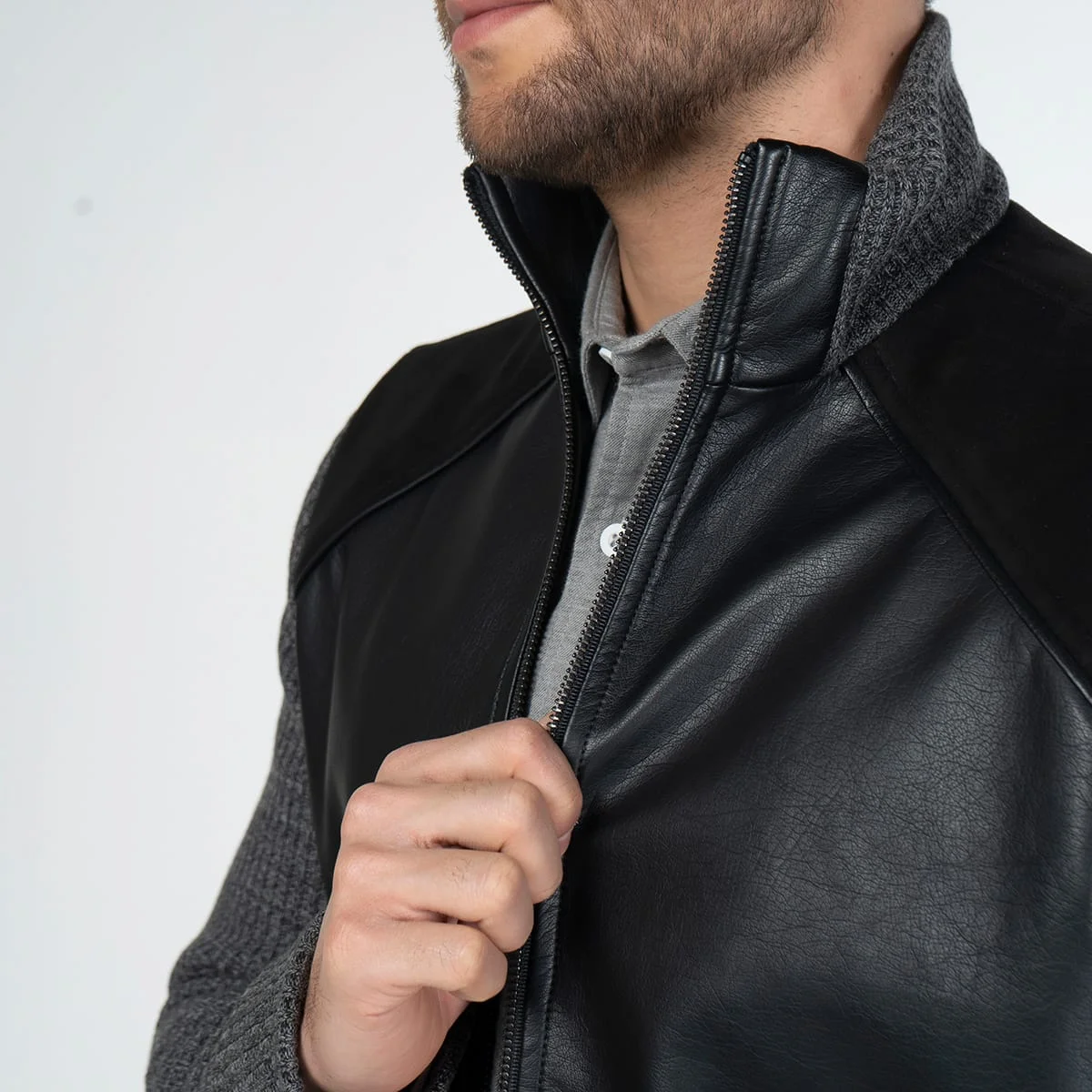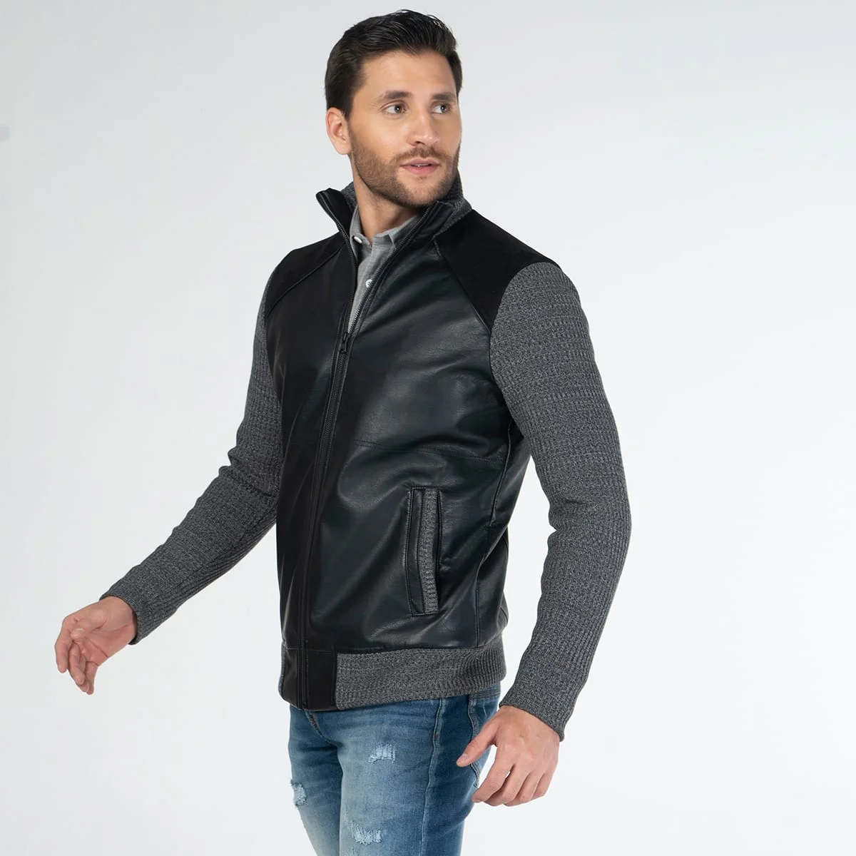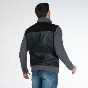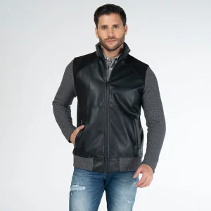Chaqueta Knitt, con cuello alto y manga larga. Su parte frontal es en sintetico al igual que su parte posterior, por costados cuenta con bolsillos tipo ribete con detalle de corte en tejido. Su sistema de cierre frontal es de cremallera. Su posterior cuenta con almilla en contraste de tela y detalle de bordado. Las mangas, pretina y cuello son tejidos