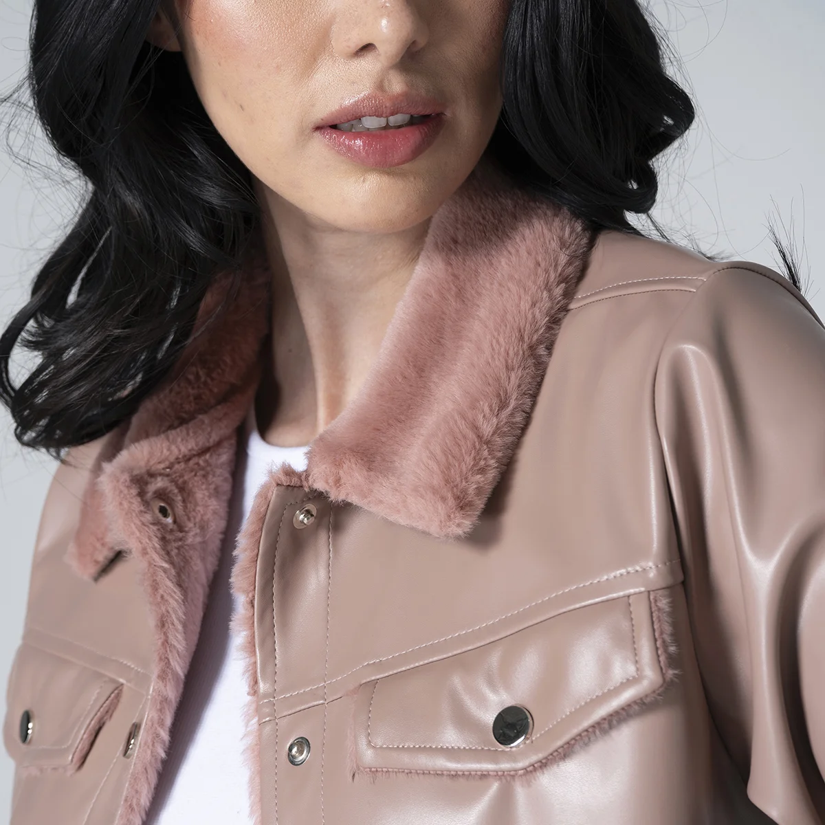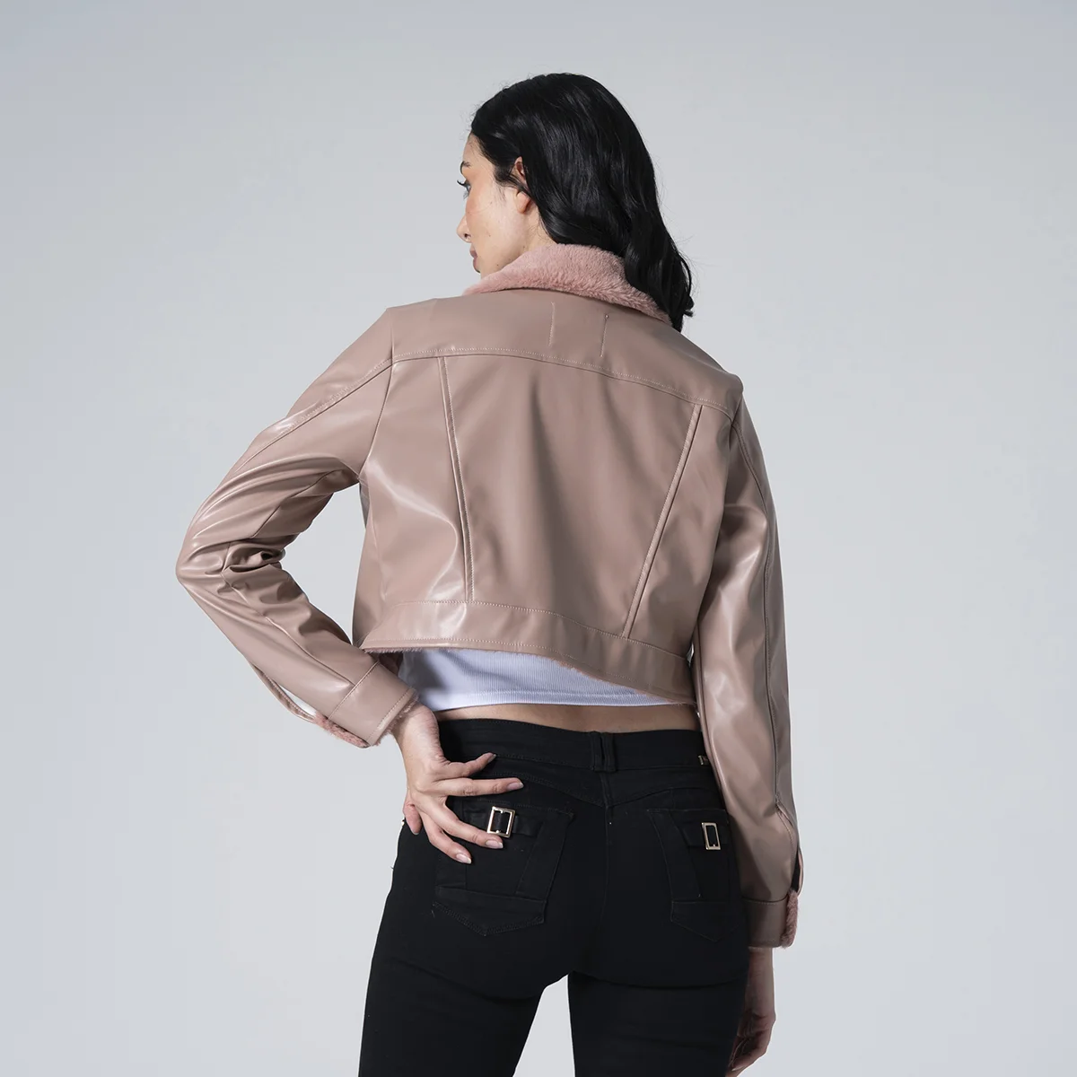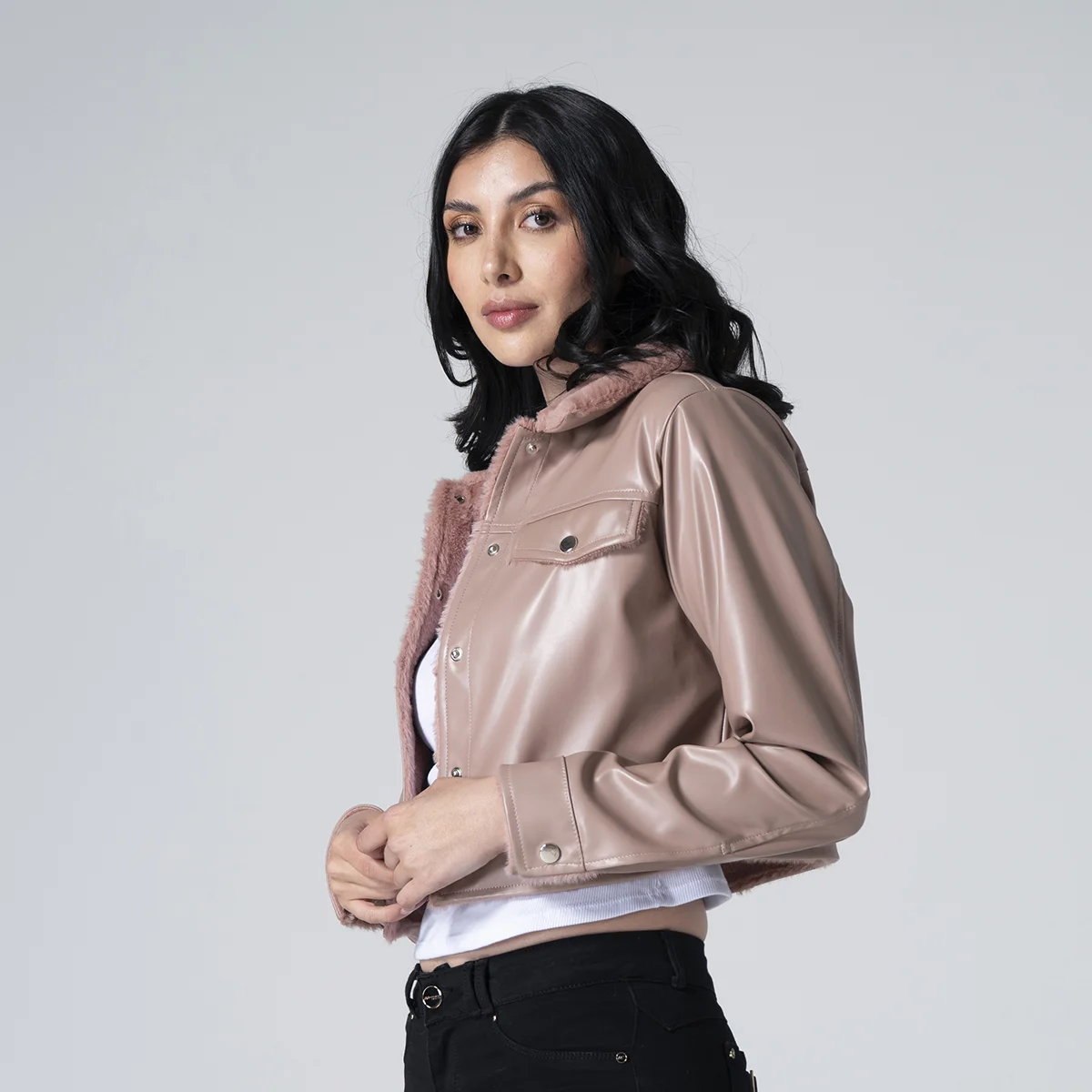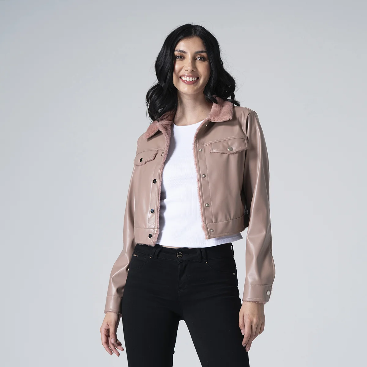 Chaqueta Cellosint en material sintético combina estilo y comodidad, Cuenta con un cuello sport adornado con peluche que aporta un toque acogedor y moderno, Tiene mangas largas terminadas en puños para mayor confort y facilidad de ajuste, En la parte frontal presenta bolsillos decorativos tipo parche con cierre de tapa agregando un detalle de diseño práctico y atractivo, esta chaqueta para mujer es ideal para un look casual y actual.