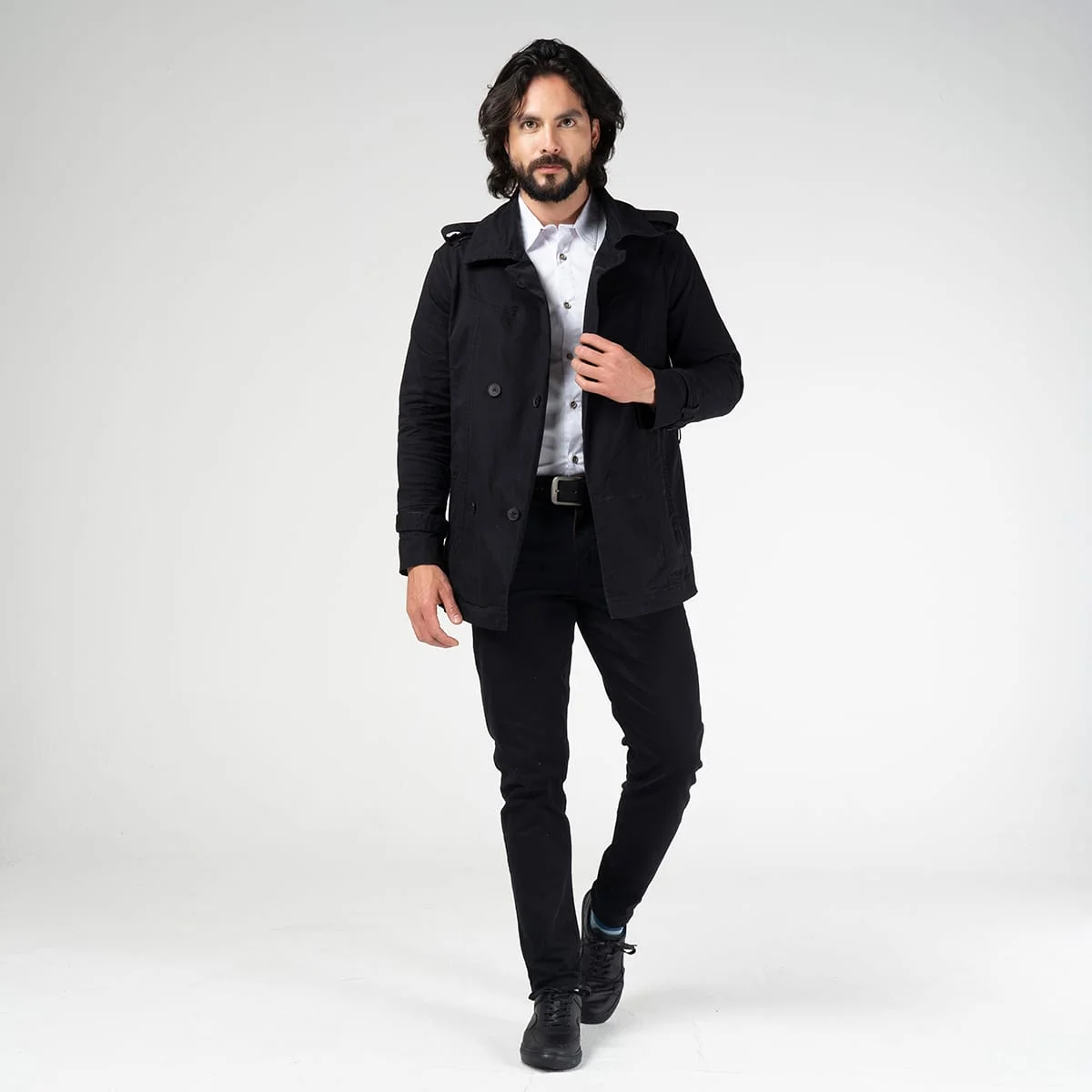 Los cortes en la parte frontal y los bolsillos laterales le dan un toque moderno a esta prenda clásica, y su cierre frontal con botonadura tipo solapa con cruce le añade un toque de estilo adicional. Además, los hombros con detalle de charretera fija y el cinturón removible para ajuste de cintura le dan un acabado impecable.