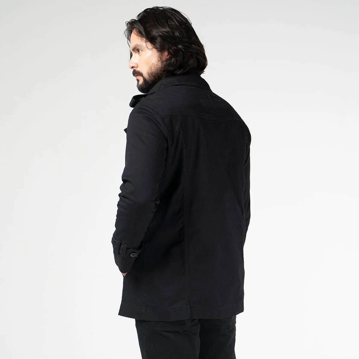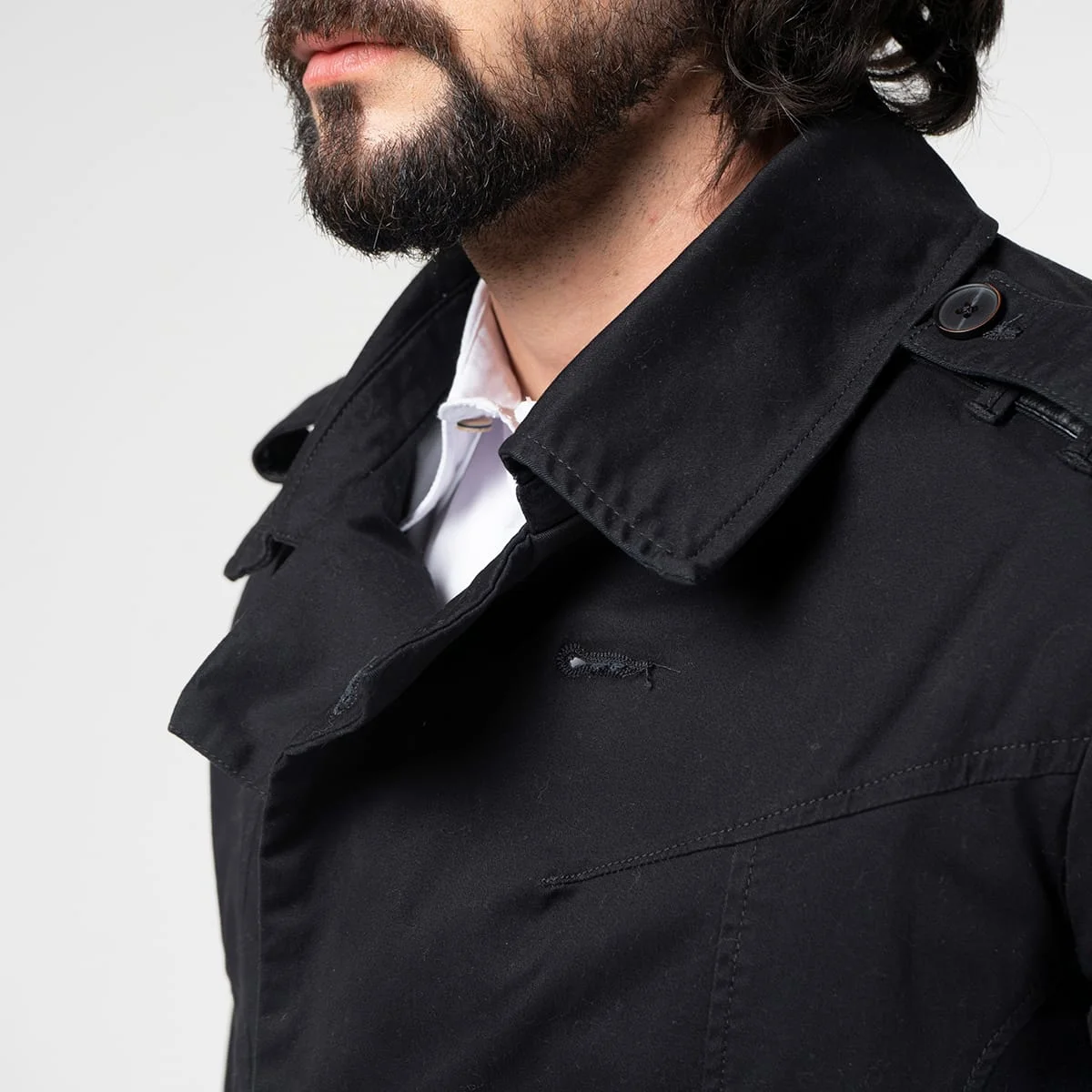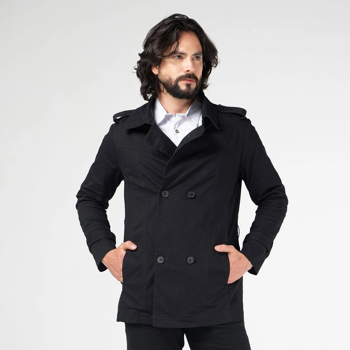 Chaqueta Trench prime en dril, su silueta regular se adapta a diferentes tipos de cuerpo, mientras que su cuello solapa y manga larga con detalle de charretera en los puños agregan un toque de sofisticación.