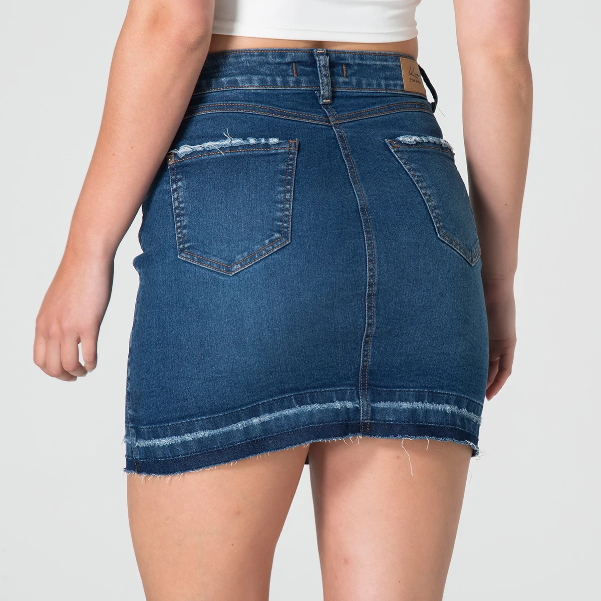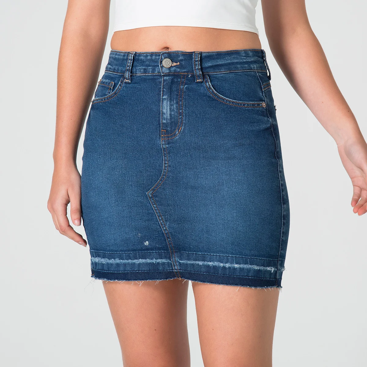 Falda corta Tego en denim es una prenda versátil y de estilo desenfadado, ideal para un look casual. Diseñada con una pretina que se ajusta cómodamente con un botón y un cierre de cremallera, ofrece un buen calce y facilidad al vestir.